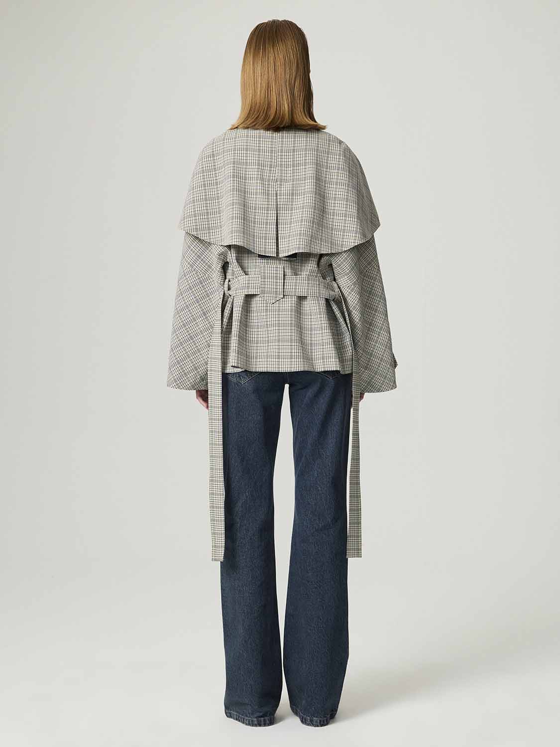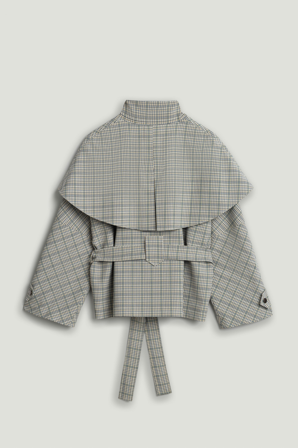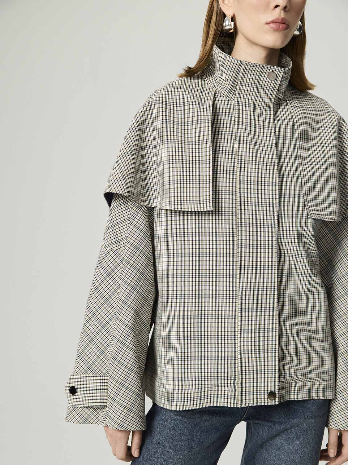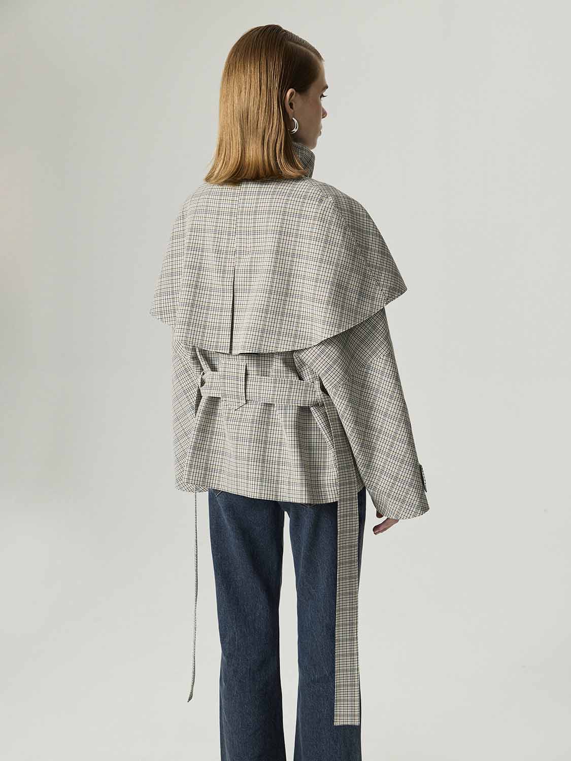 Klasik kareli kumaştan üretilen bu kemerli pelerin ceket ile dış giyim koleksiyonunuza sofistike bir dokunuş katın. Yapılı huni yaka, omuzda pelerin ve gizli ön kapama ile tasarlanan bu parça, zamansız dikim anlayışını modern zarafetle birleştiriyor. Çıkarılabilir kemer, beli sararak hoş bir silüet sunarken, şeritli manşetler ve arka yırtmaçlı pile, konfor ve hareket kabiliyeti sağlıyor. Sonbahar ve kış aylarında üst üste giymek için ideal olan bu ceket, hem ofis görünümlerine hem de günlük sokak stillerine şıklık katıyor.