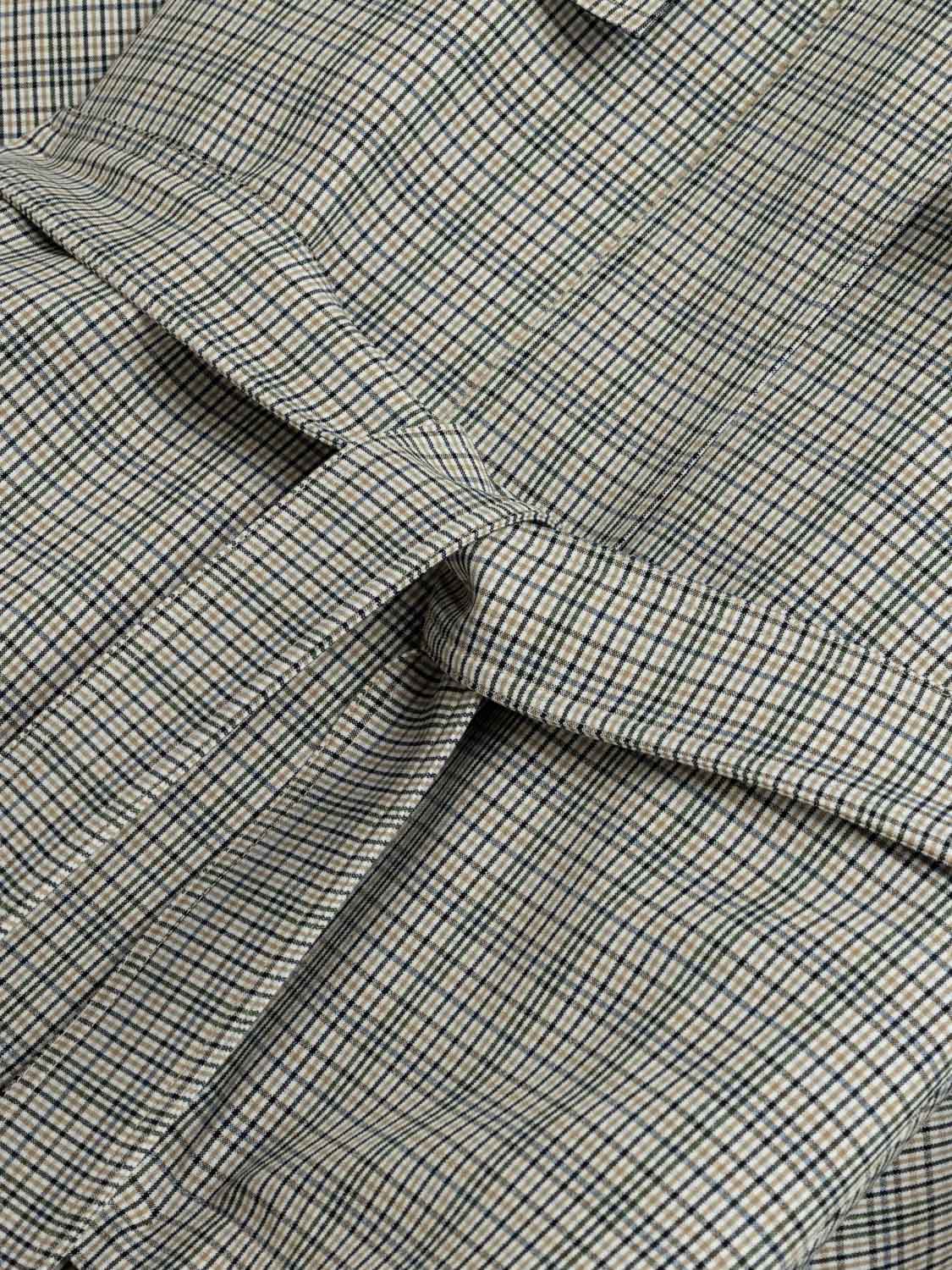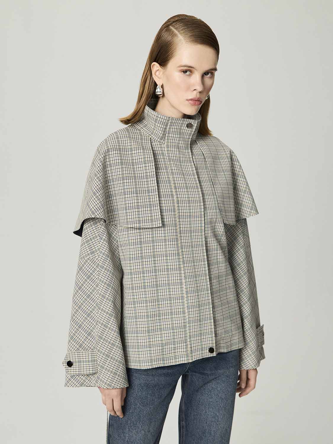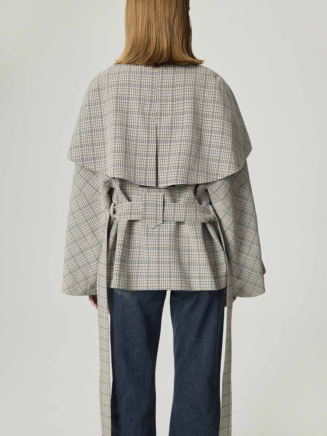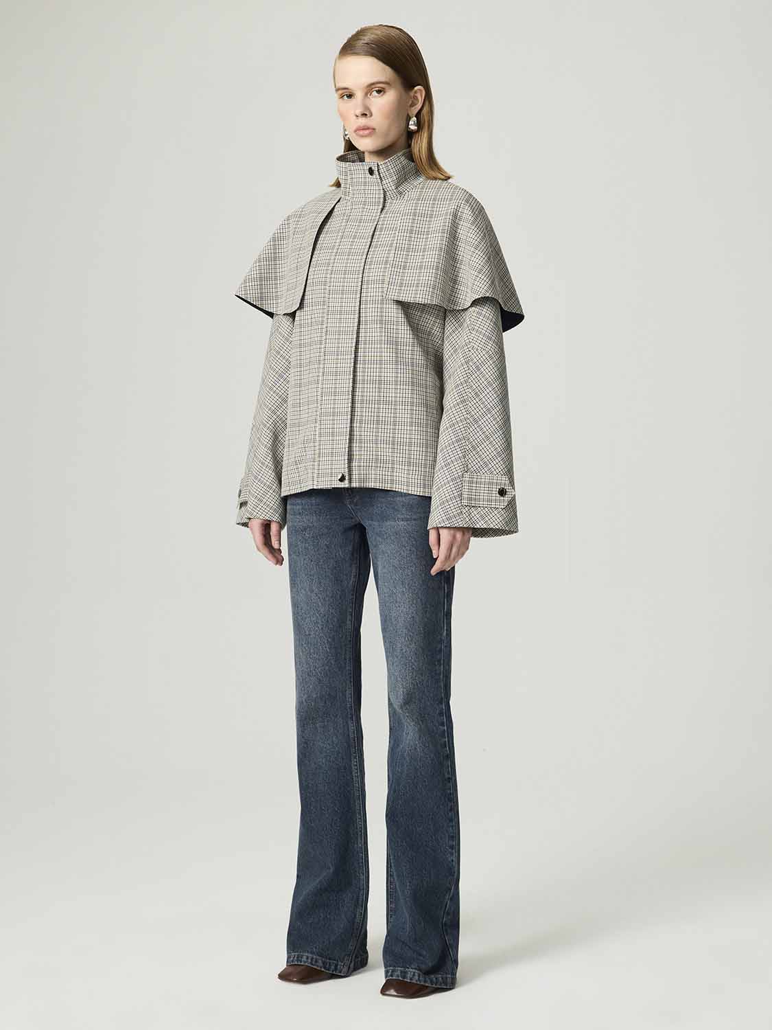 Klasik kareli kumaştan üretilen bu kemerli pelerin ceket ile dış giyim koleksiyonunuza sofistike bir dokunuş katın. Yapılı huni yaka, omuzda pelerin ve gizli ön kapama ile tasarlanan bu parça, zamansız dikim anlayışını modern zarafetle birleştiriyor. Çıkarılabilir kemer, beli sararak hoş bir silüet sunarken, şeritli manşetler ve arka yırtmaçlı pile, konfor ve hareket kabiliyeti sağlıyor. Sonbahar ve kış aylarında üst üste giymek için ideal olan bu ceket, hem ofis görünümlerine hem de günlük sokak stillerine şıklık katıyor.