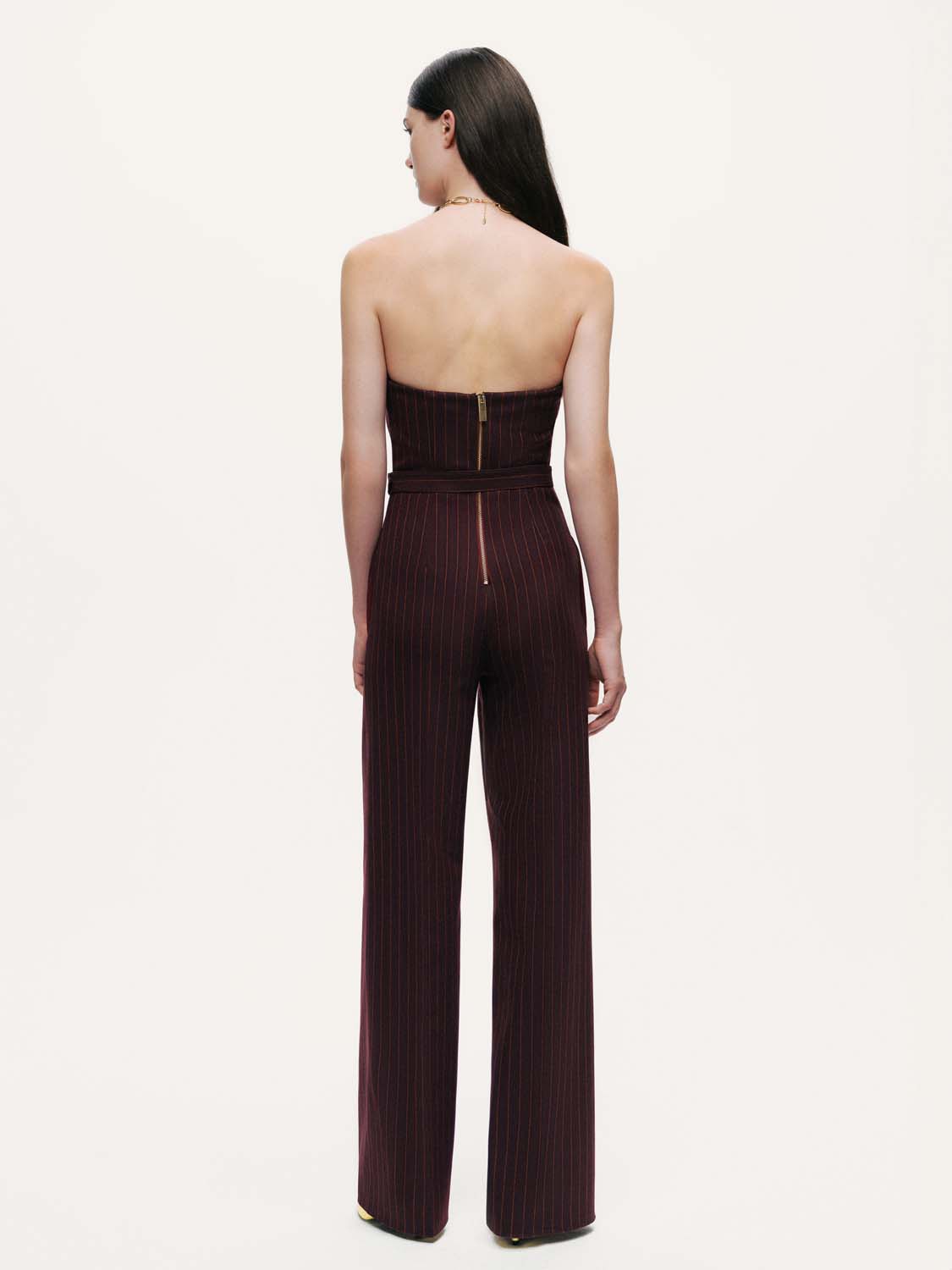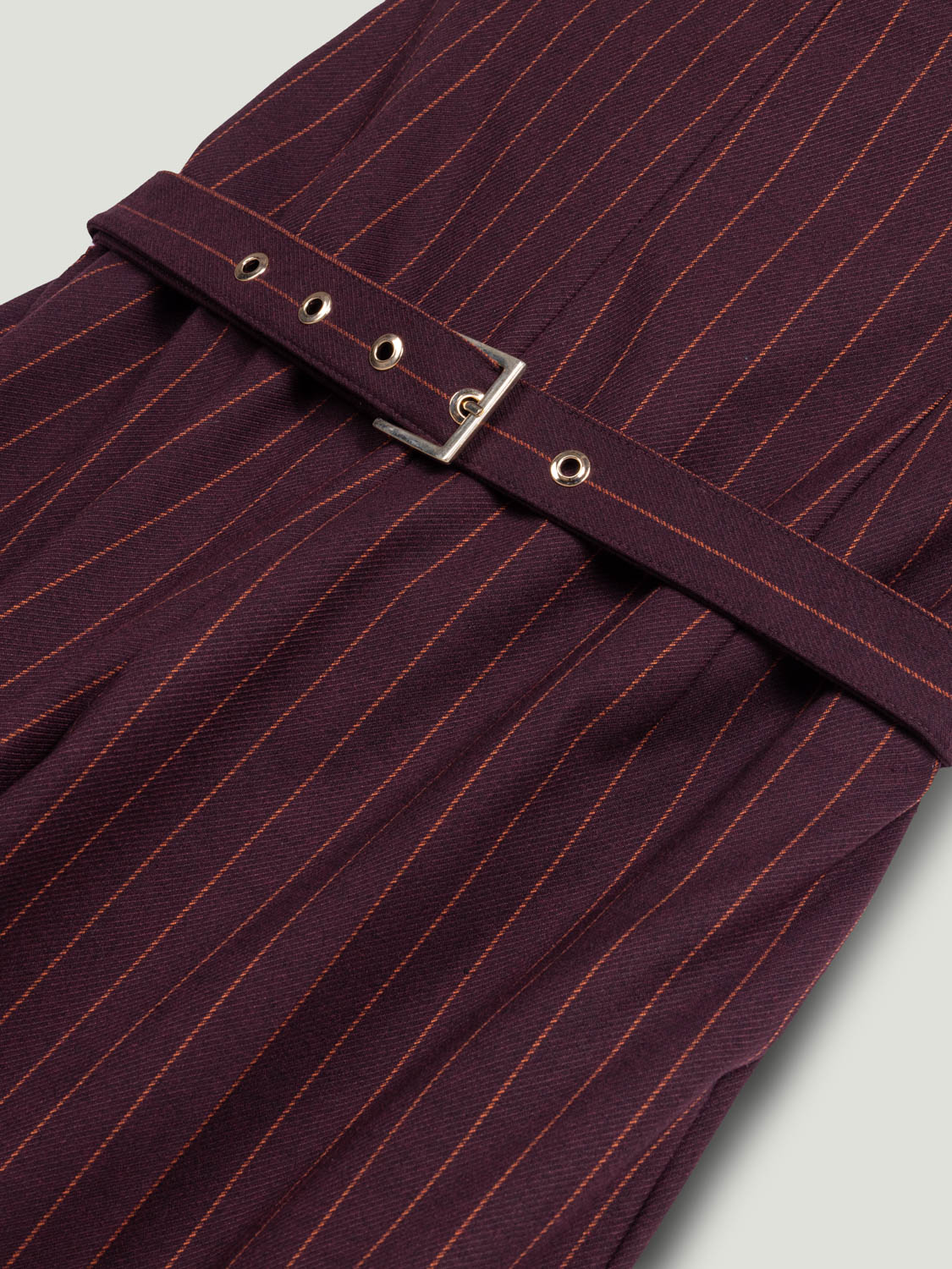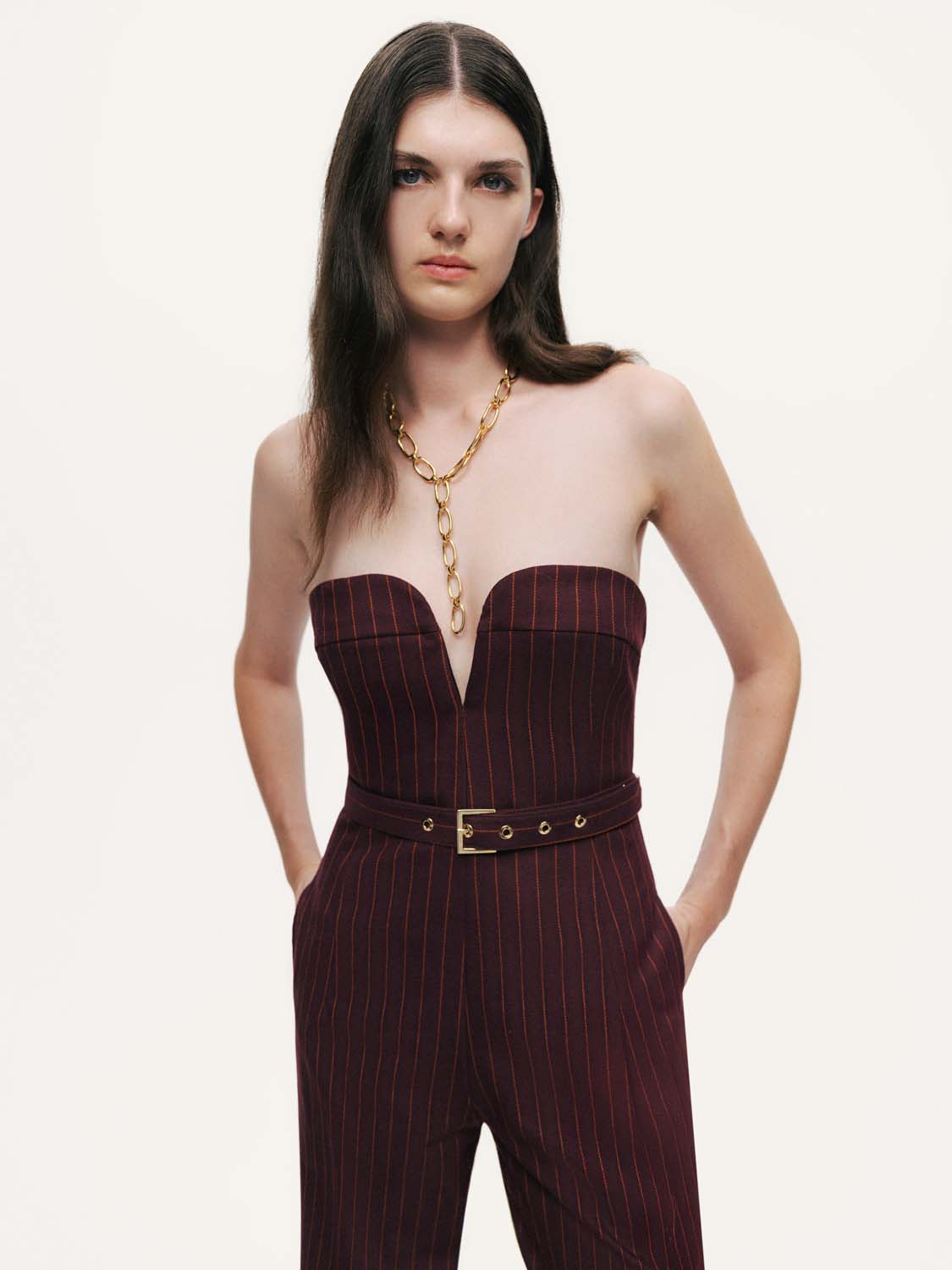 Regular fit ve tam kalıp tasarımıyla zarif bir siluet sunan bu çizgili tulum, modern çizgileri feminen detaylarla bir araya getiriyor. Astarsız dokuma yapısı hafif ve rahat bir kullanım sağlarken, kolsuz ve straplez kalp yaka tasarımı romantik bir zarafet katıyor. Metal fermuar kapaması tuluma modern bir bitiş kazandırırken, kemer detayı bel hattını vurgulayarak daha belirgin bir görünüm yaratıyor. Çizgili dokusu ise parçaya ritmik, şehirli ve sofistike bir hava ekliyor. Hem özel davetlerde hem de iddialı günlük stillerde kolayca öne çıkan, etkileyici bir parça.