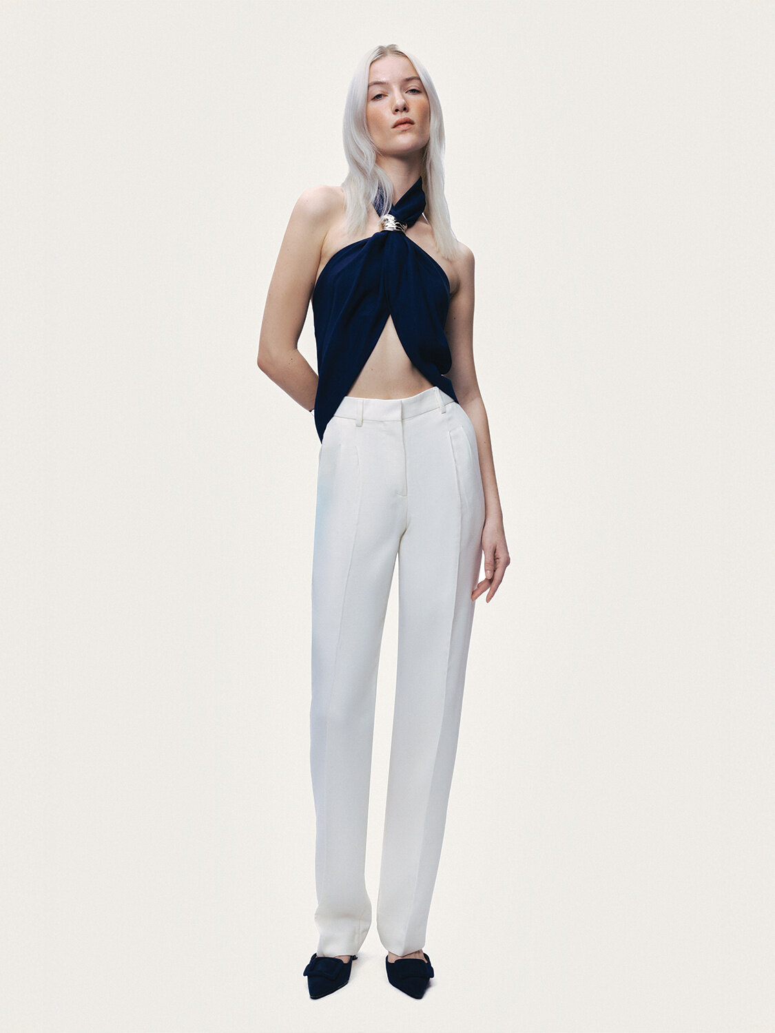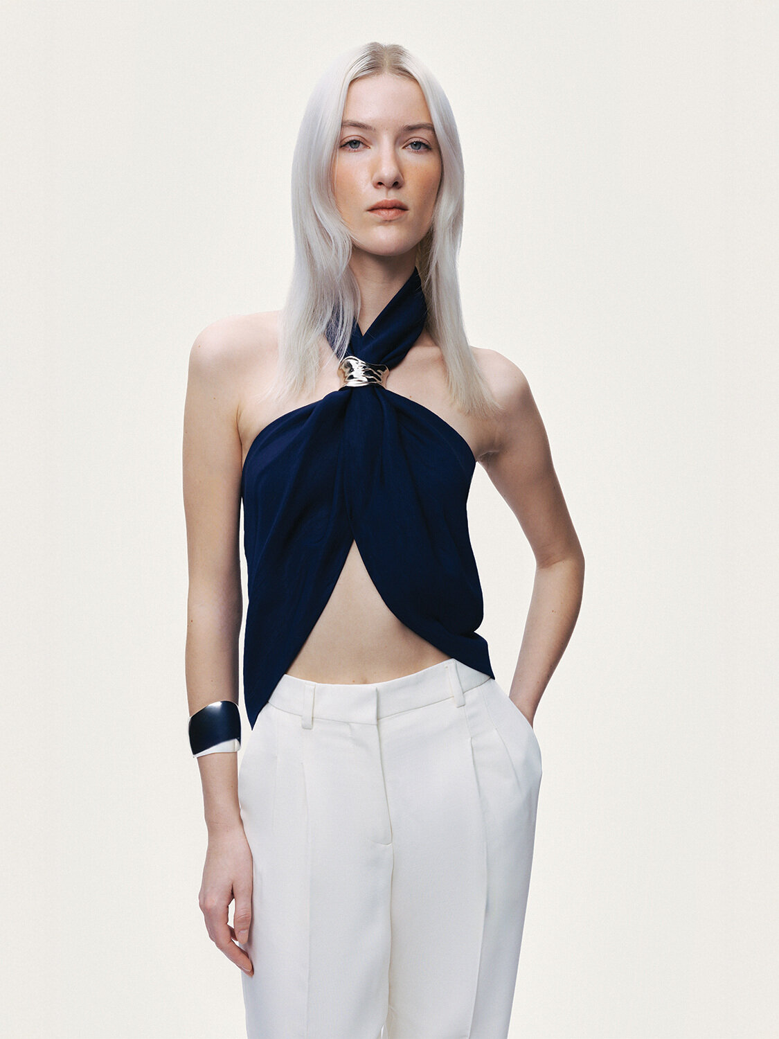 Regular fit kesimiyle vücuda konforlu bir şekilde oturan bu büstiyer, astarsız dokuma yapısıyla hafif ve rahat bir kullanım sunar. Kolsuz tasarımı ve sırt dekoltesi feminen bir duruş kazandırırken, boyundan bağlama detayı modele zarif ve şık bir hareket katar. Çıtçıt kapaması sayesinde pratik bir kullanım sağlayan bu parça, günlük kombinlerden özel akşam stillerine kadar sofistike ve dikkat çekici bir görünüm yaratmak isteyenler için ideal bir seçimdir.