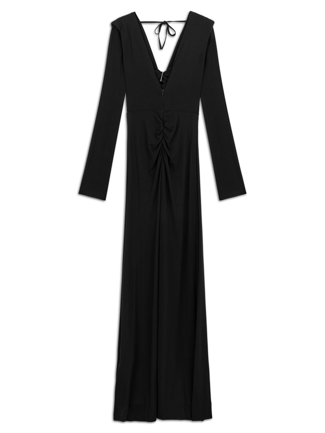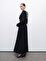 Ürün Açıklaması: Regular fit, tam kalıp, astarsız, örme, arkadan gizli fermuar kapamalı, uzun kollu, degaje yaka, vatkalı, enseden ip bağlamalı, önü pileli, arkası büzgülü, dekoltesi aksesuar detaylı maxi boy elbise