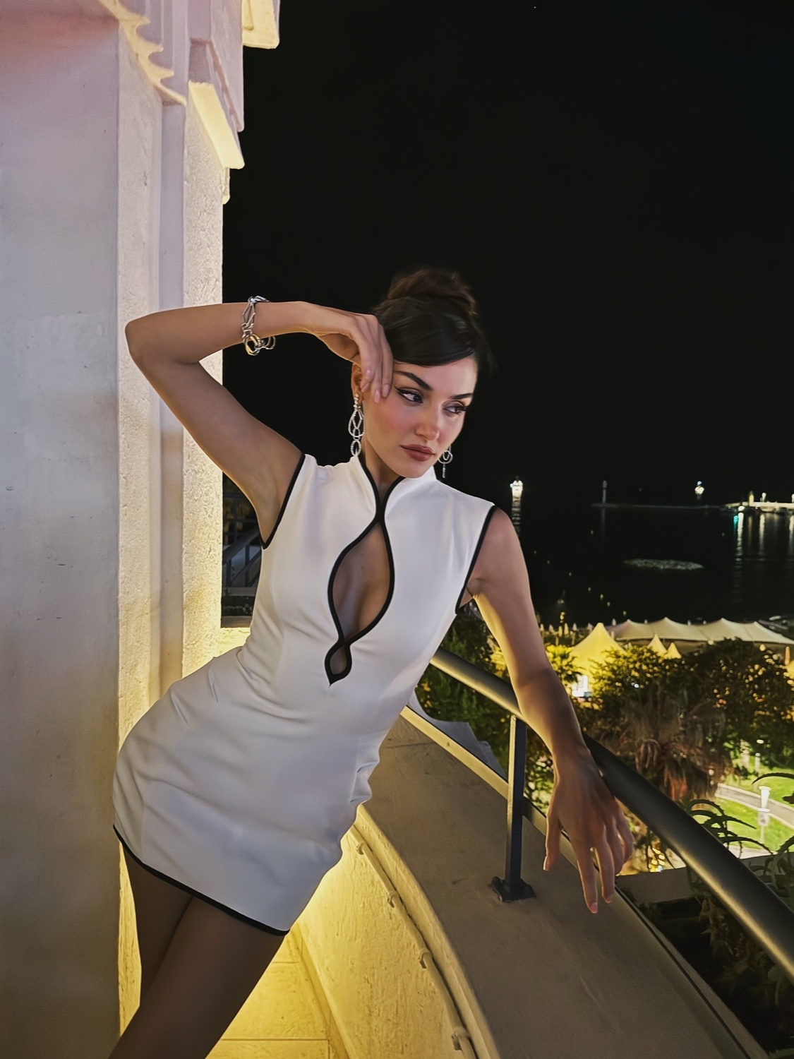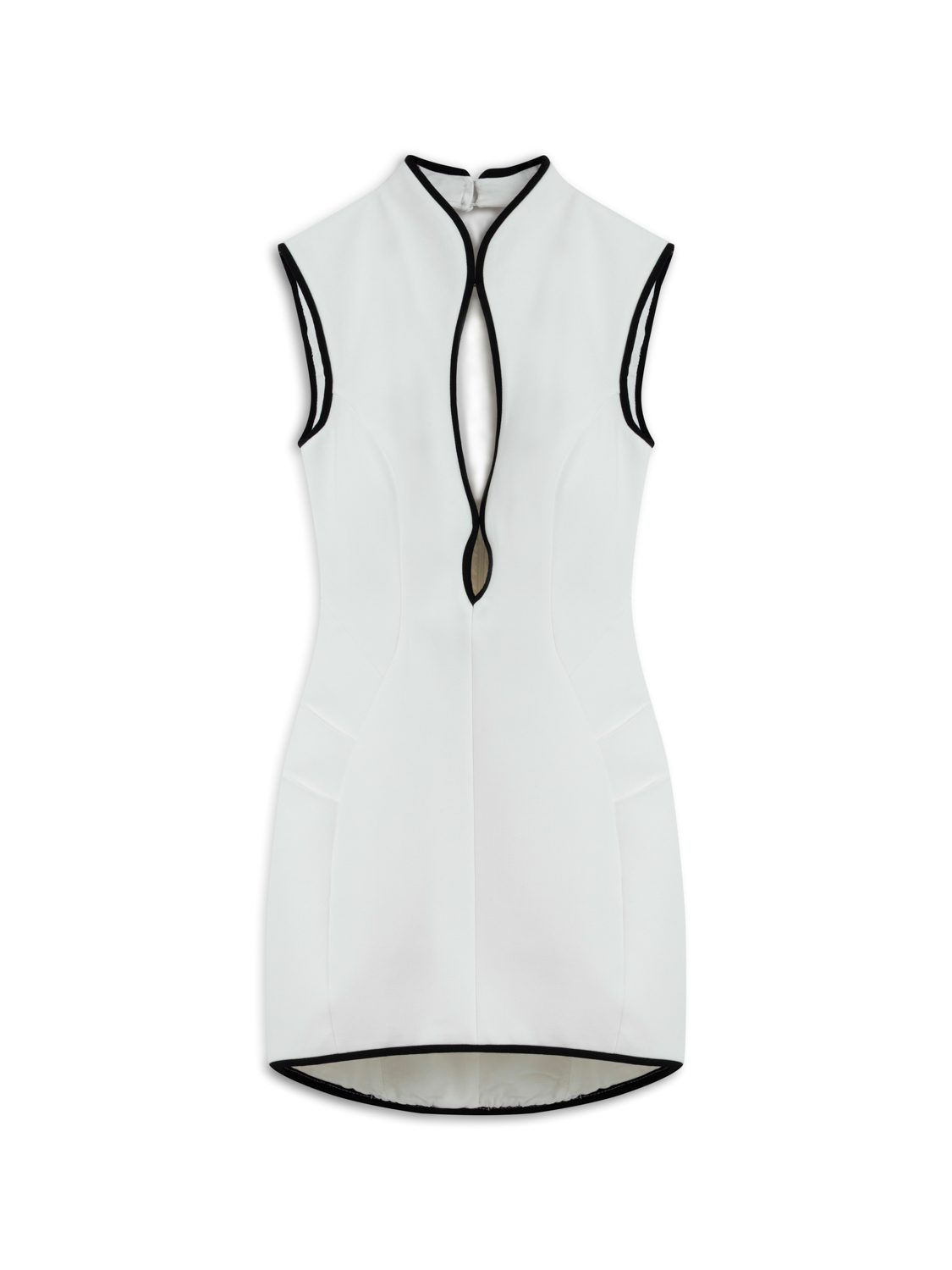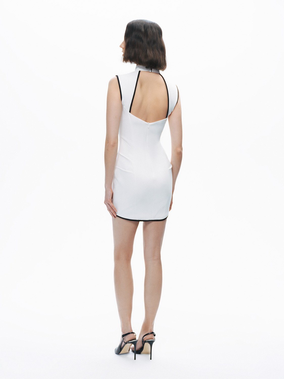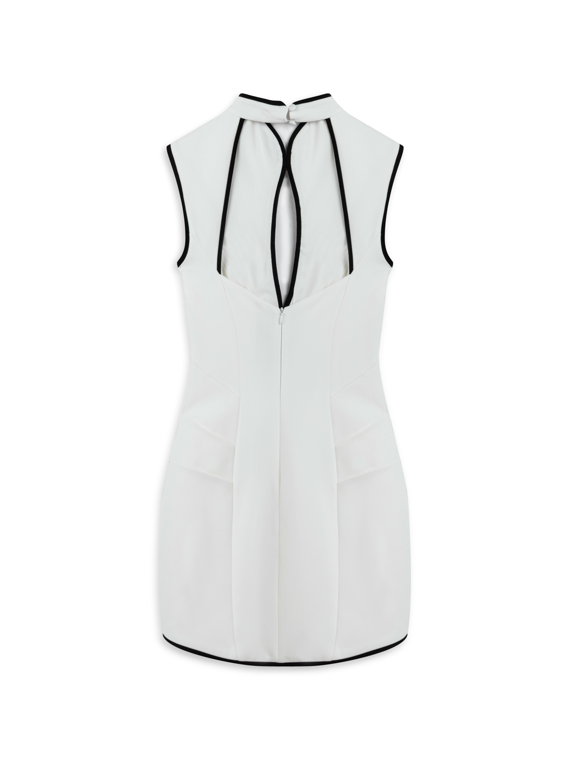 Ürün Açıklaması: Slim fit, tam kalıp, astarsız, dokuma, kolsuz, arkadan gizli fermuar kapamalı ve boyundan düğme kapamalı, dik yaka, kontrast biyeli, ön ve arka dekolte detaylı, japon kesim mini boy elbise
