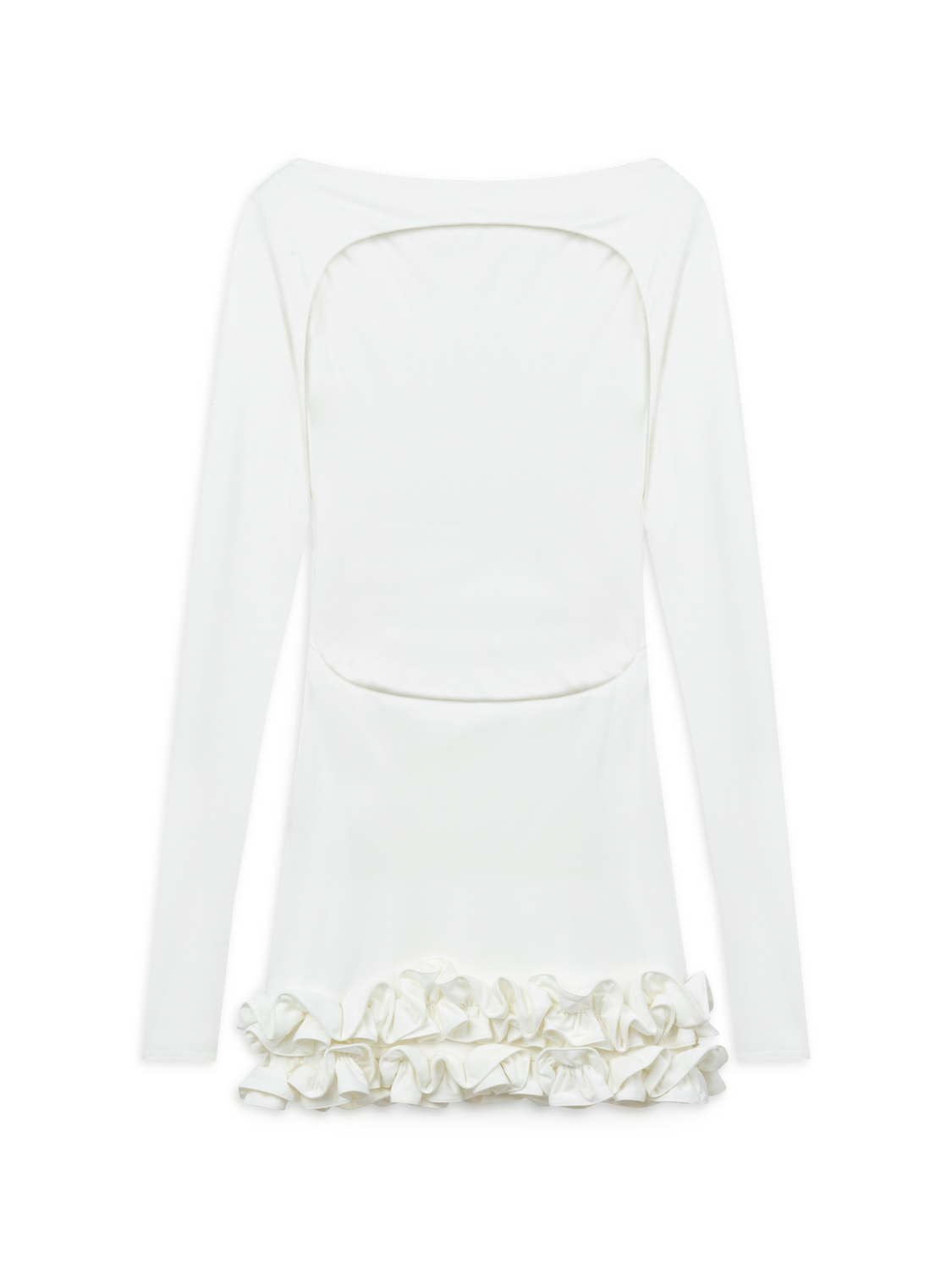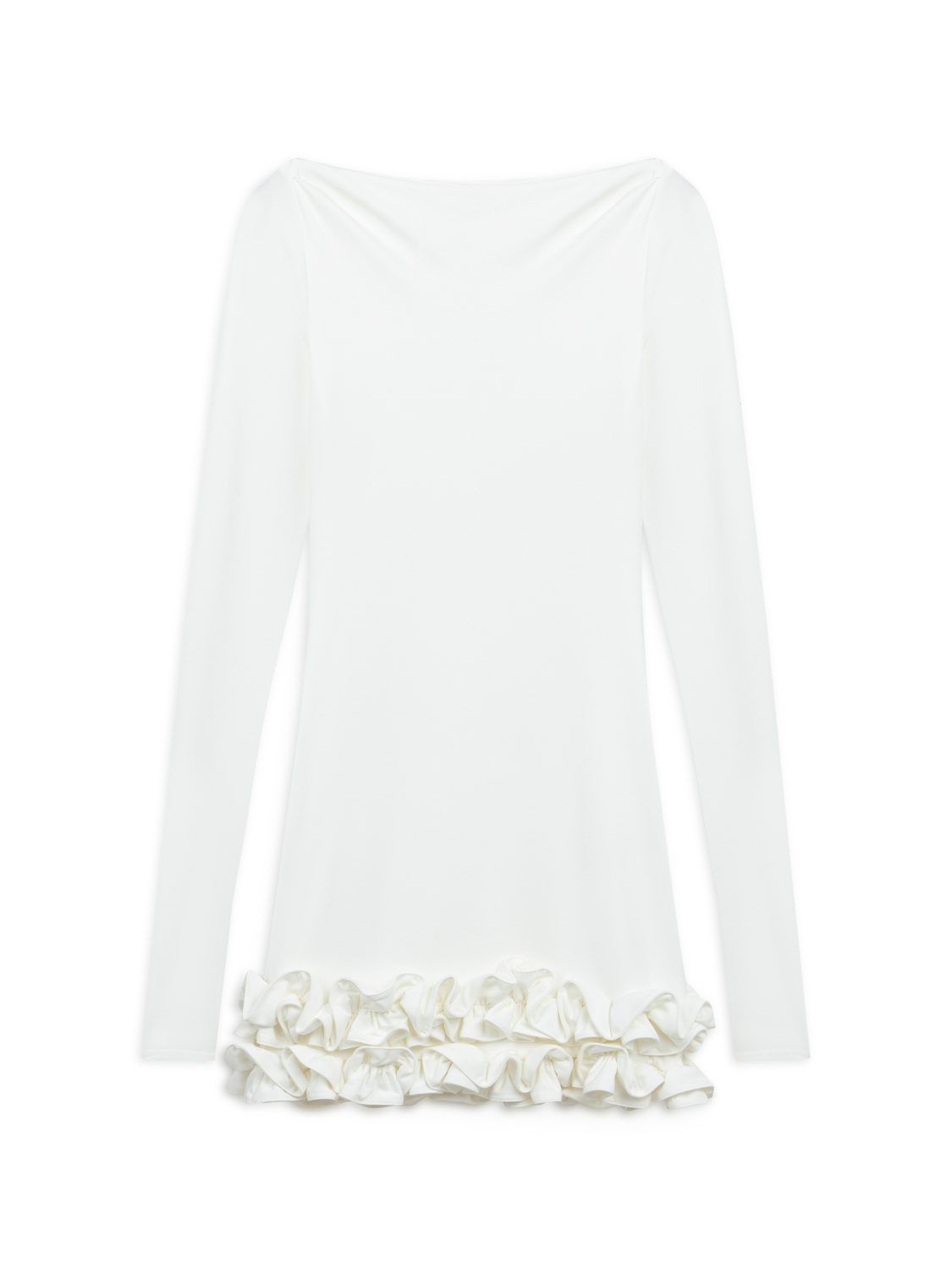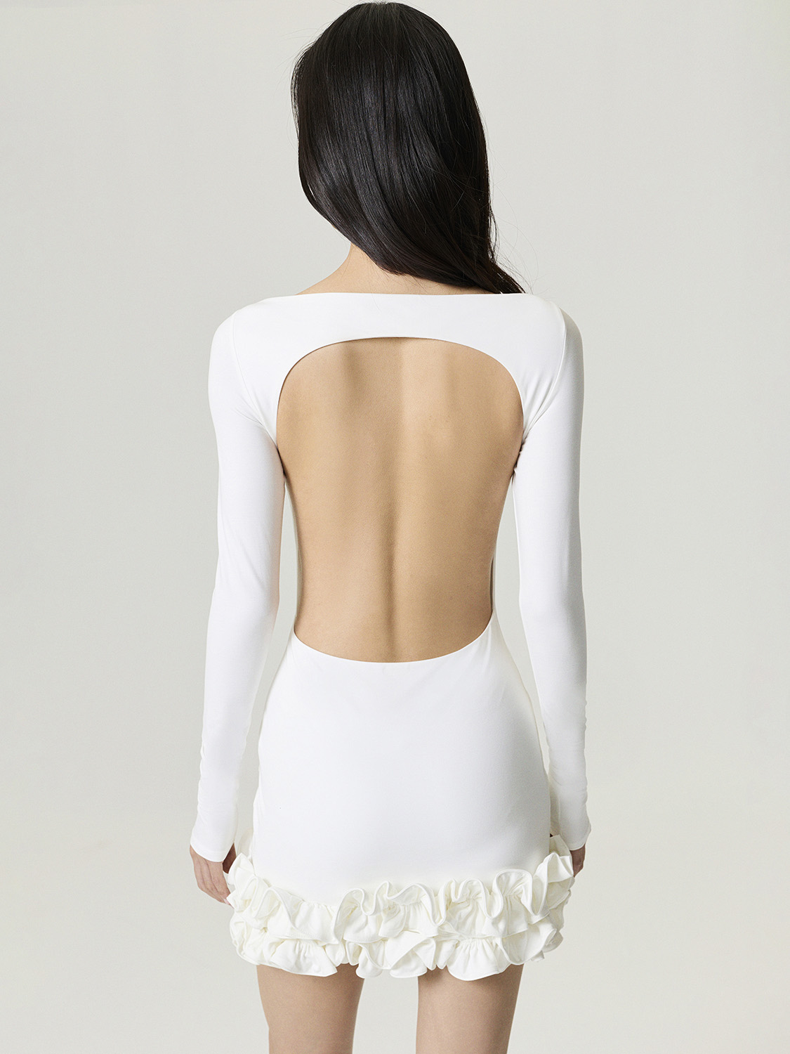 Ürün Açıklaması: Slim fit, tam kalıp, astarsız, örme, uzun kollu, kayık yaka, derin sırt dekolteli, etek ucu fırfır detaylı jarse mini boy elbise