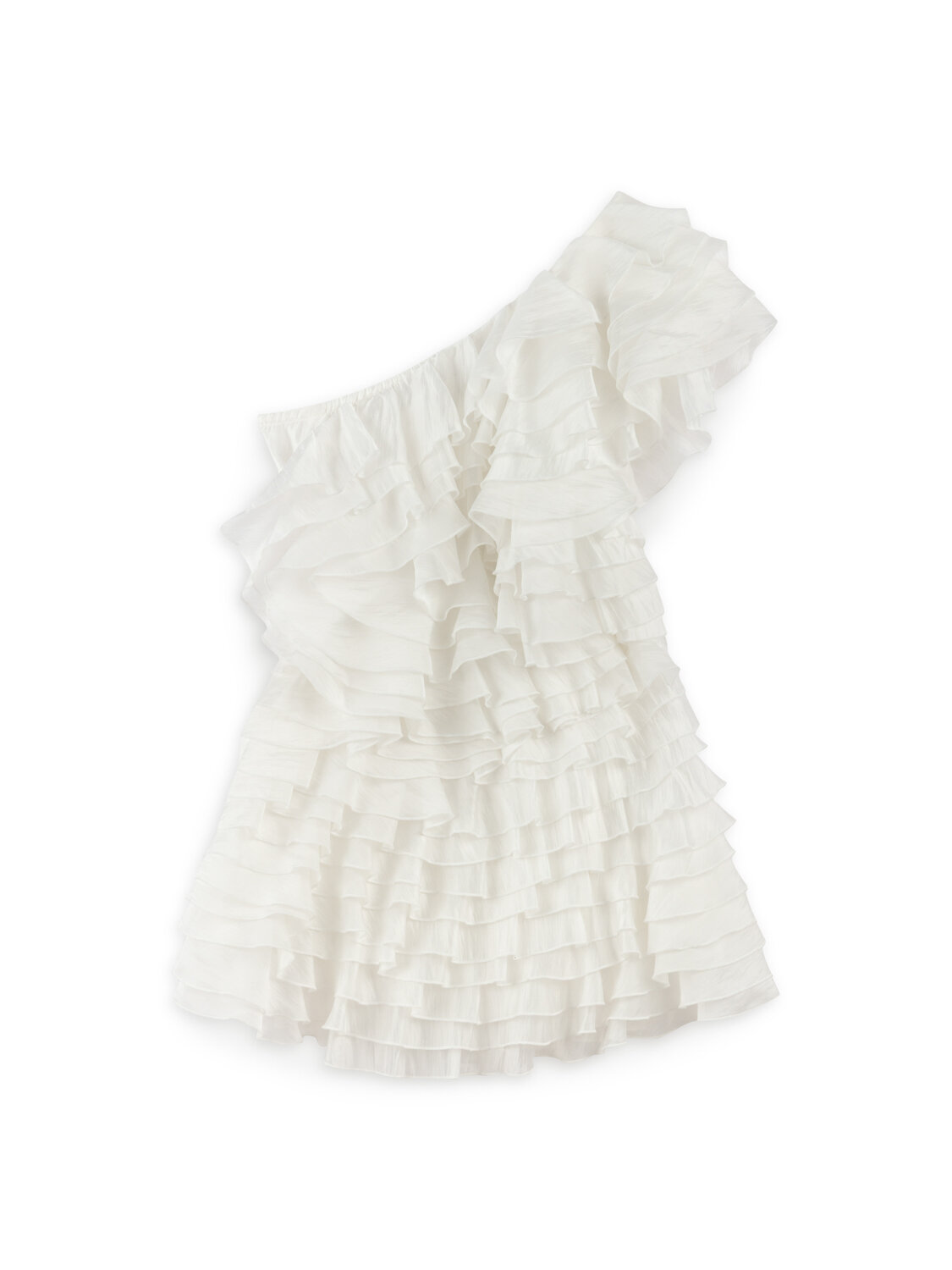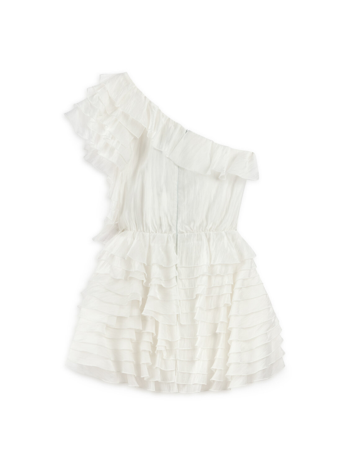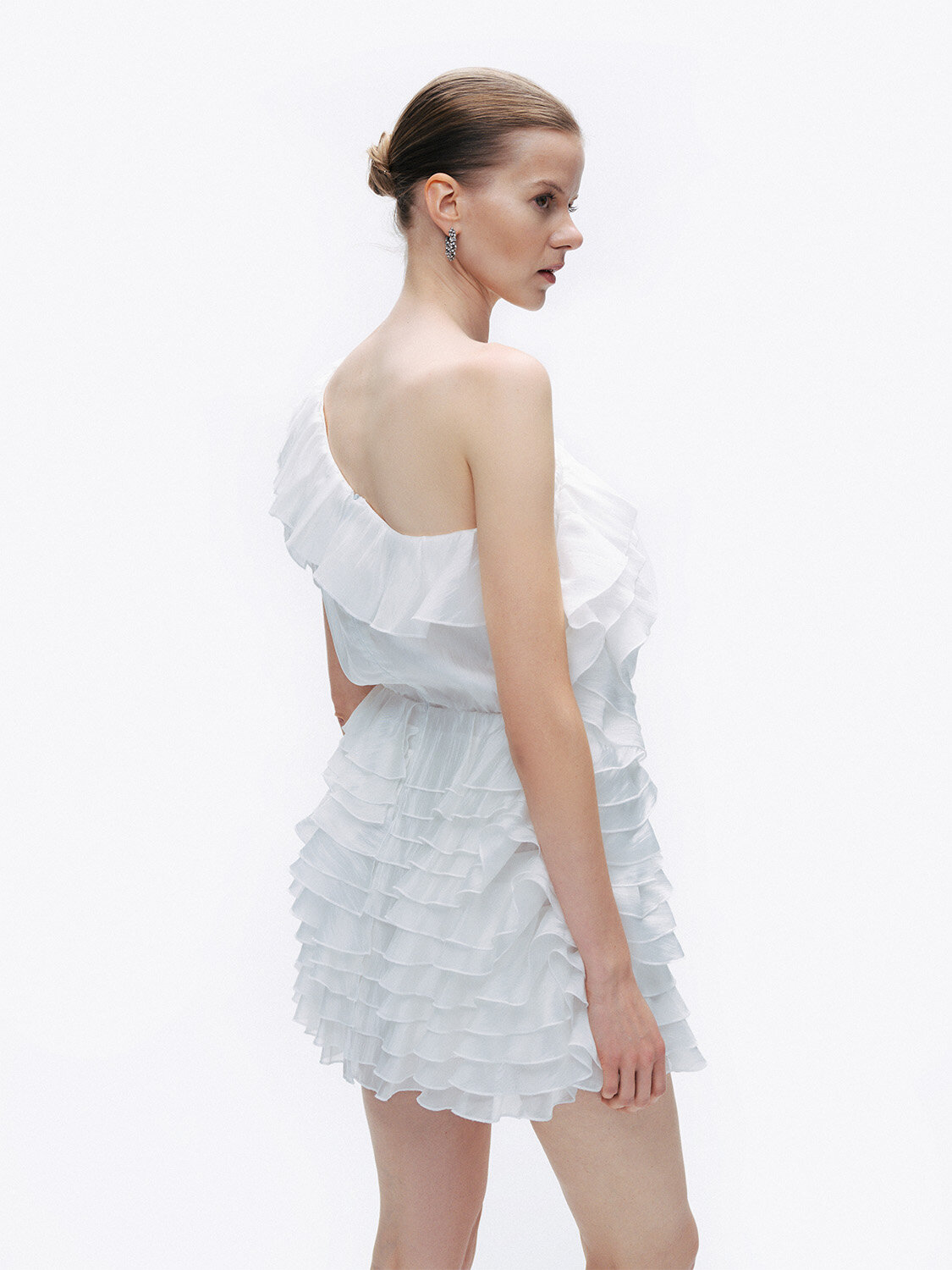 Ürün Açıklaması: Regular fit, tam kalıp, astarlı, dokuma, tek kol, gizli fermuar kapamalı, asimetrik yaka, katlı fırfır detaylı mini boy elbise