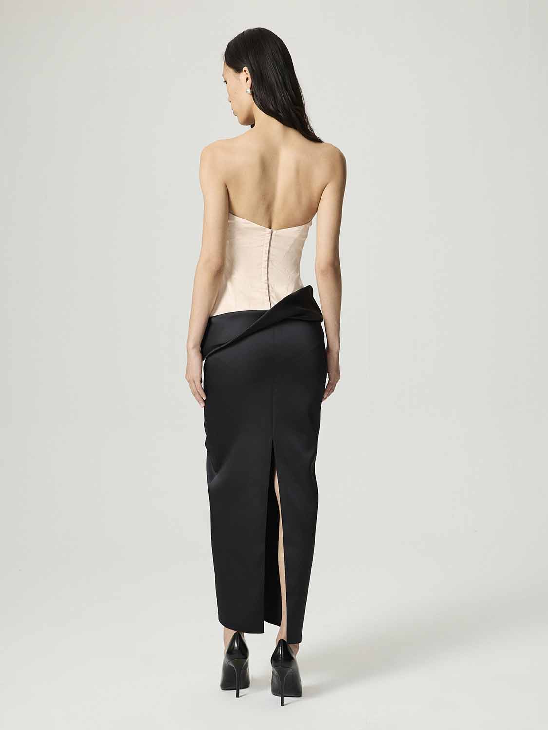 Feminen çizgileri öne çıkaran bu drape detaylı elbise, zarif ve sofistike bir siluet sunuyor. Slim fit kesimi ve tam kalıbı, vücuda kusursuzca oturarak hatları zarifçe vurgularken, korsaj detayı silueti şekillendiriyor. Kalp yaka ve kolsuz tasarımı feminen bir zarafet kazandırırken, arkadaki yırtmaç modern bir çekicilik katıyor. Agraf kapaması ve drape detaylarıyla öne çıkan bu dokuma elbise, astarsız yapısı sayesinde hafif ve rahat bir kullanım sağlıyor. Özel davetlerden akşam kombinlerine kadar her ortamda dikkat çeken bir şıklık sunan bu parça, gardırobunuzun başyapıtlarından biri olmaya aday.