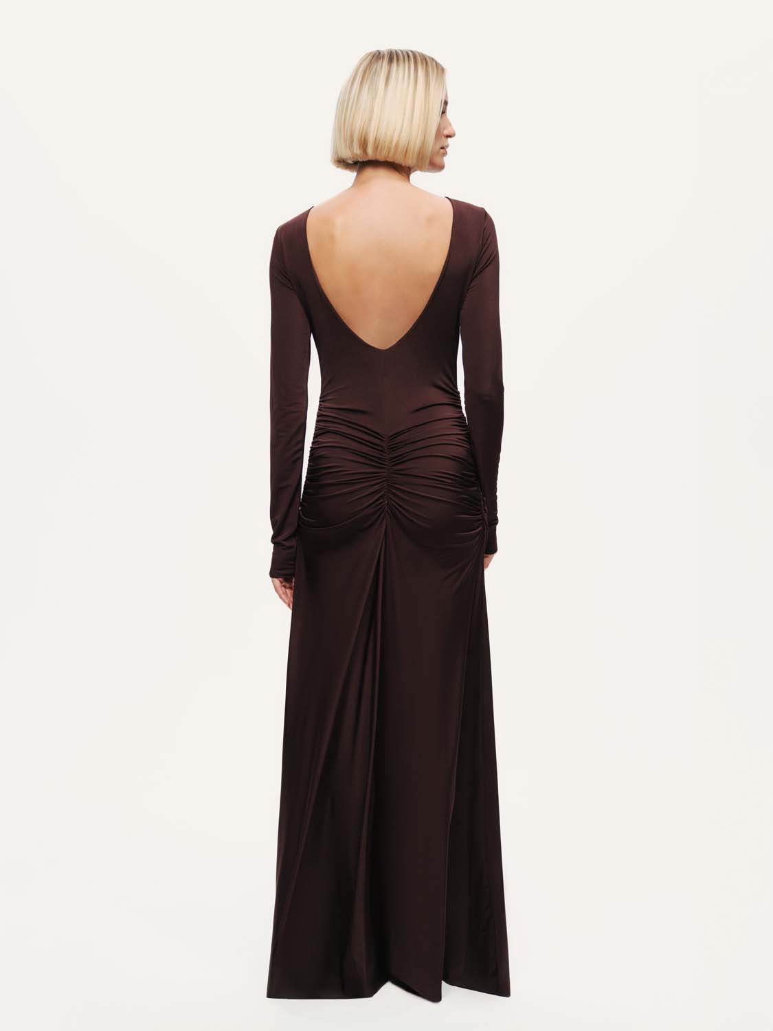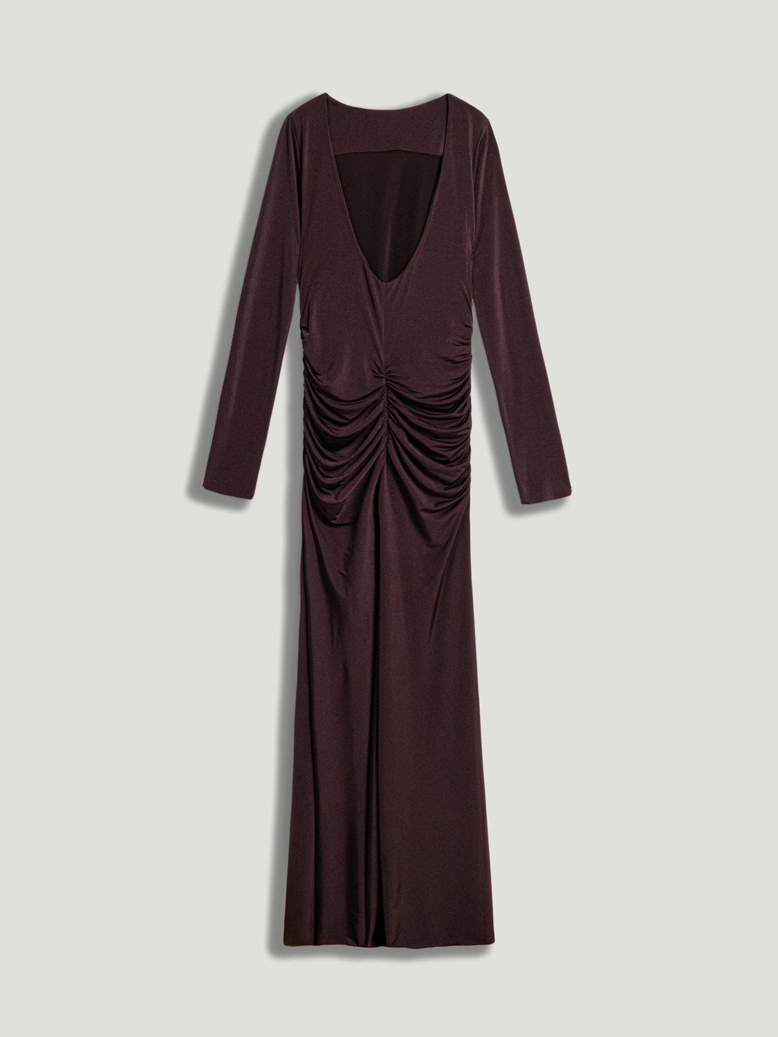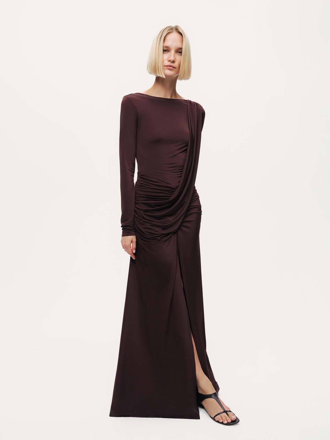 Ürün Açıklaması: Slim fit, tam kalıp, astarsız, örme, uzun kollu, sıfır yaka, sırt dekolteli, drapeli ve yırtmaçlı maxi boy elbise