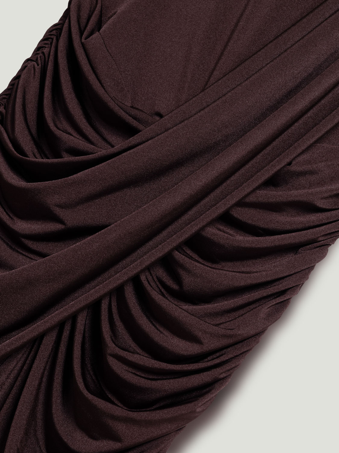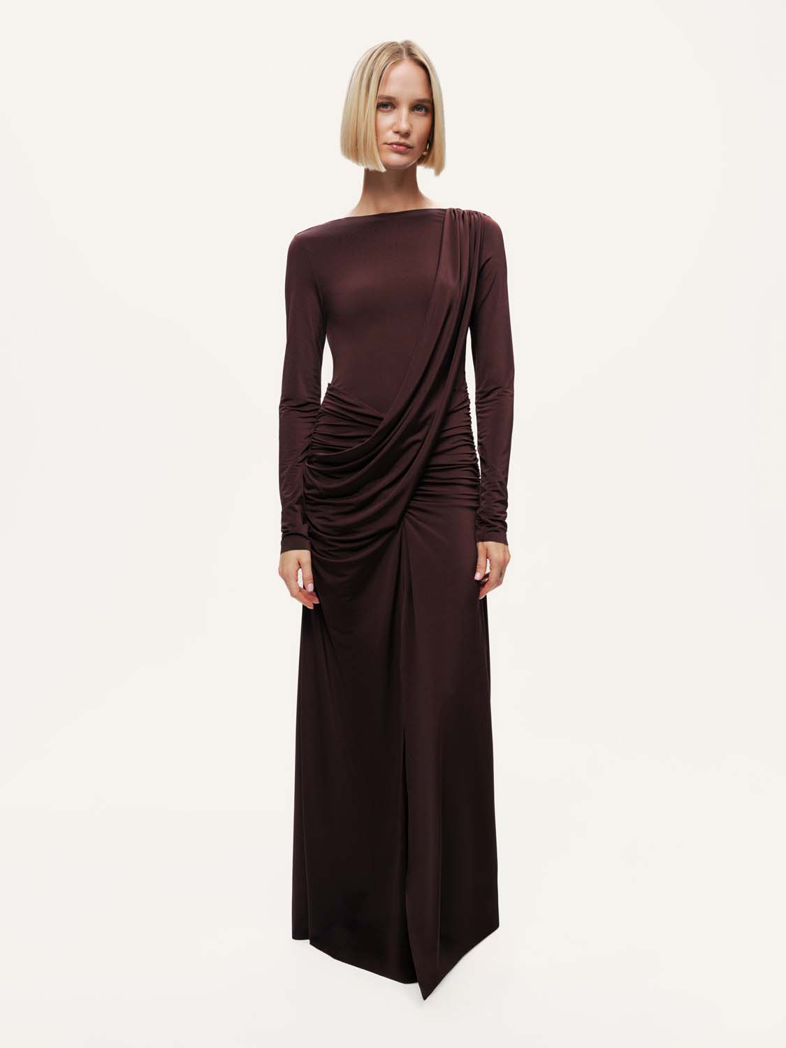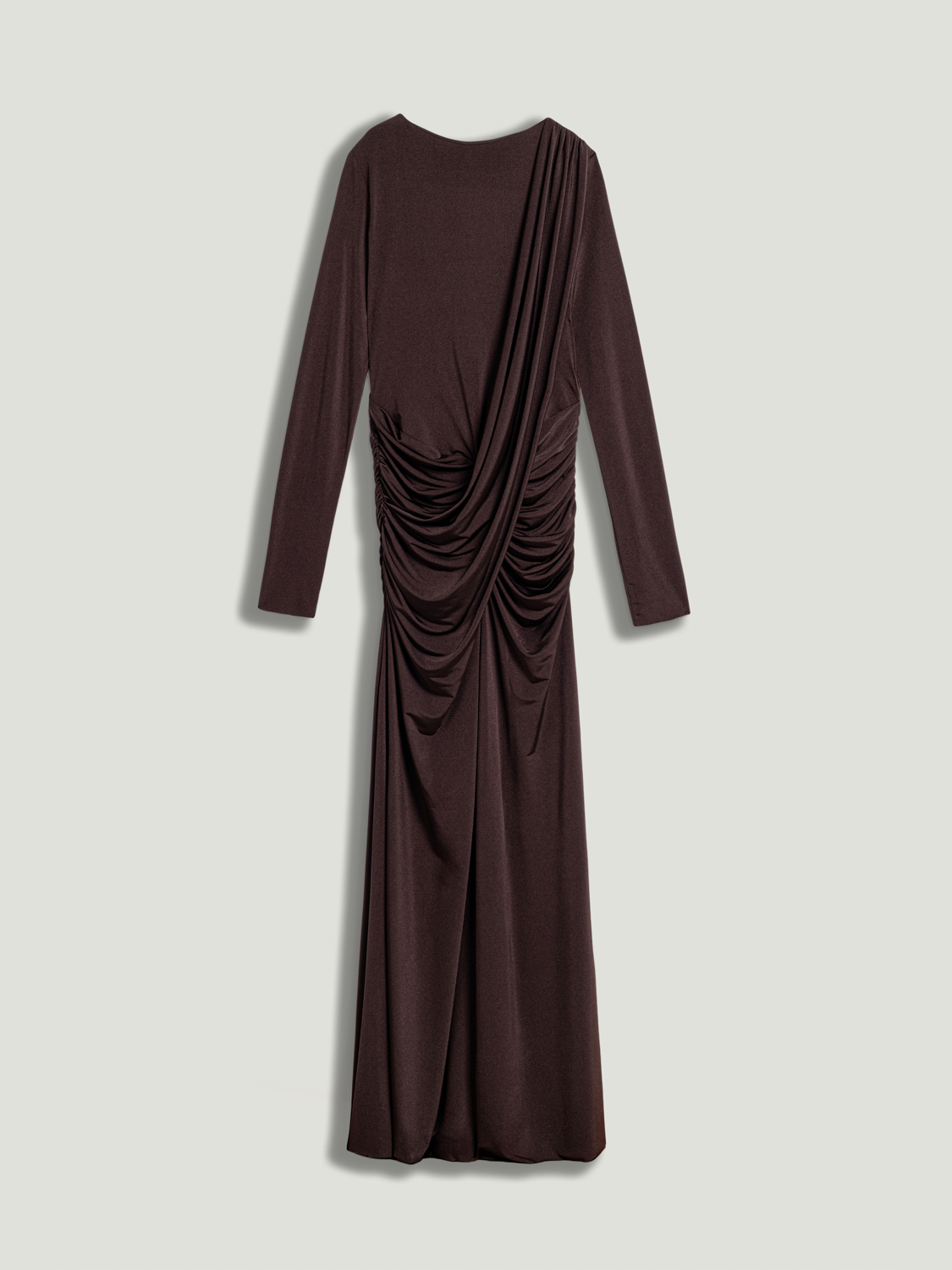 Ürün Açıklaması: Slim fit, tam kalıp, astarsız, örme, uzun kollu, sıfır yaka, sırt dekolteli, drapeli ve yırtmaçlı maxi boy elbise
