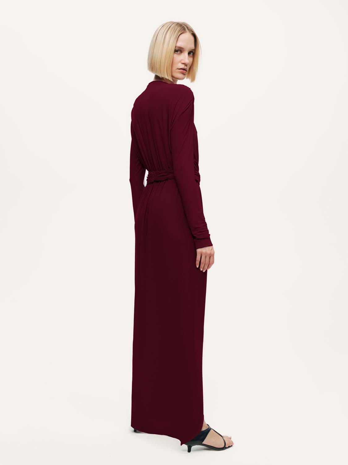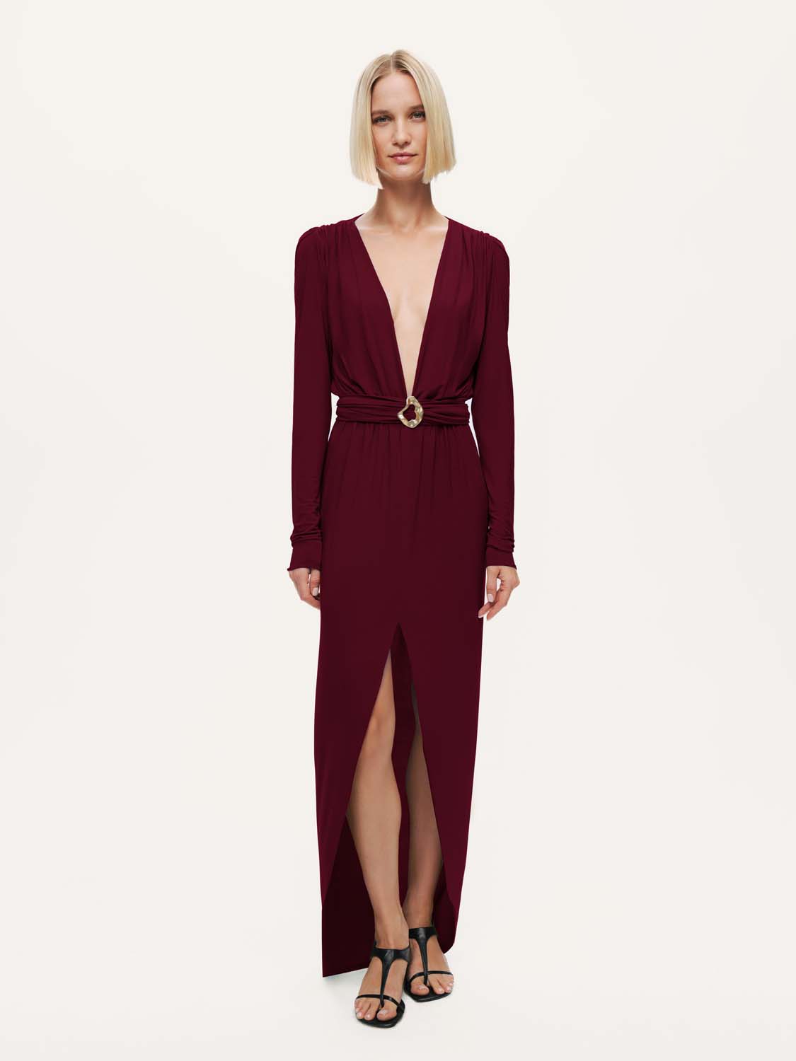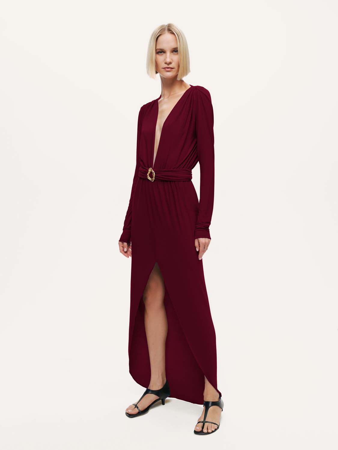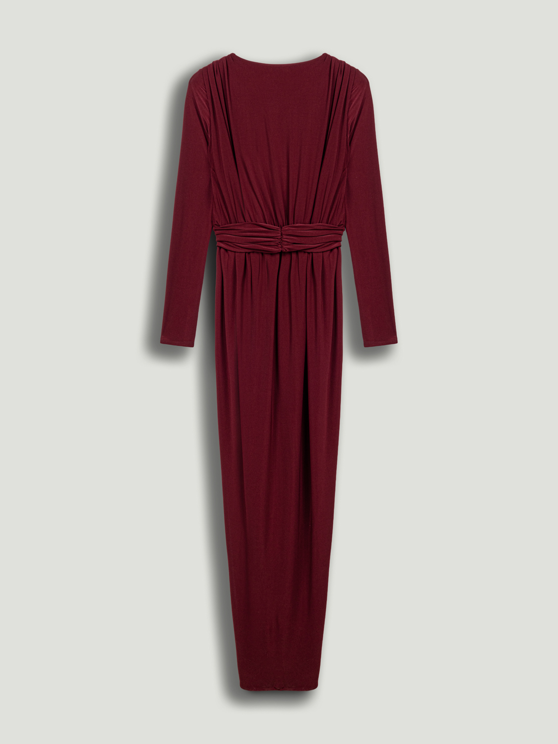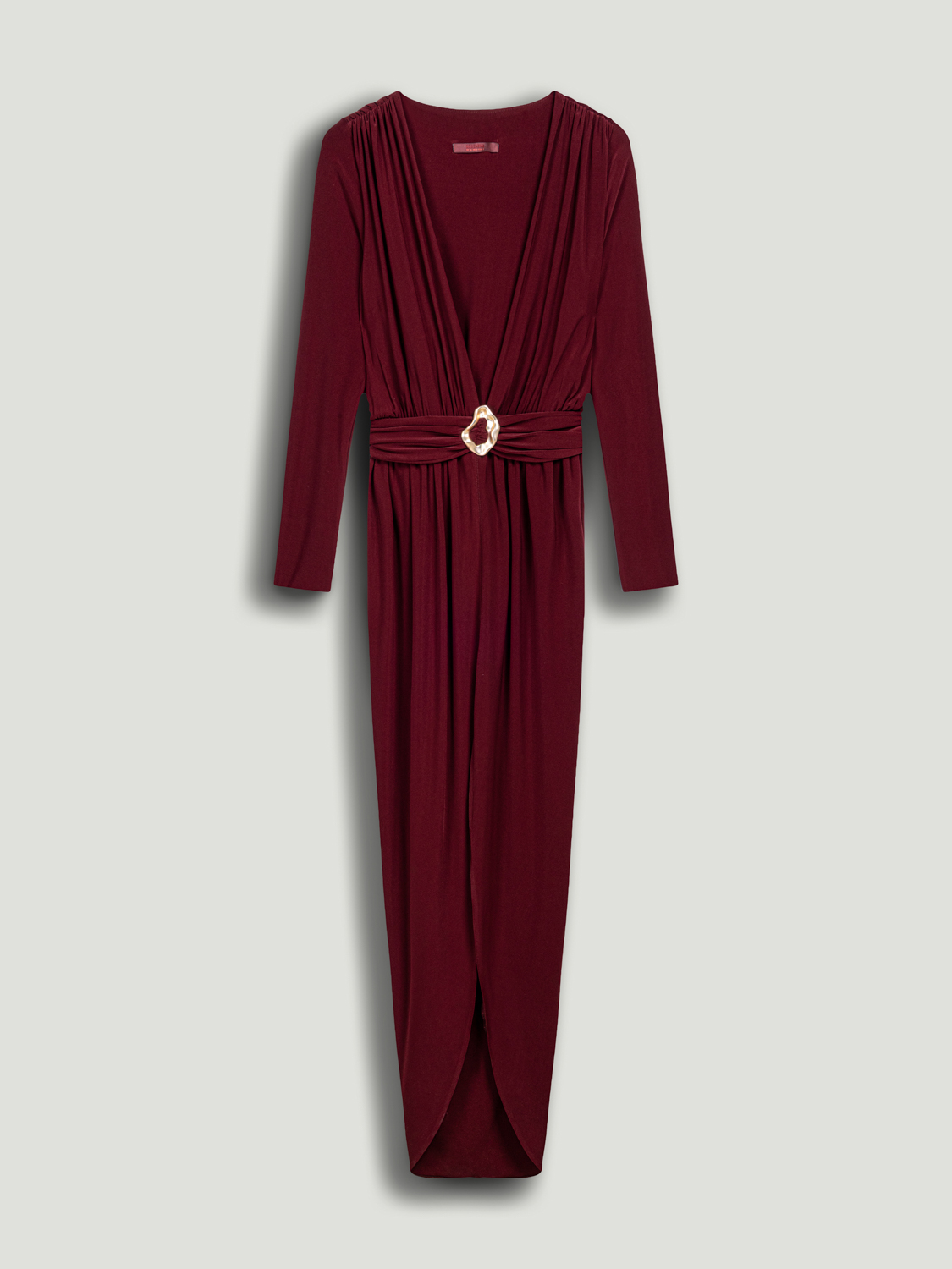 Feminen zarafeti modern bir ışıltıyla buluşturan bu bel aksesuar detaylı maxi elbise, her adımda etkileyici bir siluet sunuyor. Regular fit kesimiyle vücuda zarifçe otururken, derin V yaka tasarımı feminen bir duruş kazandırır. Drapeli formu ve bel kısmındaki metal aksesuar detayı, bedeni vurgulayan sofistike bir hareket yaratır. Uzun kolları ve yırtmaç detayıyla dengeli bir şıklık sunan elbise, akıcı örme kumaşı sayesinde konfor ve zarafeti bir araya getirir. Astarsız yapısı hafiflik hissi verirken, özel davetlerden gece organizasyonlarına kadar her ortamda göz alıcı bir duruş garanti eder.