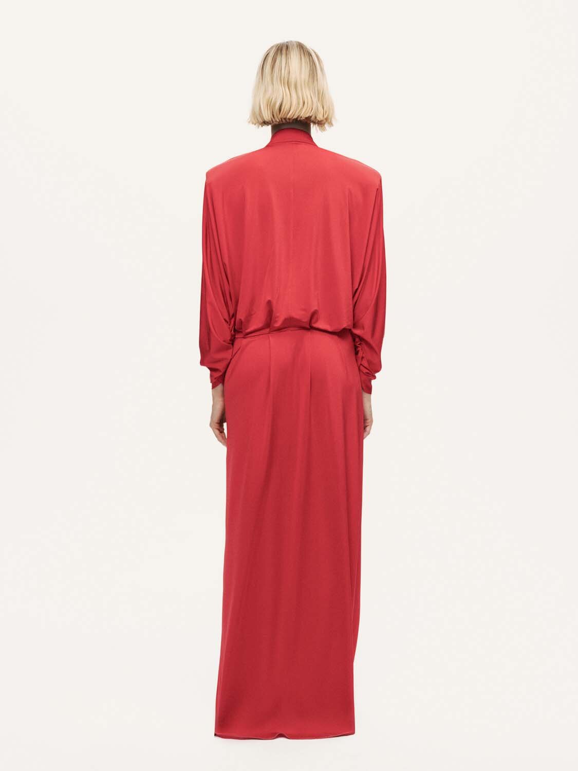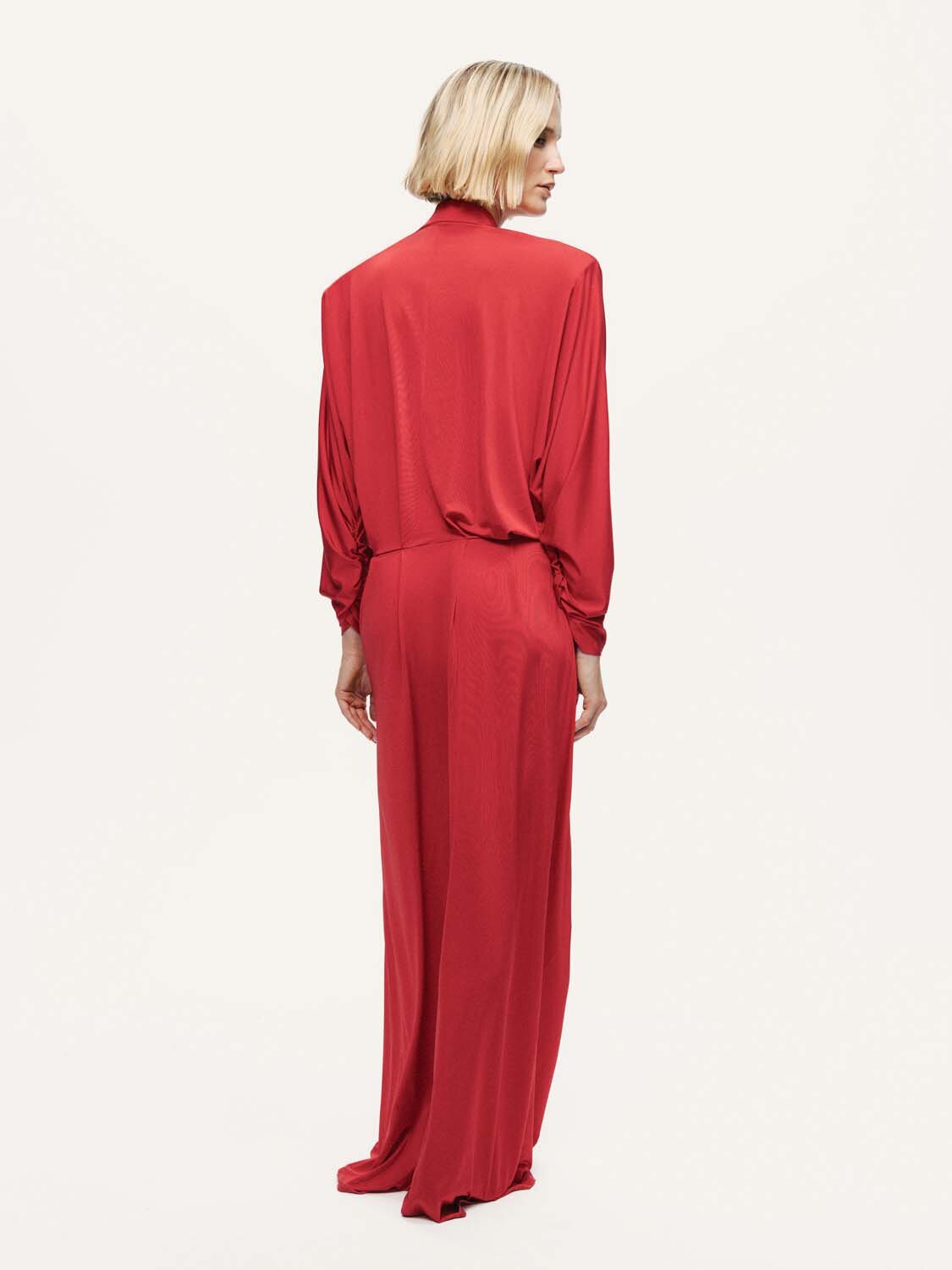 Klasik çizgileri modern detaylarla buluşturan bu vatkalı maxi elbise, güçlü ve sofistike bir siluet sunuyor. Regular fit kesimi ve tam kalıbı vücuda dengeli bir oturuş sağlarken, uzun kollu tasarımı mevsim geçişlerinde ideal bir kullanım sunar. Katlı kruvaze yakası zarif bir hareket kazandırırken, vatka detayı omuz hattını belirginleştirerek stilin karakterini güçlendirir. Astarlı örme kumaşı ile konfor ve zarafeti bir araya getiren bu maxi elbise, gündüzden geceye her ortamda sofistike bir şıklık yaratmak için mükemmel bir seçim.