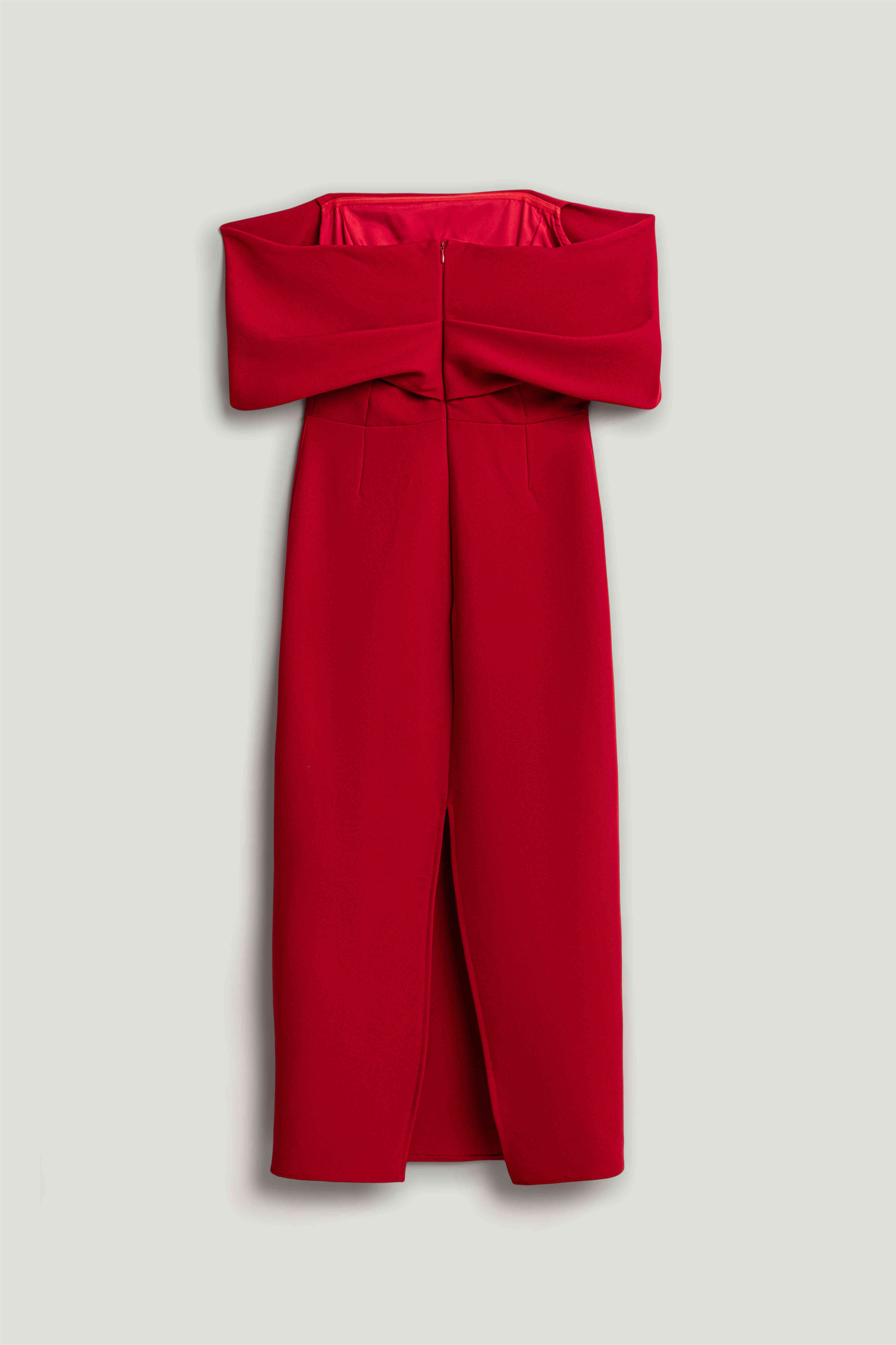 Ürün Açıklaması: Regular fit, tam kalıp, astarlı, dokuma, ince gizli fermuar kapamalı, arkası yırtmaçlı, straplez yaka, açık omuzlu midi boy elbise