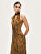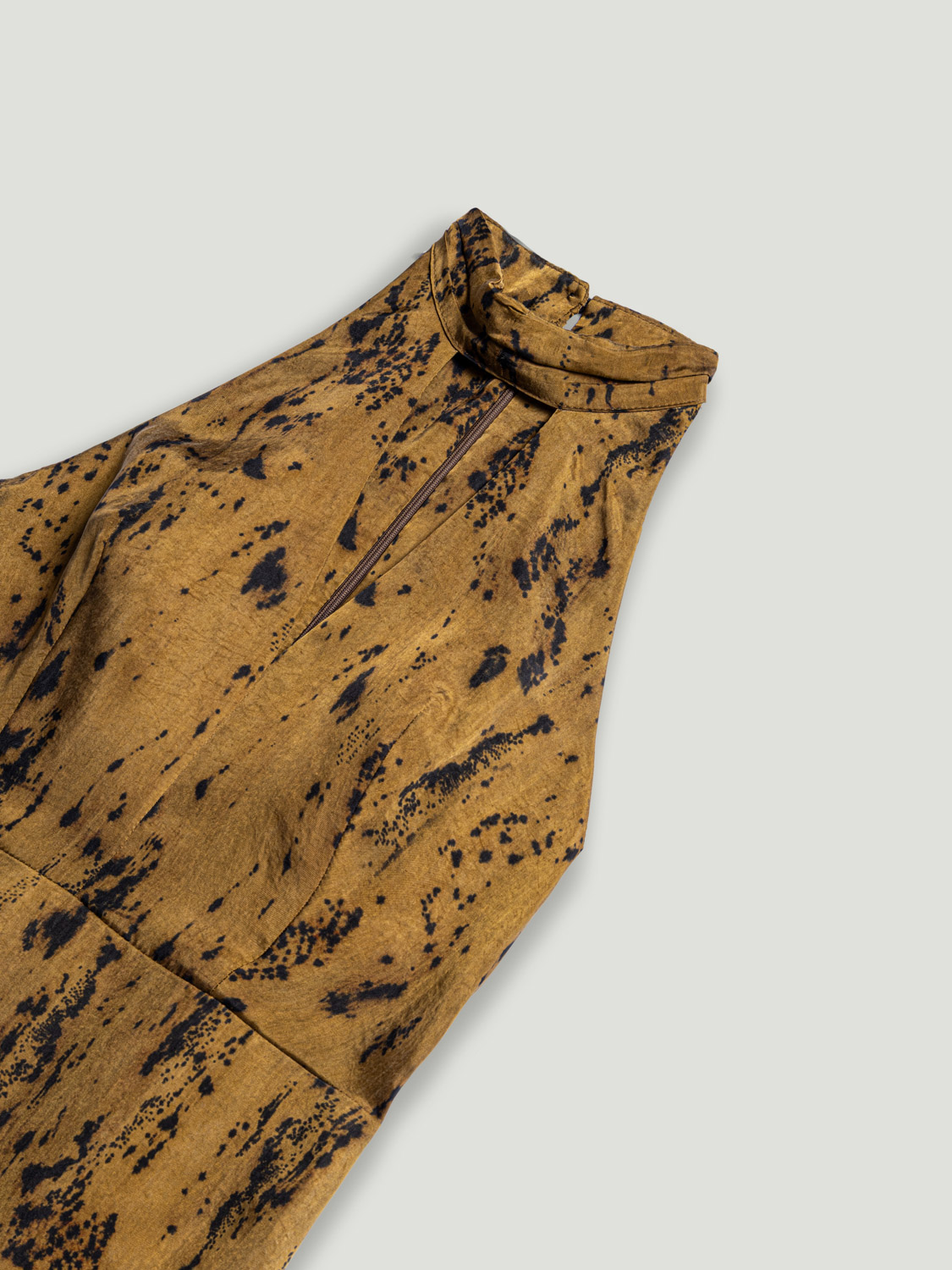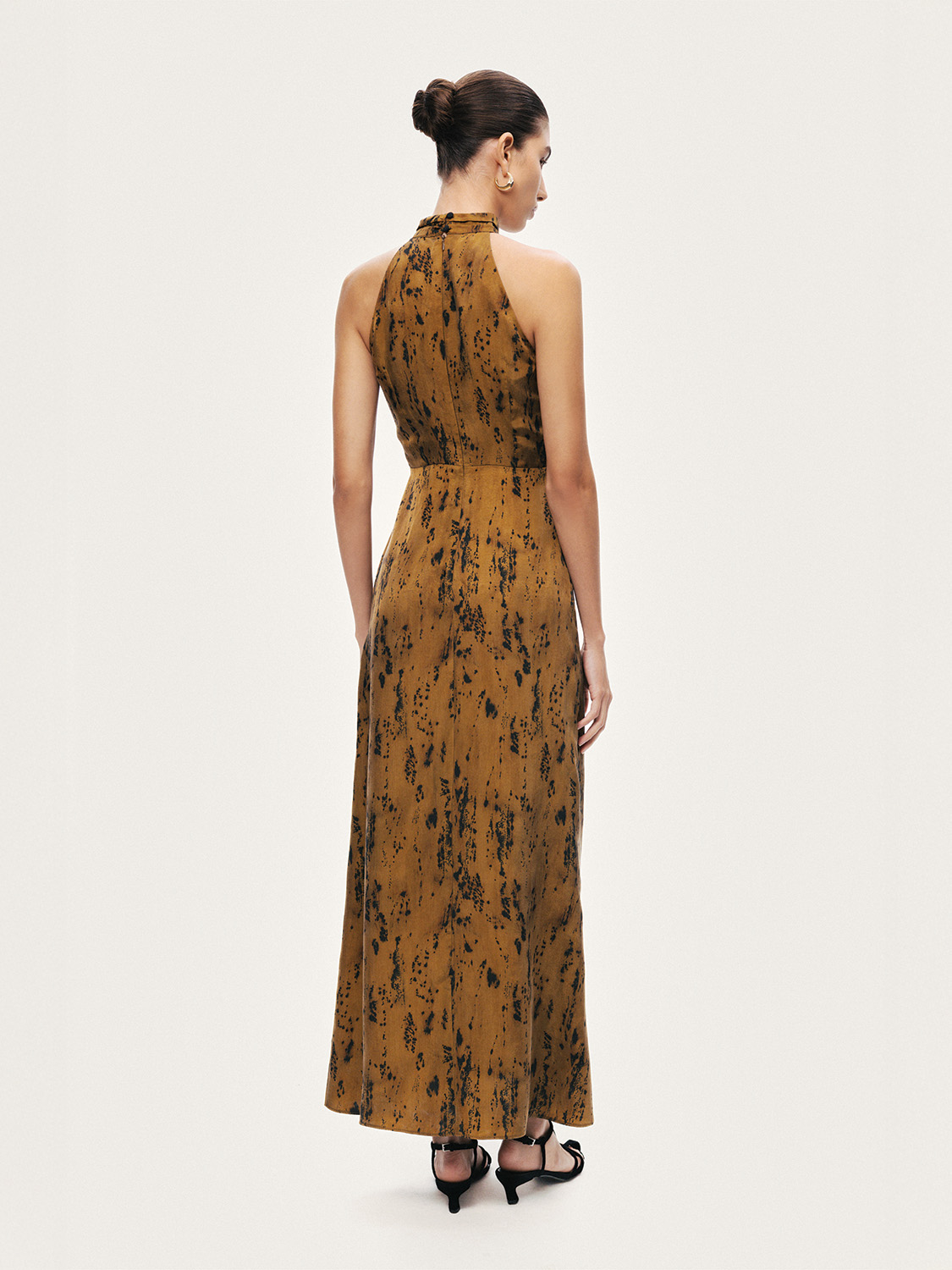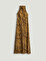 Ürün Açıklaması: Slim fit, tam kalıp, astarsız, dokuma, halter yaka, sırt dekolteli, midi boy, akıcı form, feminen ve iddialı siluet sunan desenli elbise.