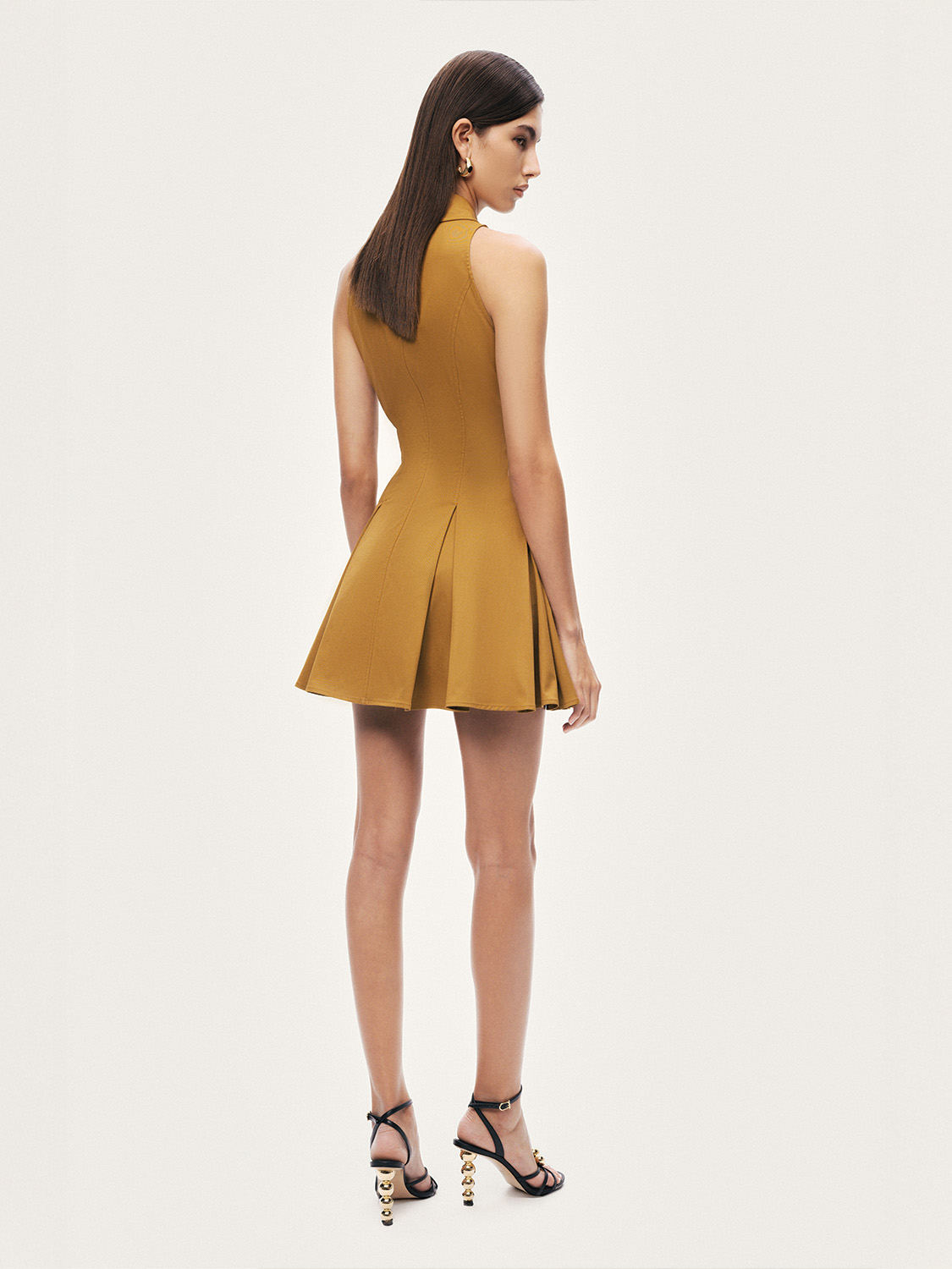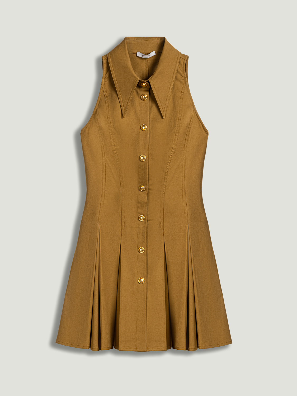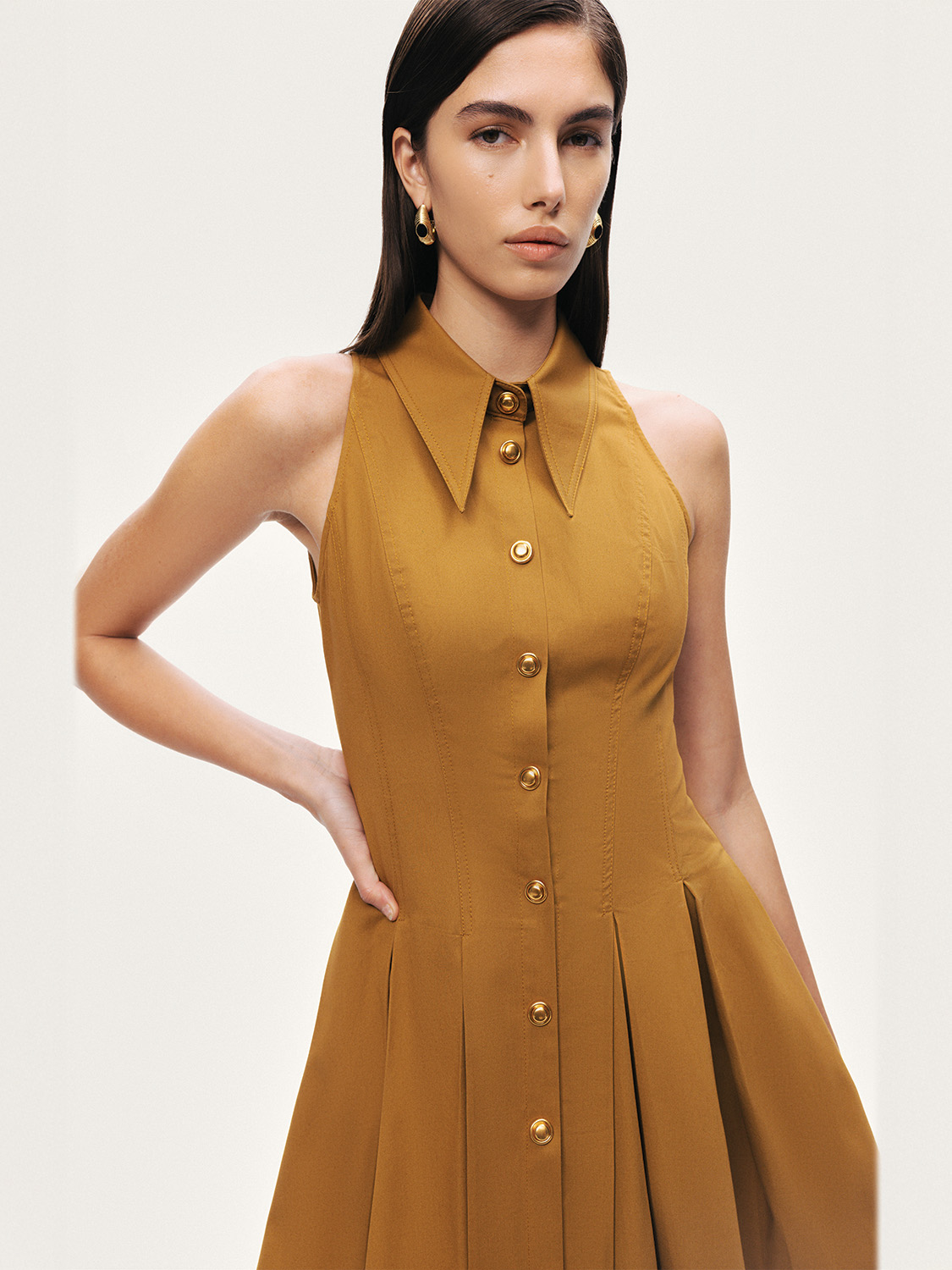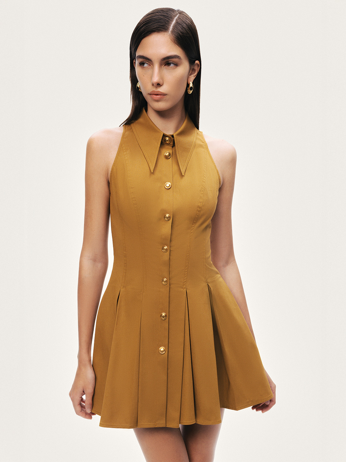 Klasik gömlek yaka formunu modern bir yorumla buluşturan bu mini elbise, zamansız ve dinamik bir stil sunar. Regular fit kesimiyle vücuda dengeli bir oturuş sağlarken, kolsuz yapısı ferah bir kullanım sunar. Pileli eteği tasarıma hareket ve feminen bir akıcılık kazandırırken, metal çıtçıt kapama detayı modern bir dokunuş ekler. Astarsız dokuma kumaşıyla hafif ve konforlu olan bu elbise, gündüzden şehir akşamlarına uzanan şık kombinler için ideal bir parça.