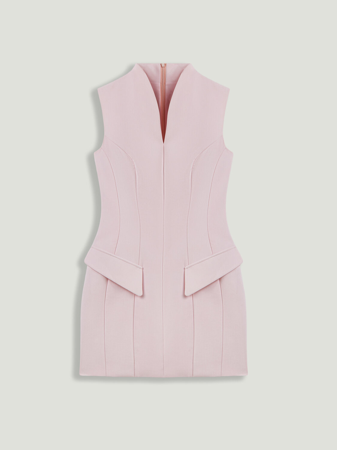 Zarif ve modern çizgileri bir araya getiren bu mini elbise, slim fit kesimiyle feminen bir siluet sunar. Hakim yaka tasarımı elbiseye sofistike bir duruş kazandırırken, kolsuz formu ve cep detayları tasarıma şehirli bir hava katar. İnce gizli fermuar kapamasıyla sade bir görünüm sunan bu parça, gündüzden akşam stiline kolayca uyum sağlayan şık bir alternatif oluşturur.