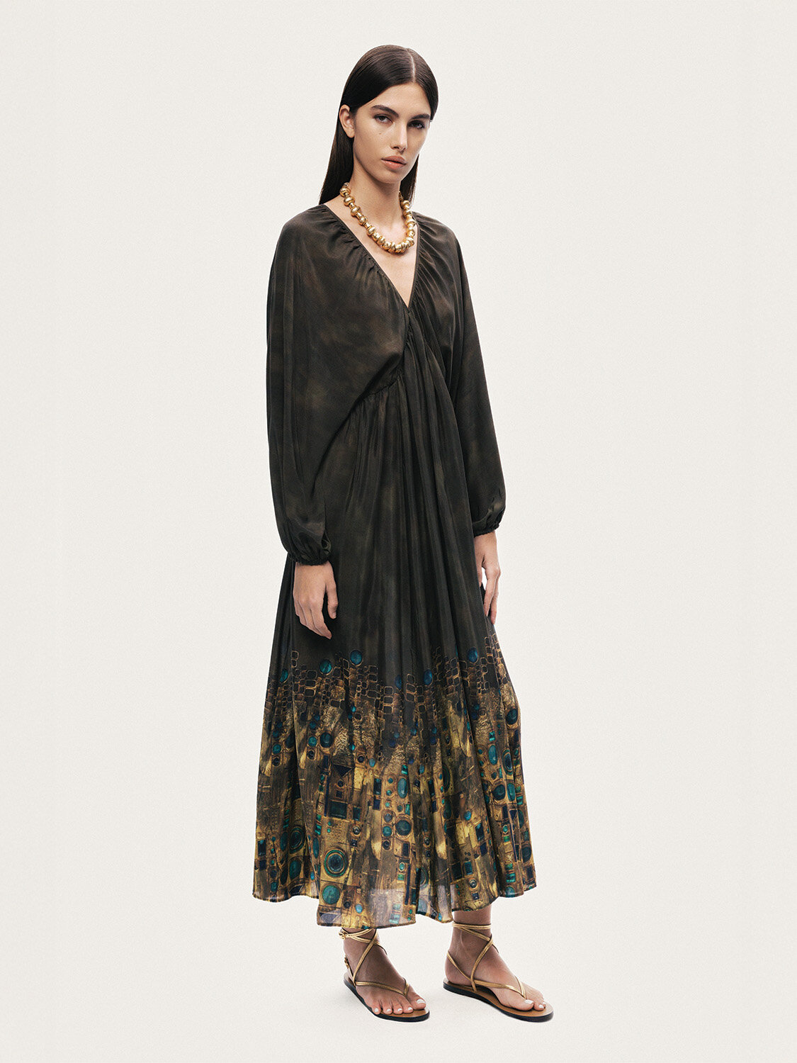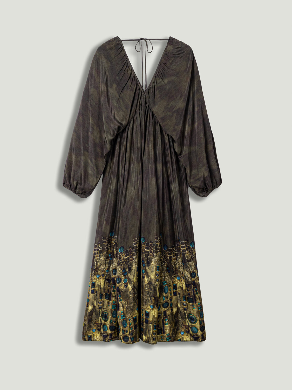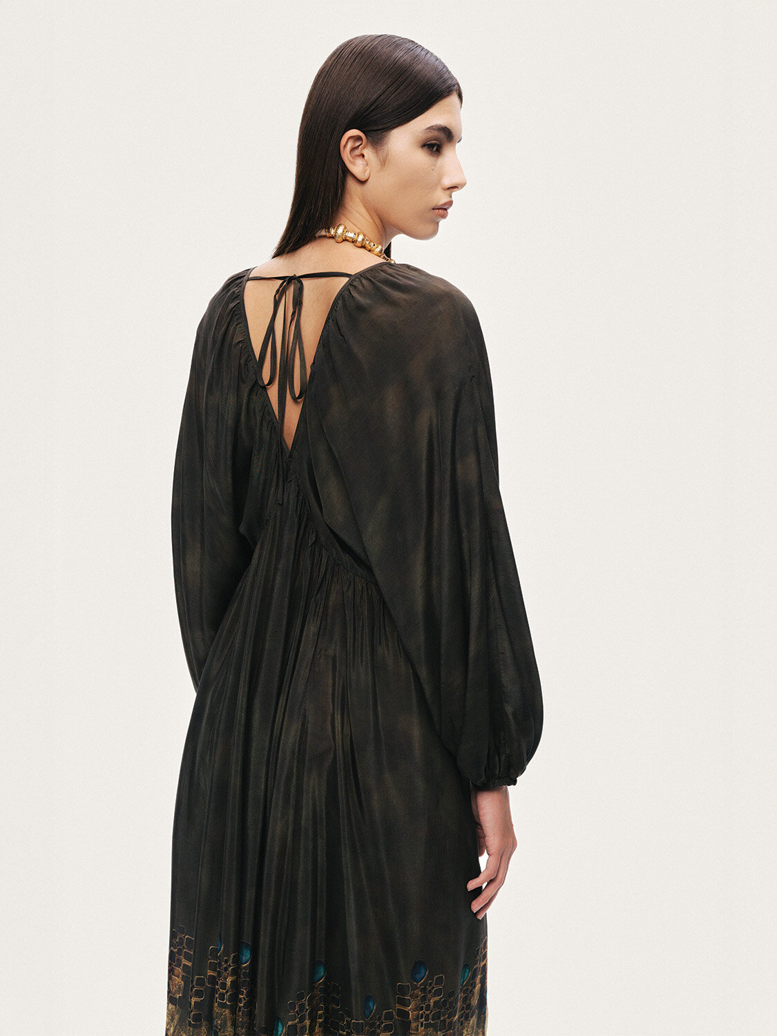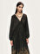 Relaxed fit kesimiyle akışkan ve konforlu bir siluet sunan bu maxi elbise, astarsız dokuma yapısıyla hafif ve ferah bir kullanım sağlar. Uzun kolları ve geniş V yakası feminen bir duruş kazandırırken, enseden bağlama detayı tasarıma zarif bir hareket katar. Desenli yapısı sayesinde tek parçada güçlü bir stil ortaya koyan bu elbise, hem günlük kombinlerde hem de özel anlarda zahmetsiz şıklık arayanlar için ideal bir seçimdir.
