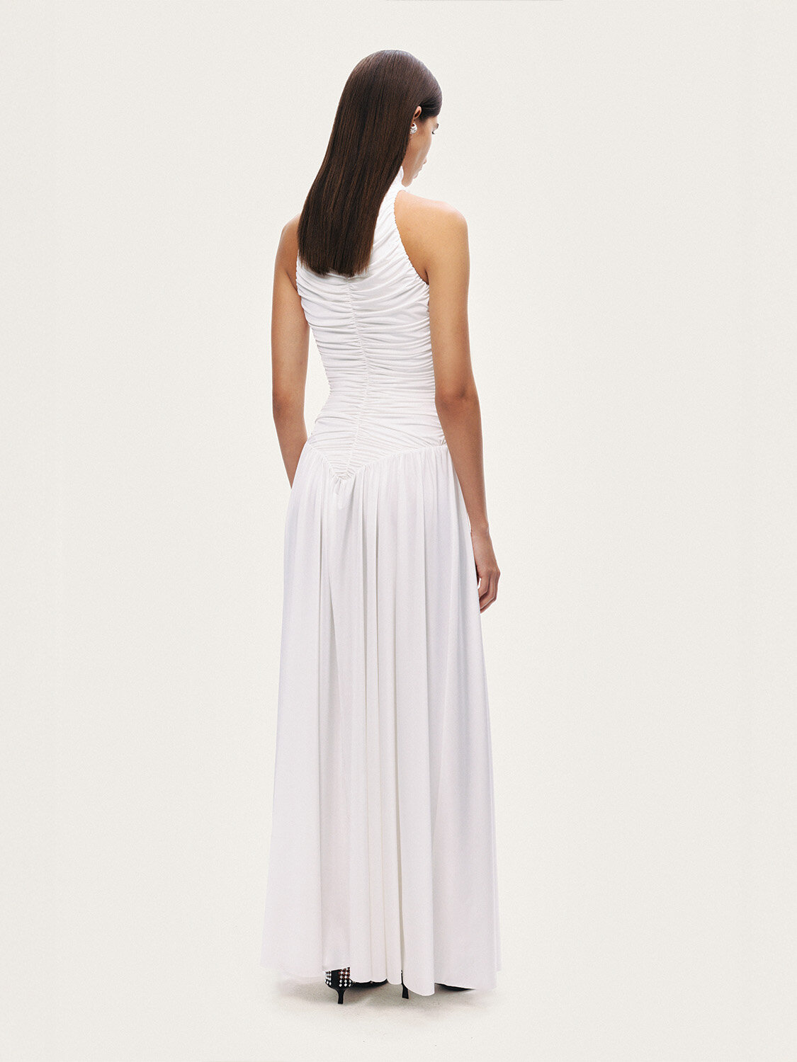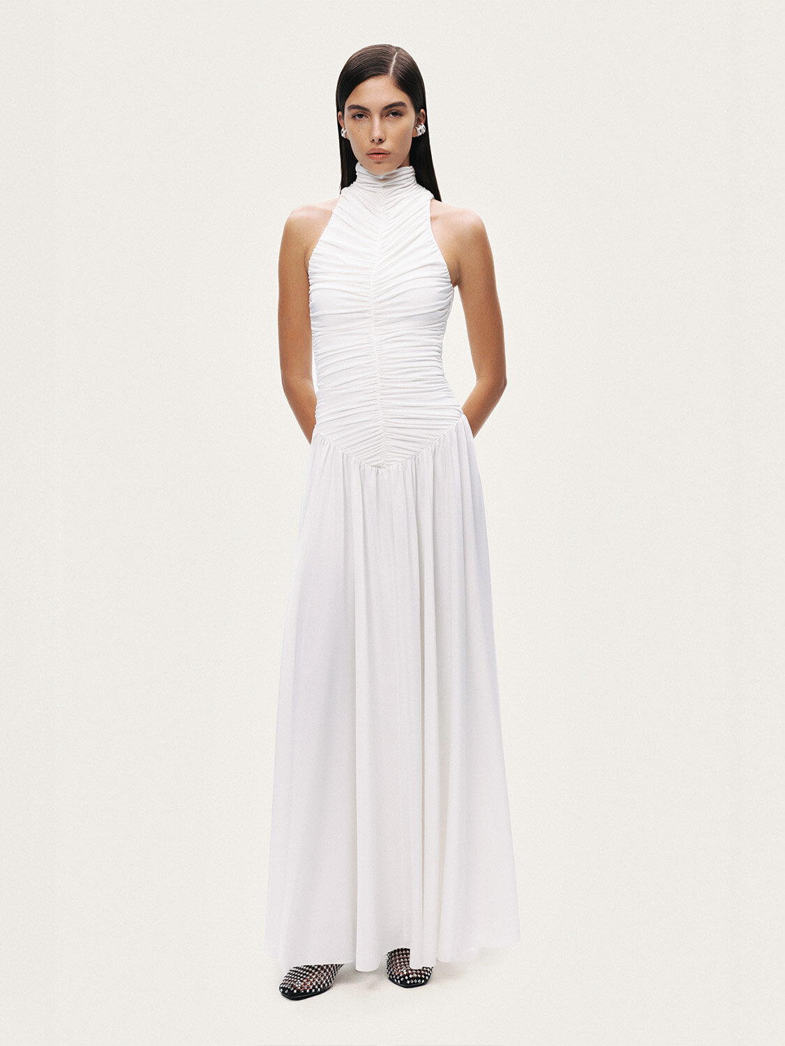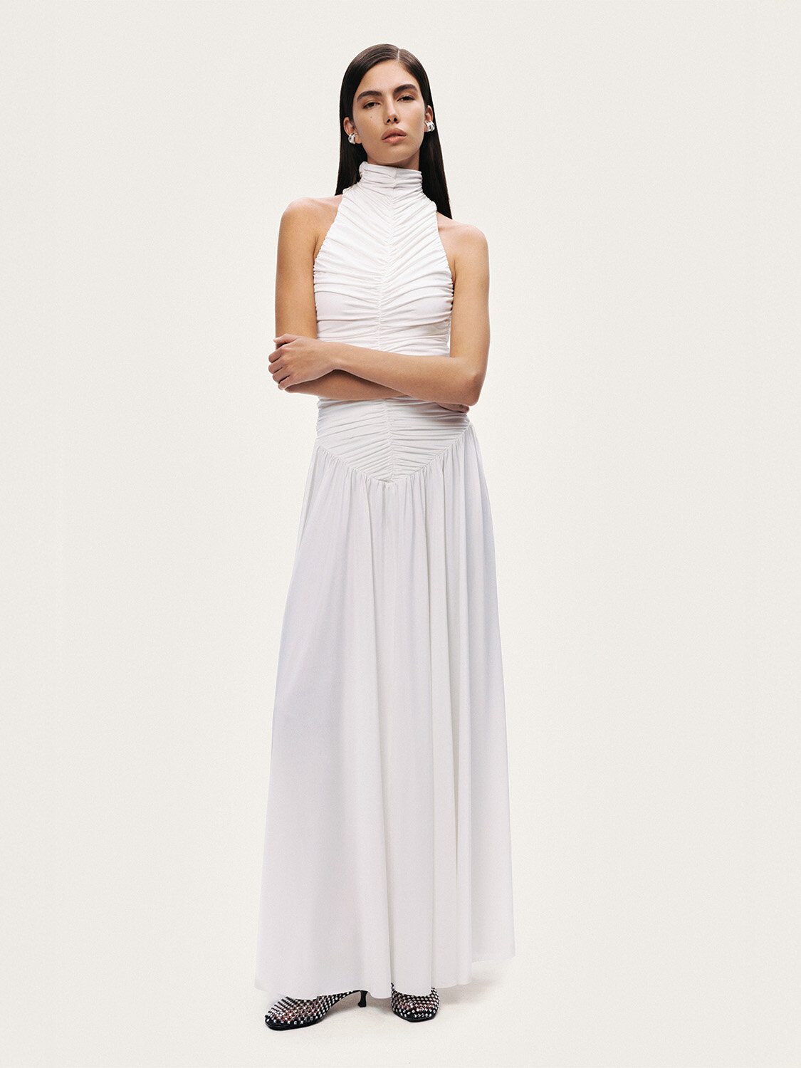 Zarif drape detayıyla feminen bir siluet sunan bu maxi elbise, sade ve modern bir şıklık yansıtır. Örme kumaşının esnek ve akışkan yapısı vücuda uyum sağlarken, slim fit kesimi hatları zarif bir şekilde vurgular. Dik yaka formu tasarıma sofistike bir duruş kazandırırken, kolsuz tasarımı elbiseye hafiflik katar. Maxi boyu sayesinde hem günlük şıklıkta hem de akşam davetlerinde tek parça ile güçlü bir stil oluşturur.