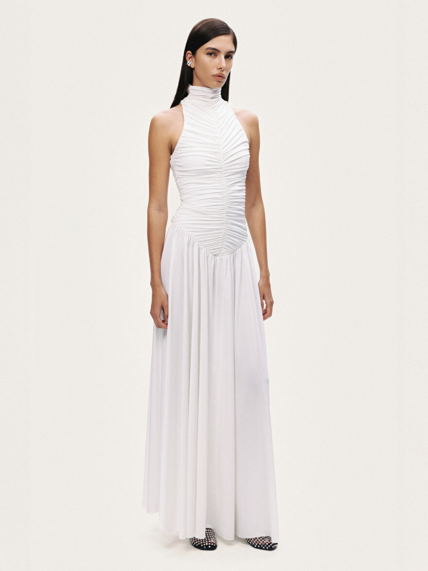 Drapeli Dik Yaka Maxi Elbise