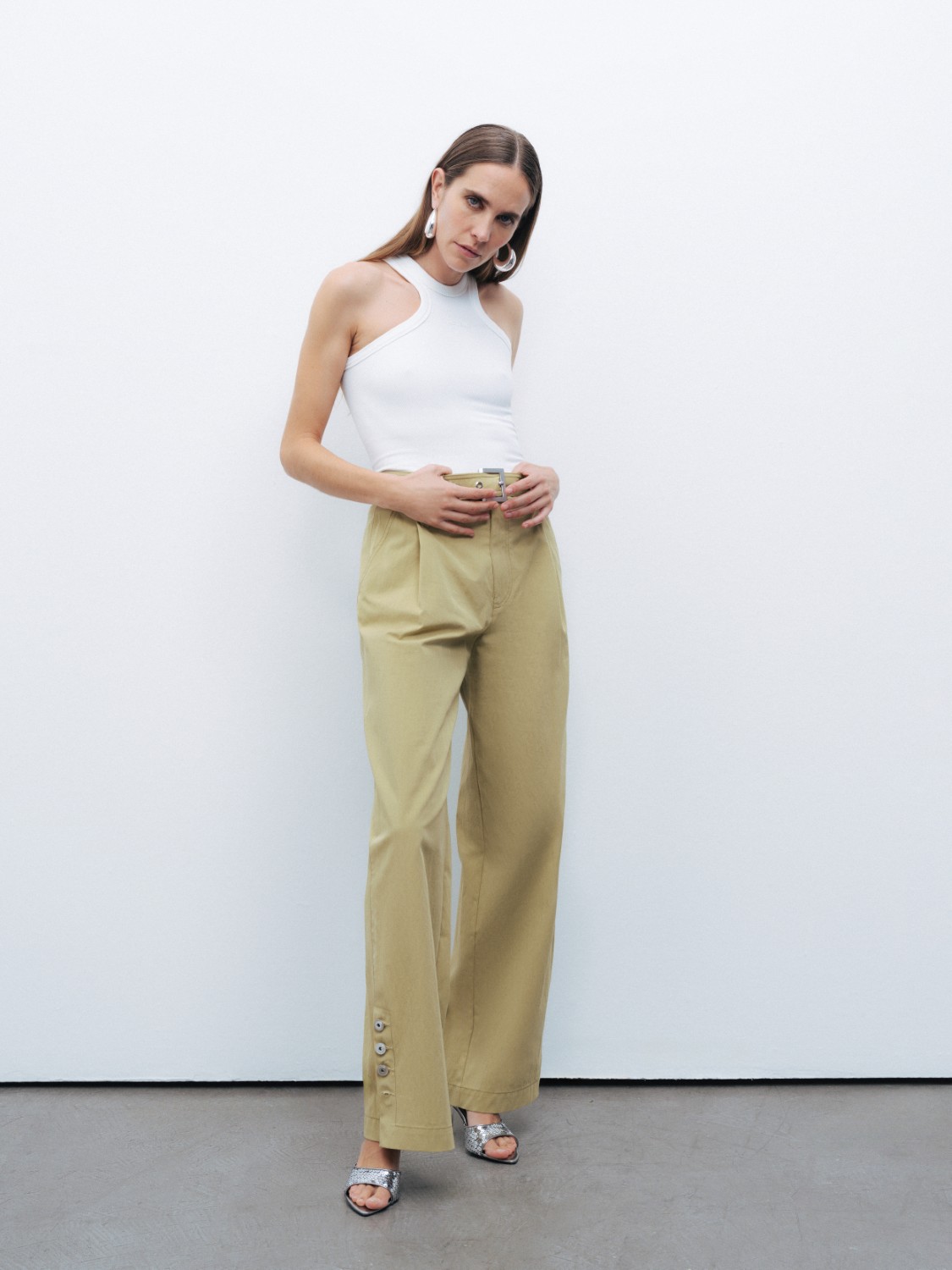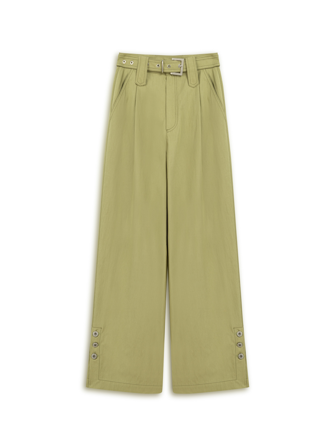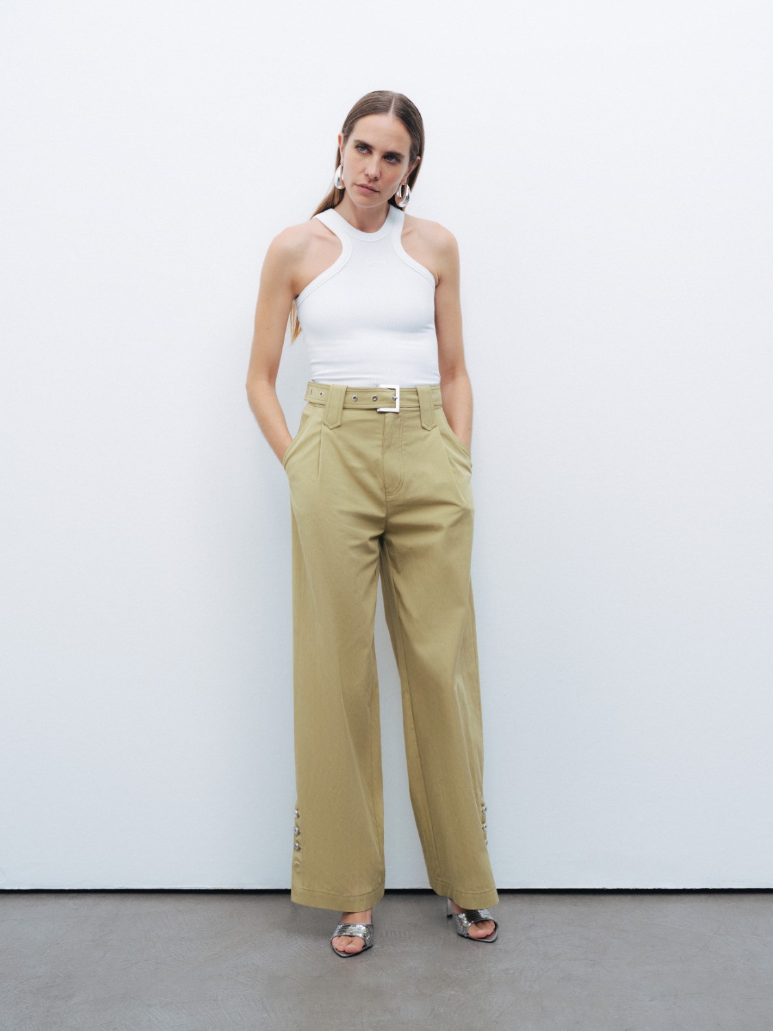 Ürün Açıklaması: Relaxed fit, tam kalıp, astarsız, fermuar ve düğme kapamalı, yüksek bel, bilek boy, tek pilili, yandan cepli, paçaları düğme tasarımlı, metal toka detaylı kemerli pantolon
