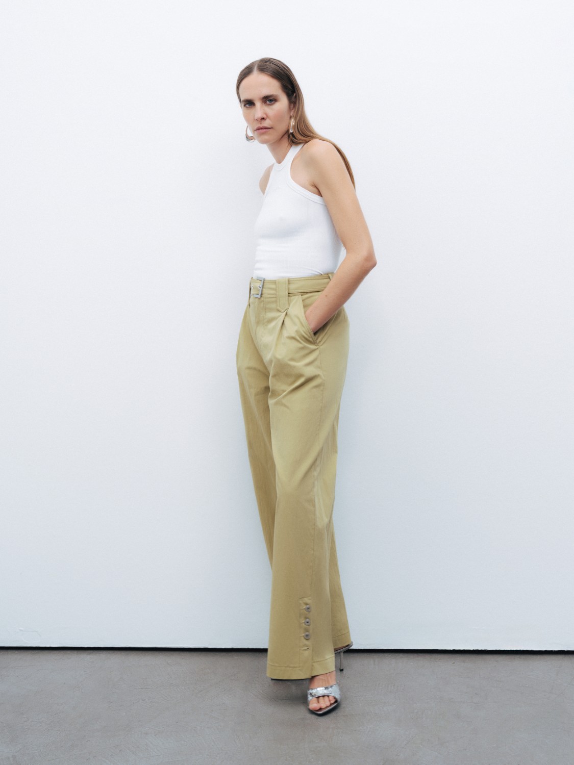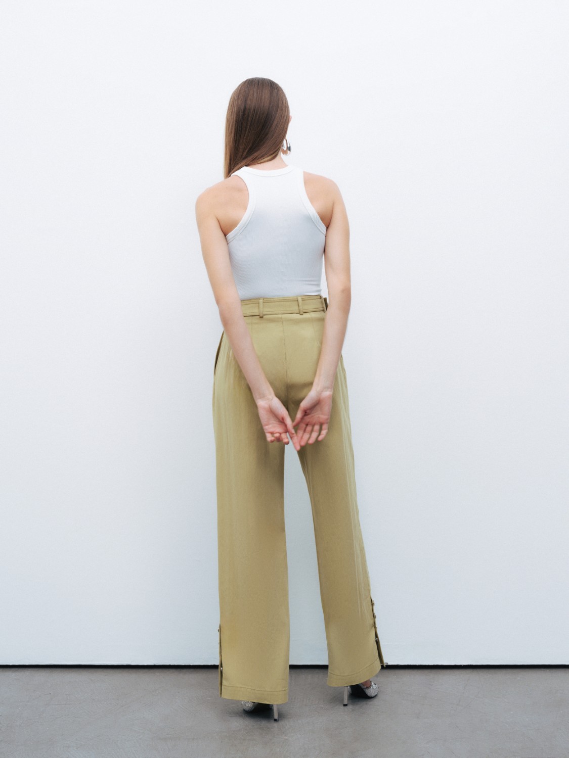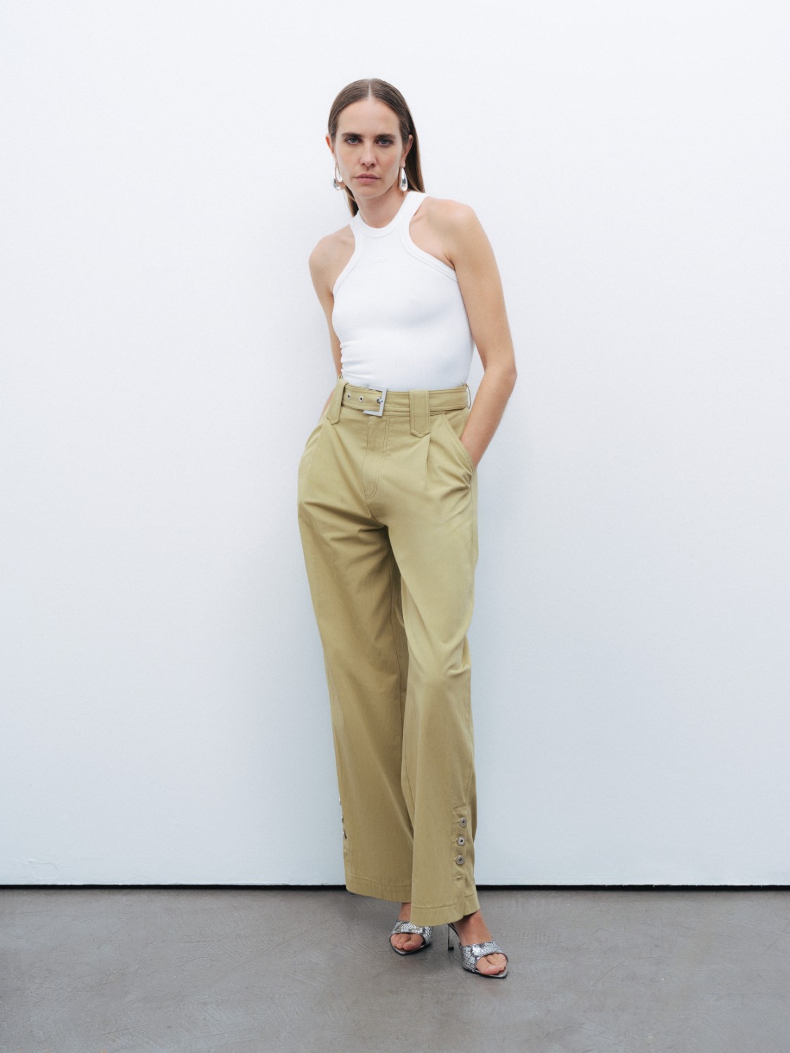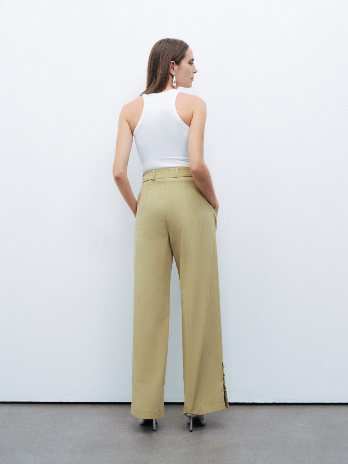 Ürün Açıklaması: Relaxed fit, tam kalıp, astarsız, fermuar ve düğme kapamalı, yüksek bel, bilek boy, tek pilili, yandan cepli, paçaları düğme tasarımlı, metal toka detaylı kemerli pantolon