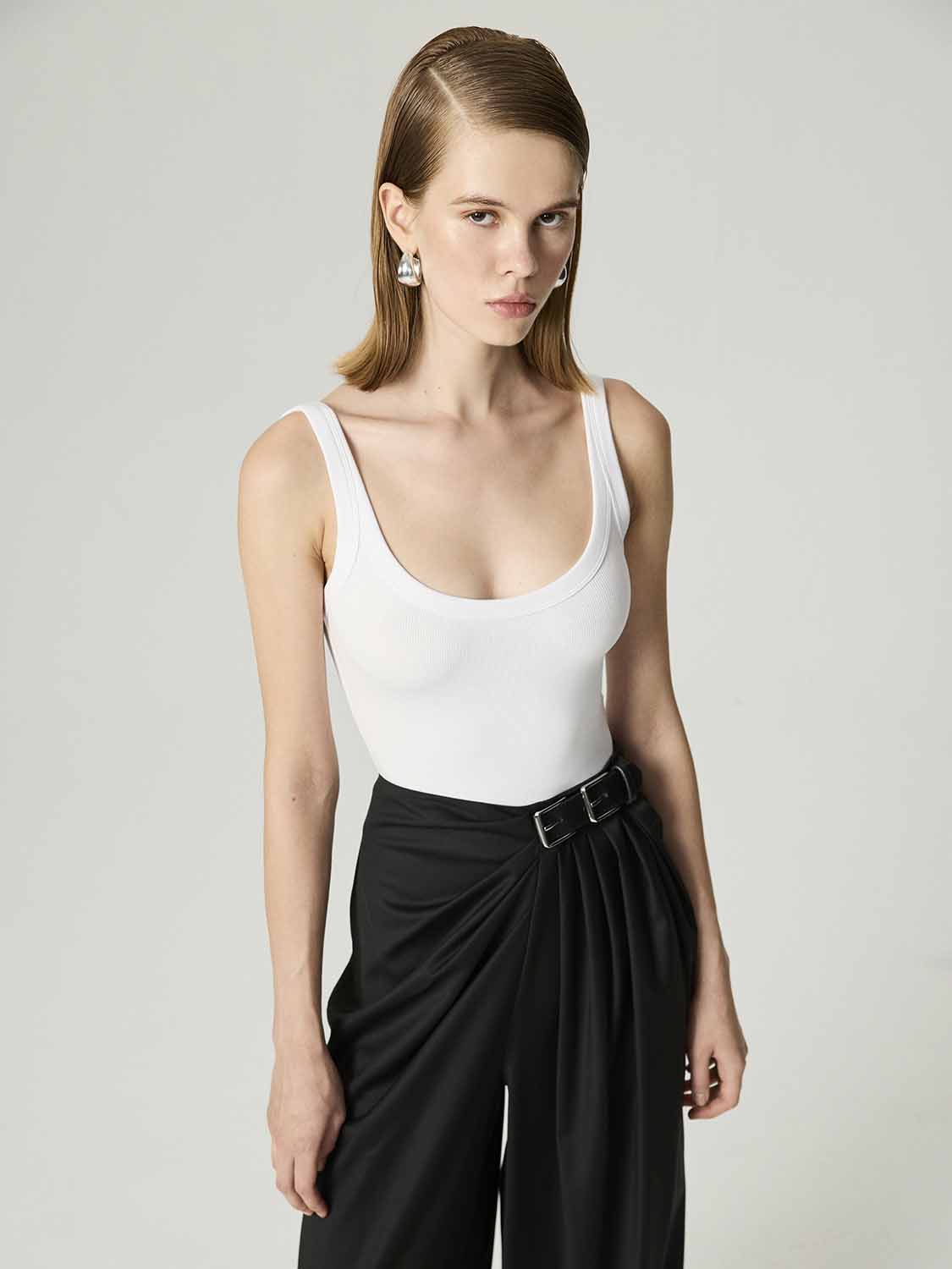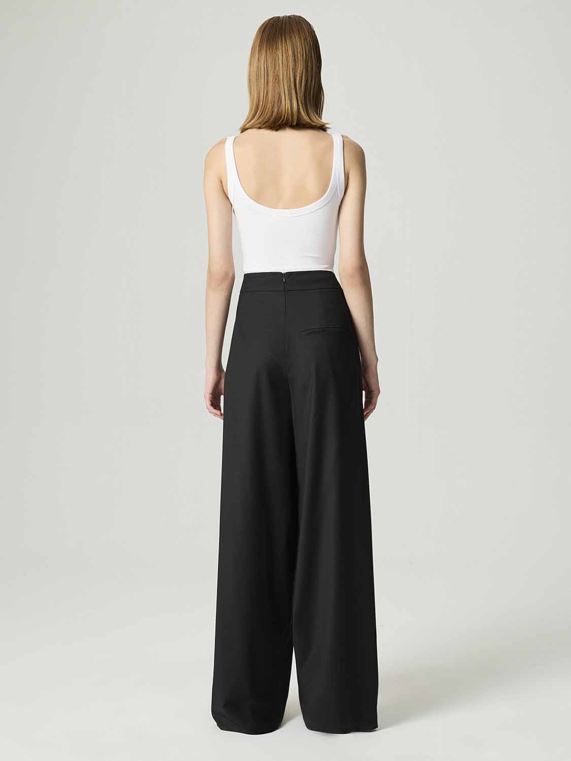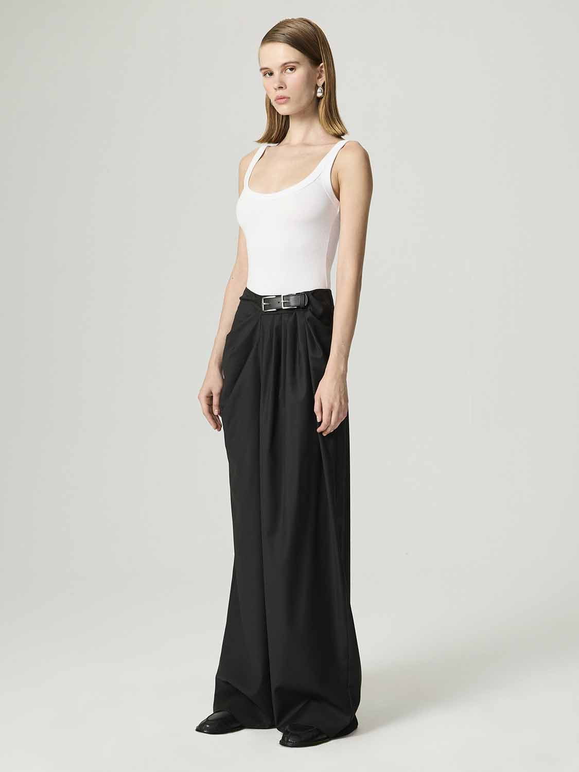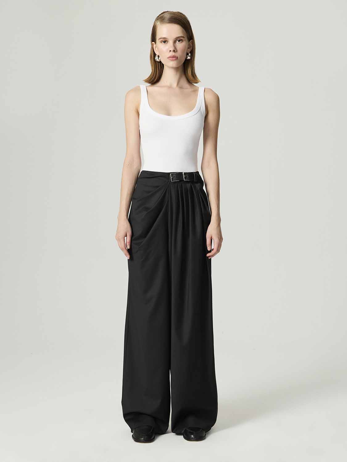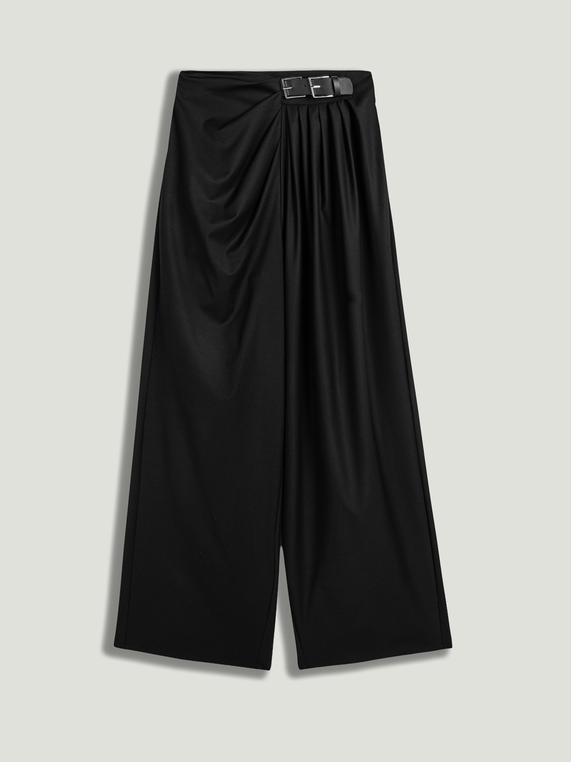 Bu iddialı çift tokalı pantolonla stilinizi bir üst seviyeye taşıyın. Rahat kesimli ve yüksek bel kesimli bu pantolon, asimetrik pileler ve çift tokalı askılarla vurgulanan şekillendirilmiş bir bel bandına sahiptir. Gizli arka fermuarı sade bir görünüm sağlarken, astarsız dokuma kumaş akıcılık ve hareket özgürlüğü sağlar. İster dar bir bluzla ister bol bir örgüyle kombinleyin, bu pantolon sonbahar kombininize yapı ve şıklık katar.