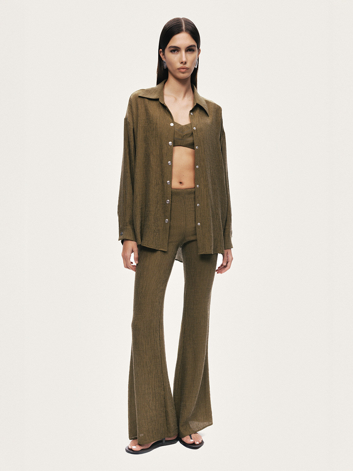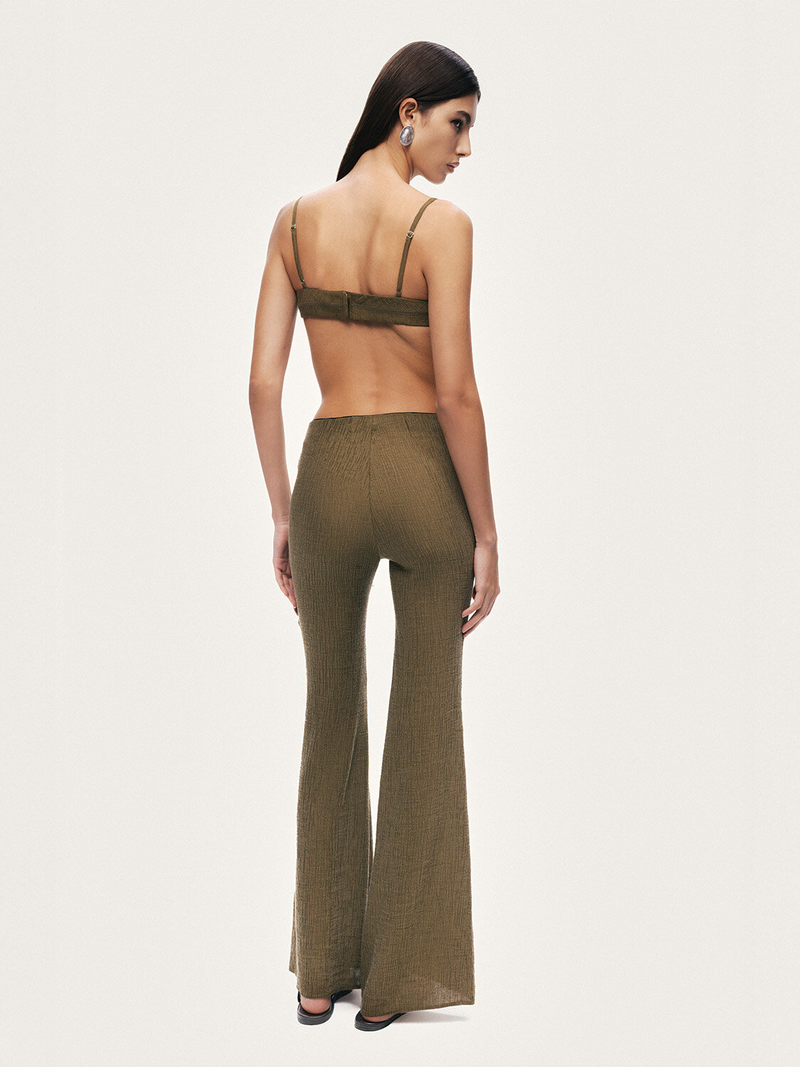 Feminen ve güçlü siluetiyle öne çıkan bu ispanyol paça pantolon, modern ve iddialı bir stil sunar. Esnek örme kumaşı sayesinde gün boyu konfor sağlarken, slim fit kesimi vücuda uyum sağlayarak zarif ve dengeli bir görünüm oluşturur. Yüksek elastik bel tasarımı bel hattını kavrayarak konforlu ve toparlayıcı bir etki sunar. Dizden itibaren genişleyen ispanyol paça formu bacak boyunu daha uzun göstererek etkileyici bir siluet kazandırır. Hem günlük kombinlerde hem de şık tamamlayıcılarla birlikte kullanılabilen, zamansız ve dikkat çekici bir parçadır.