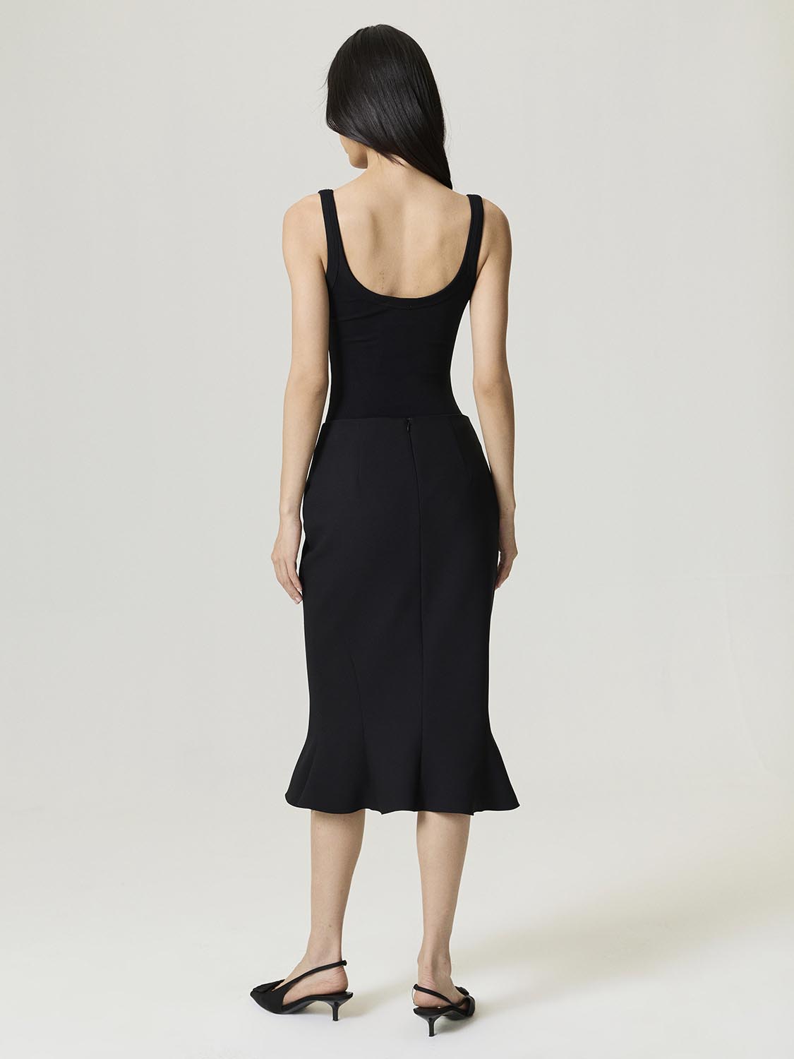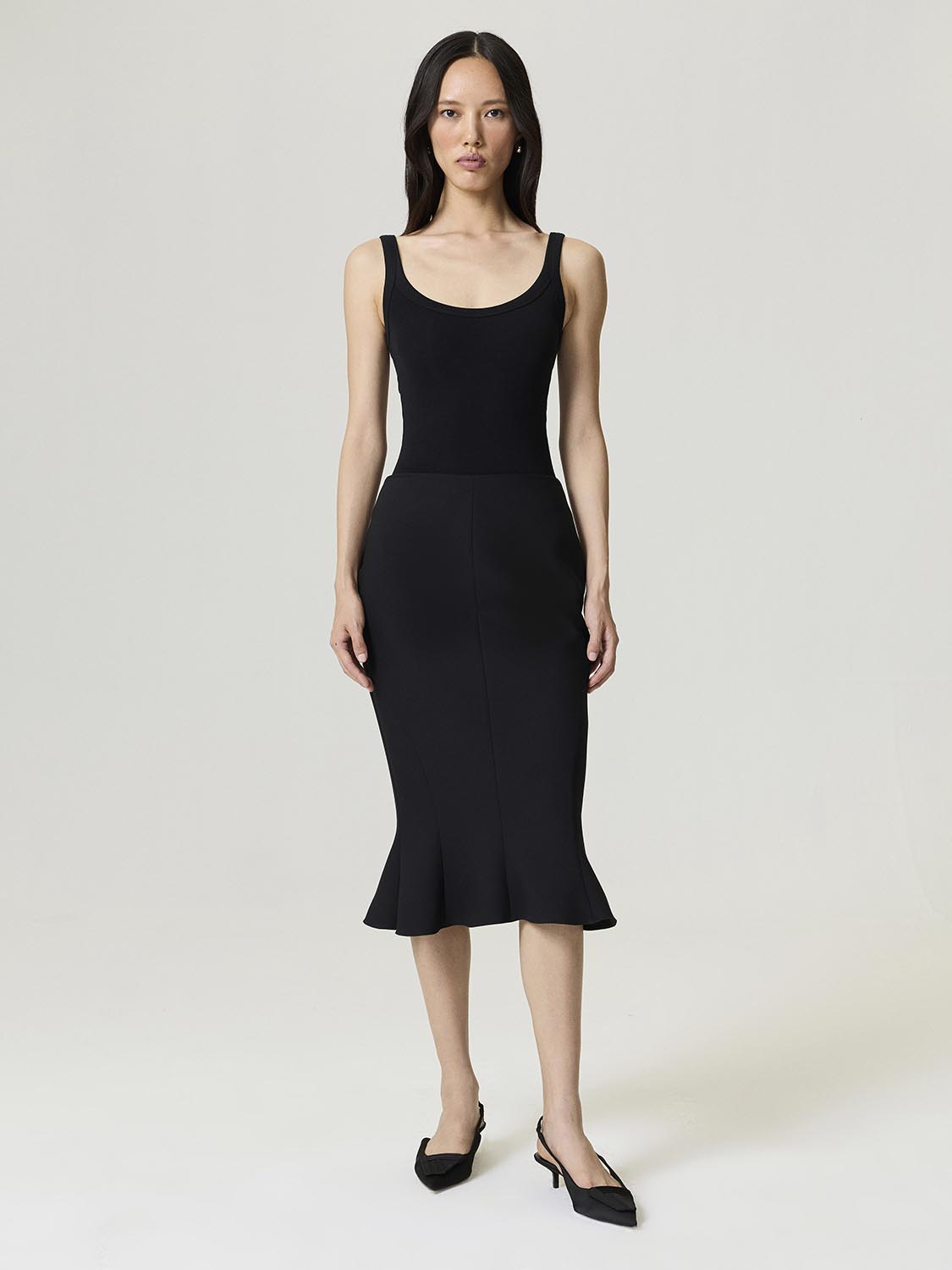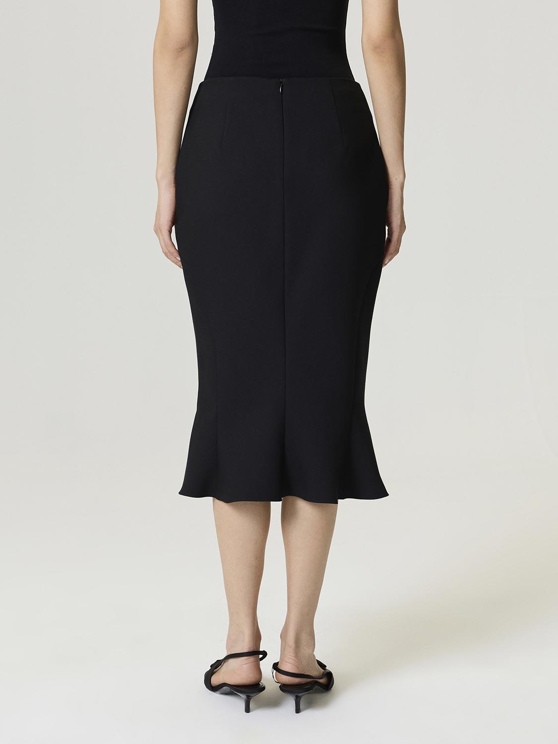 Silüetinizi dramatik bir dokunuşla vurgulamak için tasarlanan bu balık sırtı midi etek, zarafet ve feminen bir havayı bir araya getiriyor. Pürüzsüz dokuma kumaştan üretilen ve konfor için tamamen astarlı olan etek, doğal bele oturur ve dikişsiz bir uyum için gizli bir arka fermuara sahiptir. Volanlı etek ucu zarif bir hareket katarak resmi etkinlikler, akşam yemekleri veya şık ofis günleri için mükemmeldir.