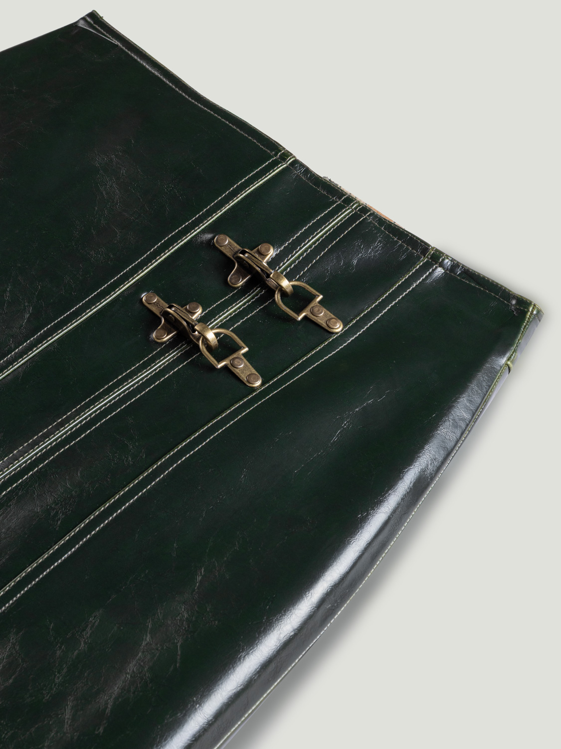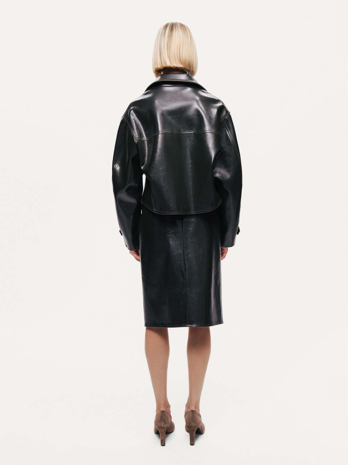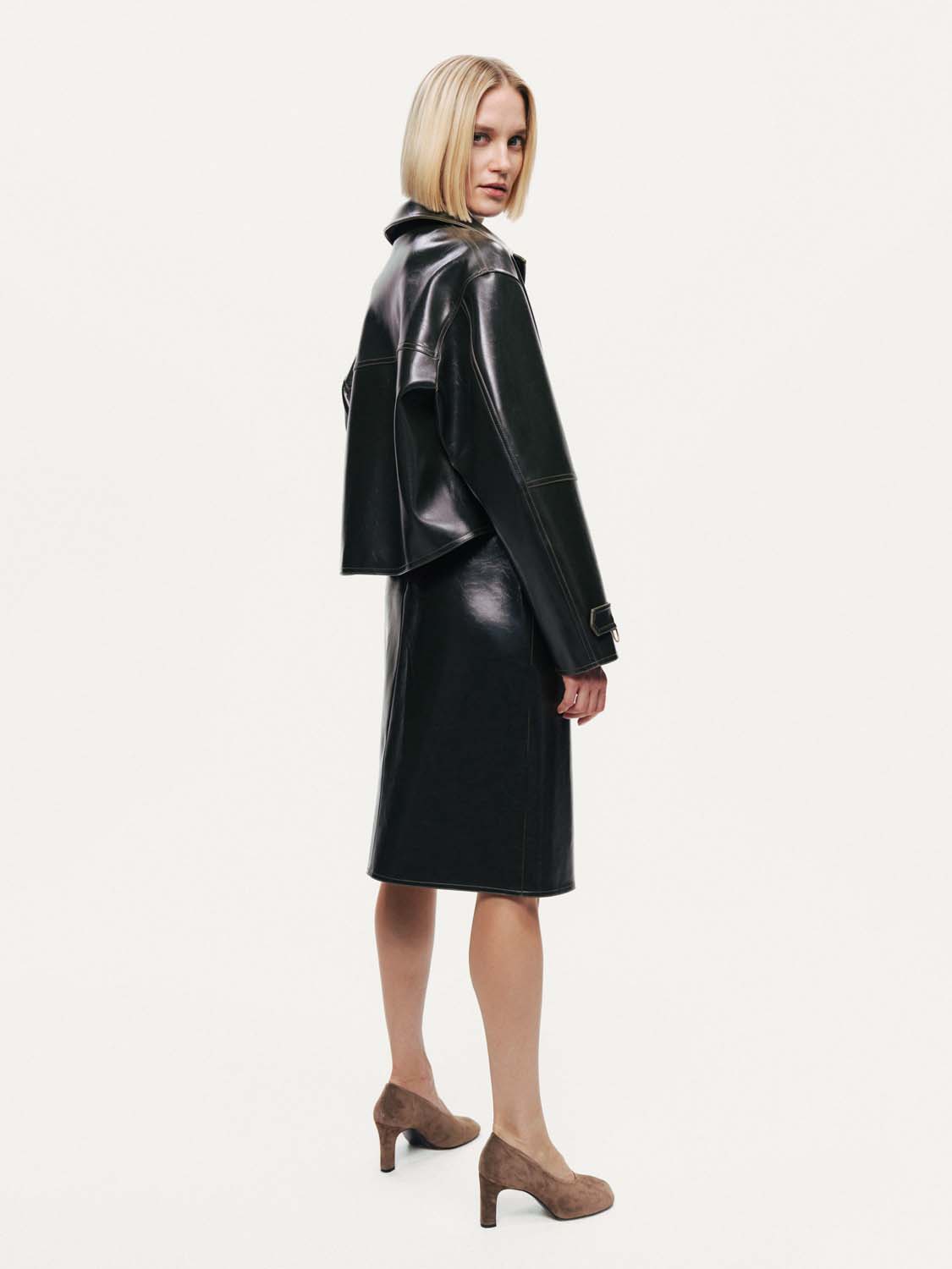 Modern duruşu ve güçlü siluetiyle dikkat çeken bu yırtmaçlı suni deri etek, şehirli şıklığın iddialı bir yorumu. Regular fit kesimi ve tam kalıbı sayesinde vücuda dengeli bir oturuş sağlarken, midi boyu zarif bir denge sunar. Normal bel formu konforlu bir kullanım yaratırken, beldeki metal kanca detayı tasarıma sofistike bir dokunuş katar. Metal fermuar kapaması modern bir bitiş sağlarken, ön yırtmaç detayı özgün bir dinamizm ve feminen bir çekicilik kazandırır. Astarsız dokuma suni deri kumaşıyla sezonun trendlerini yansıtan bu etek, güçlü ve stil sahibi görünümler için mükemmel bir seçim.