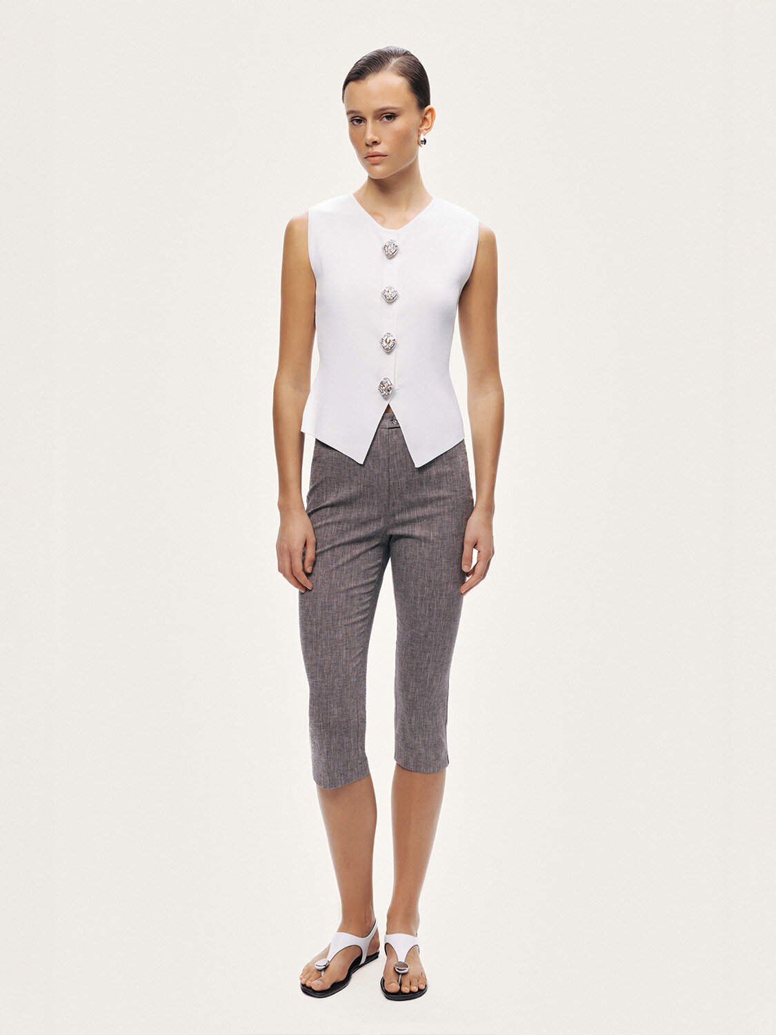 Minimal tasarımı aksesuar düğme detaylarıyla zenginleştirilen bu triko, modern ve zamansız bir stil sunar. Örme kumaşının yumuşak ve esnek yapısı gün boyu konfor sağlarken, regular fit kesimi dengeli bir siluet oluşturur. Sıfır yaka formu sade ve temiz bir görünüm sunarken, kolsuz tasarımı parçayı hem tek başına hem de katmanlı kombinlerde kullanıma uygun hale getirir. Aksesuar düğme detayları tasarıma zarif ve sofistike bir vurgu kazandırır.