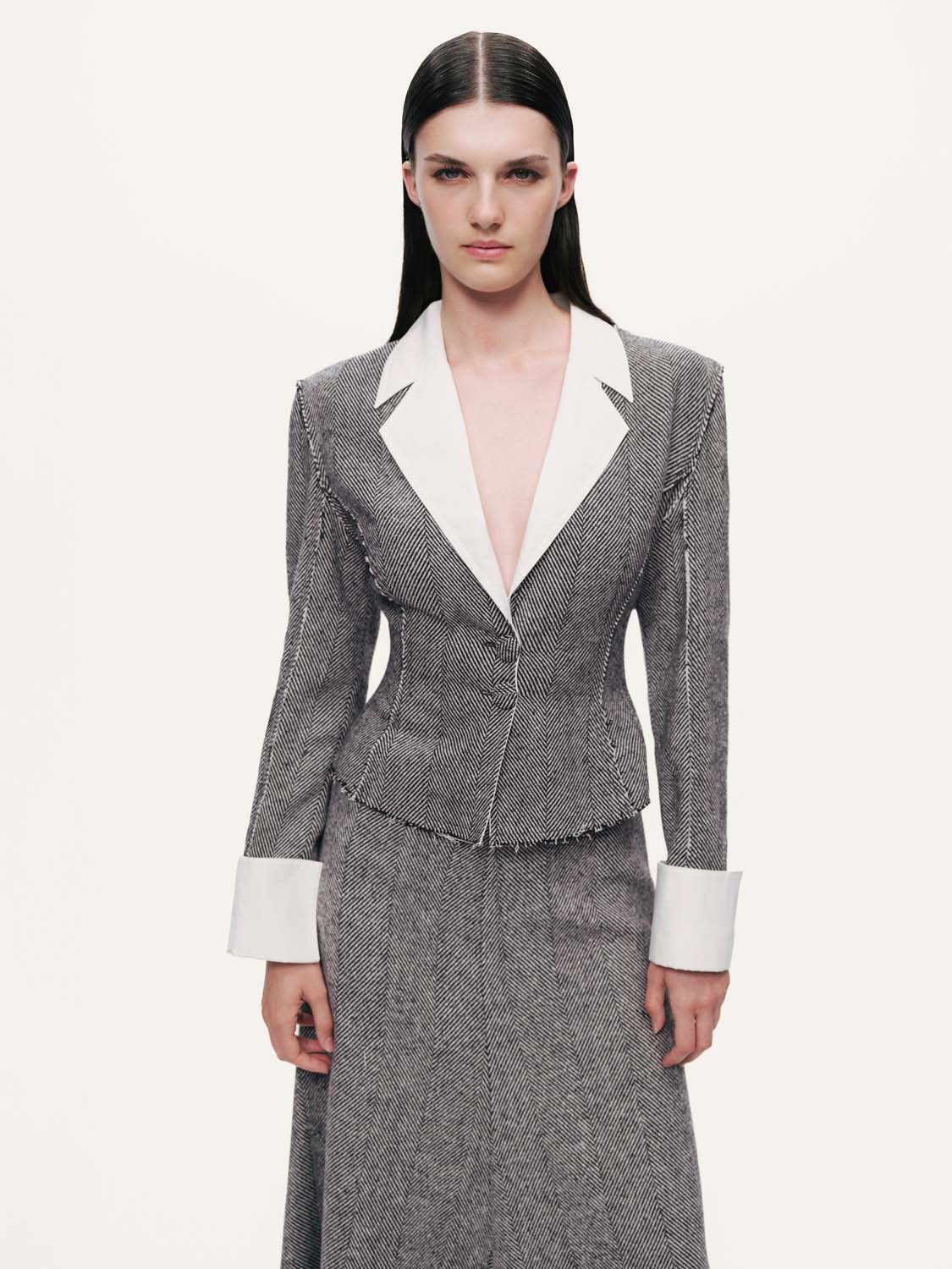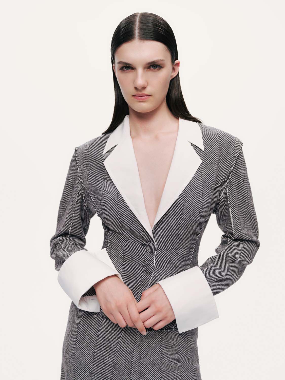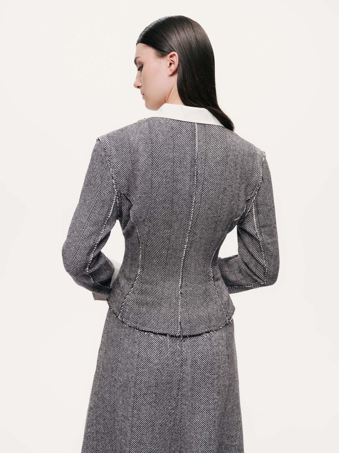 Ürün Açıklaması: Regular fit, tam kalıp, astarsız, dokuma, önden düpme kapamalı, uzun kollu, katlı v yakalı, balenli, balıksırtı desenli, dikiş detaylı ceket