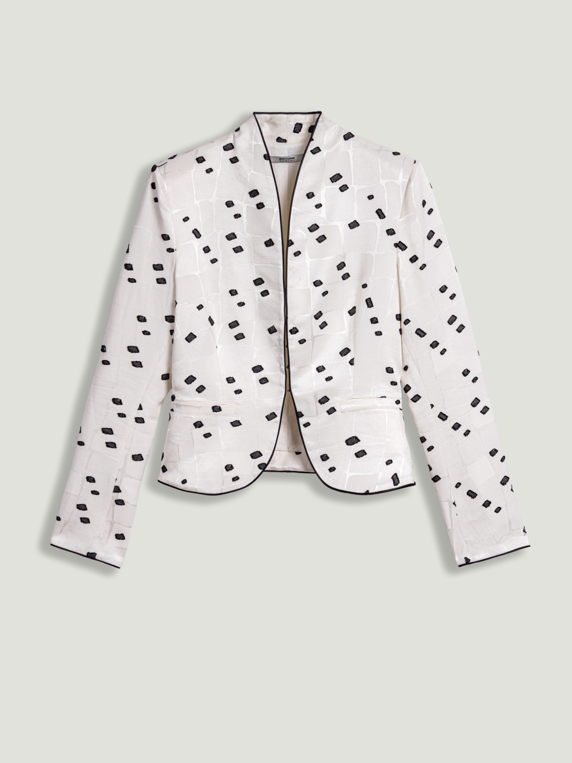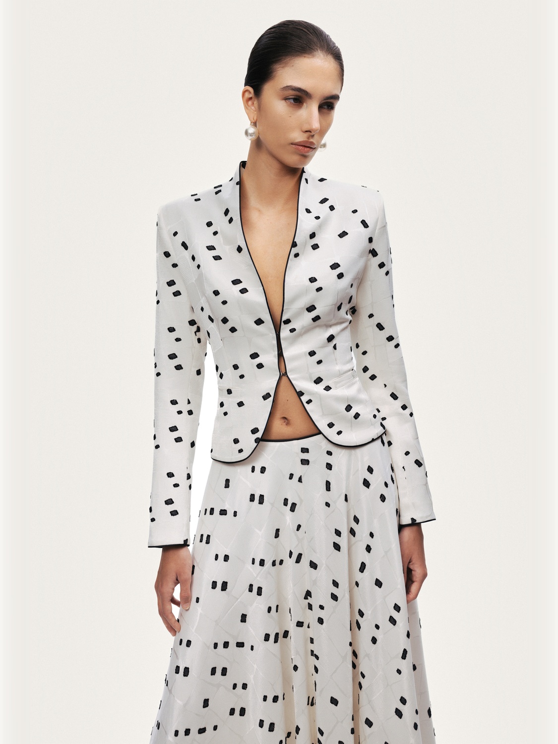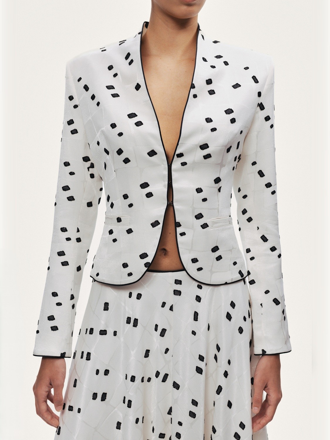 Güçlü omuz formu ve desenli dokusuyla öne çıkan bu ceket, modern ve iddialı bir siluet sunar. Slim fit kesimi vücut hatlarını zarif bir şekilde vurgularken, vatkalı omuz detayı tasarıma karakteristik ve güçlü bir duruş kazandırır. Dokuma kumaşı formunu korurken, astarlı yapısı konforlu ve pürüzsüz bir kullanım sağlar. Hakim yaka tasarımı minimal ve sofistike bir görünüm sunarken, biye detayları cekete özenli bir bitiş kazandırır. Kanca kapama detayı ise temiz ve modern bir ön görünüm oluşturur. Hem ofis stilinde hem de şık kombinlerde rahatlıkla tercih edilebilecek dikkat çekici bir parçadır.