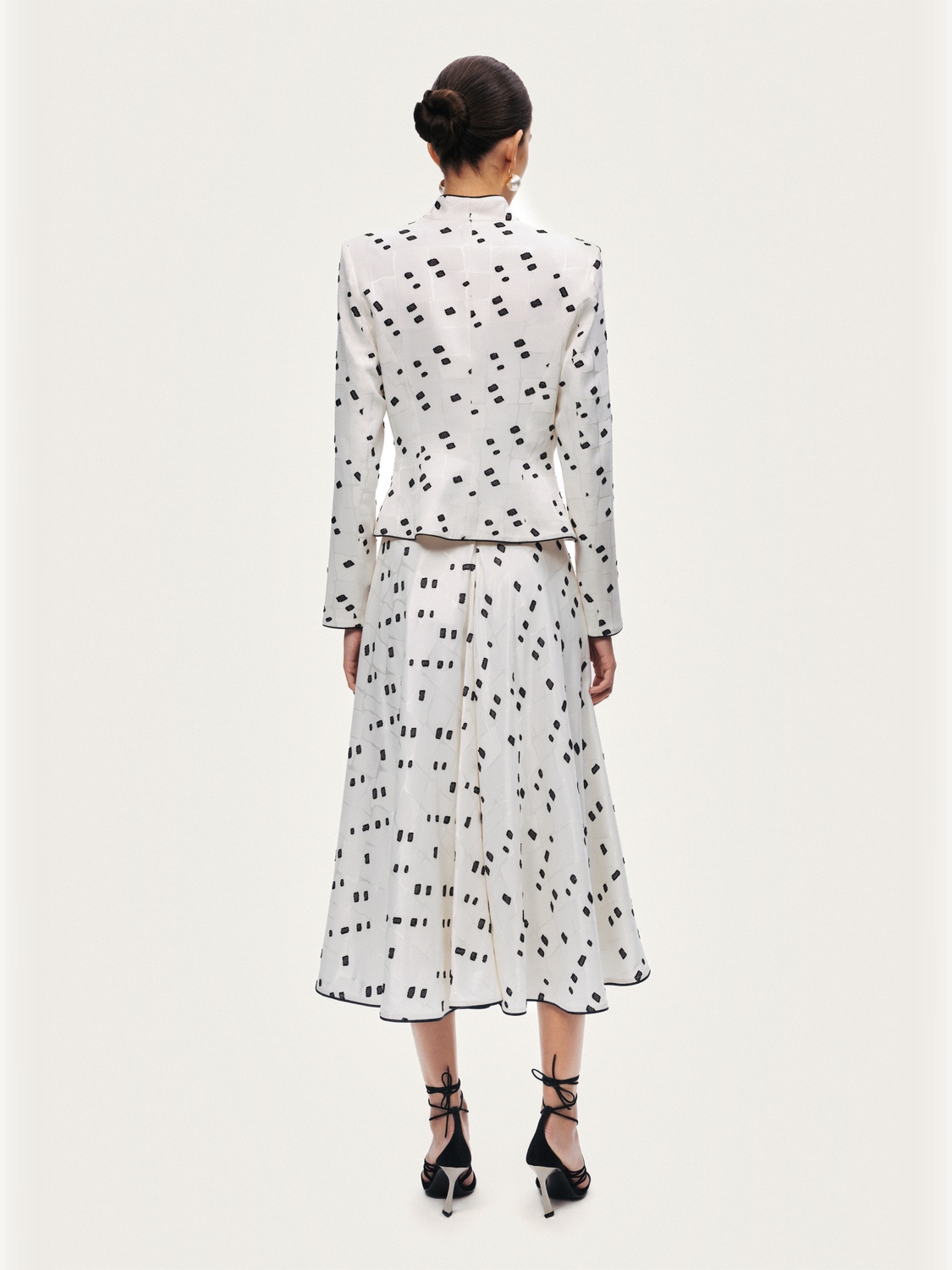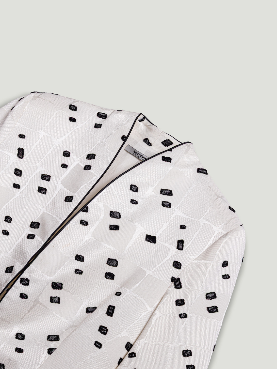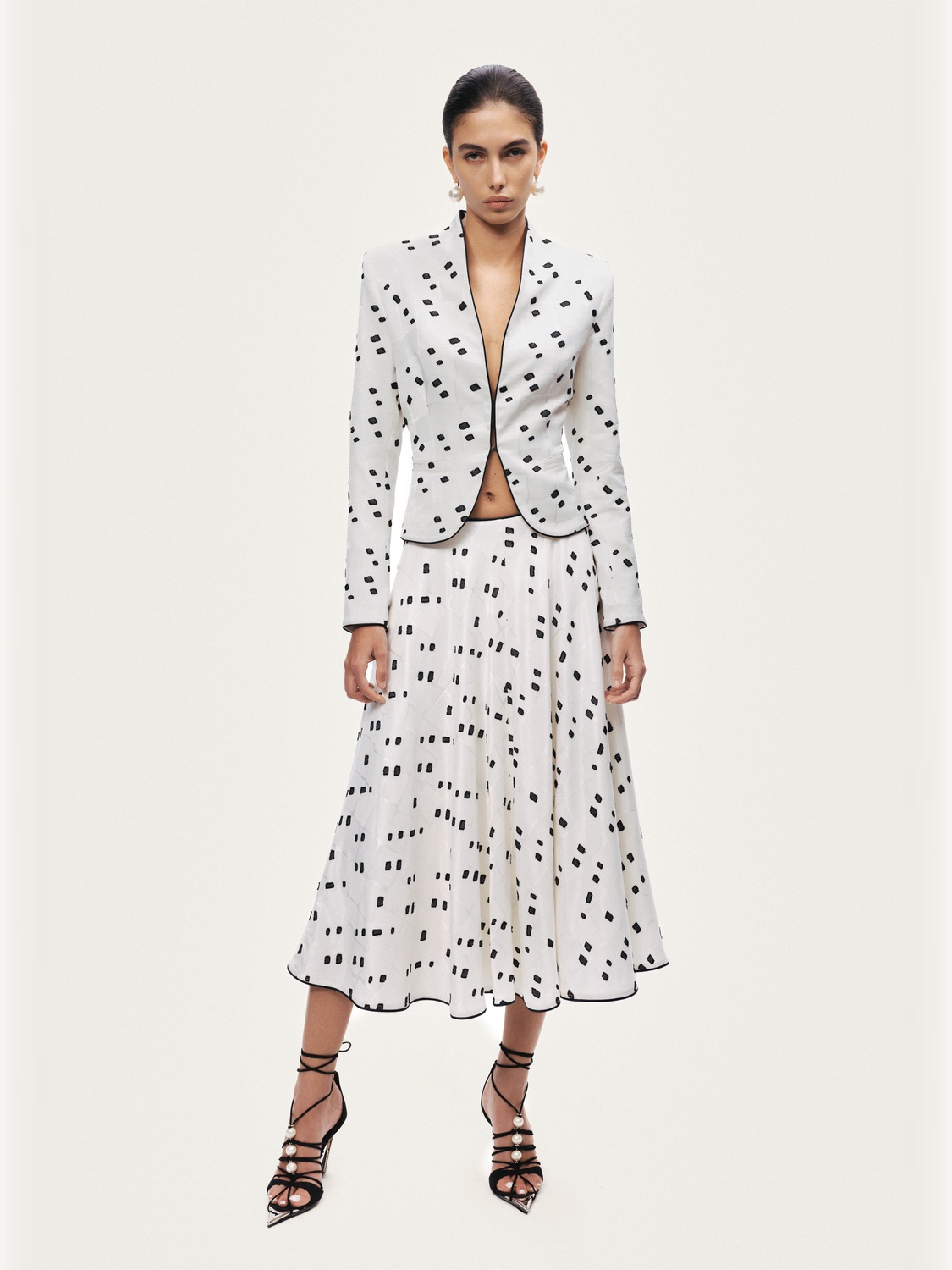 Güçlü omuz formu ve desenli dokusuyla öne çıkan bu ceket, modern ve iddialı bir siluet sunar. Slim fit kesimi vücut hatlarını zarif bir şekilde vurgularken, vatkalı omuz detayı tasarıma karakteristik ve güçlü bir duruş kazandırır. Dokuma kumaşı formunu korurken, astarlı yapısı konforlu ve pürüzsüz bir kullanım sağlar. Hakim yaka tasarımı minimal ve sofistike bir görünüm sunarken, biye detayları cekete özenli bir bitiş kazandırır. Kanca kapama detayı ise temiz ve modern bir ön görünüm oluşturur. Hem ofis stilinde hem de şık kombinlerde rahatlıkla tercih edilebilecek dikkat çekici bir parçadır.
