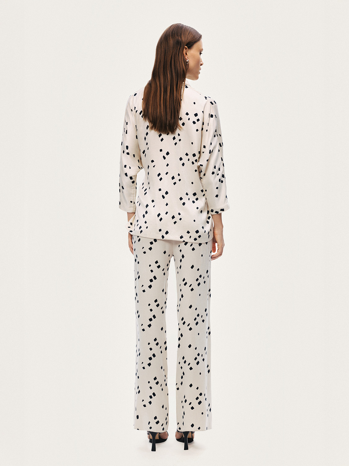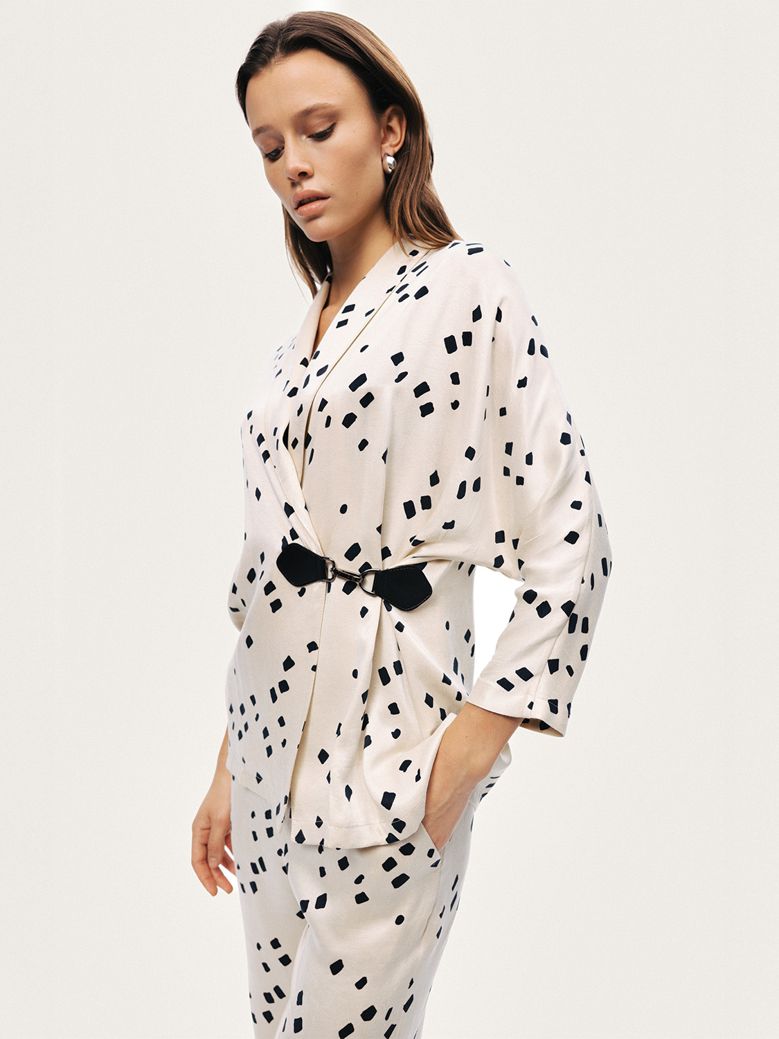 Klasik kruvaze formu eğlenceli puantiye deseniyle buluşturan bu ceket, modern ve feminen bir duruş sunar. Katlı kruvaze V yakası ve kanca kapamasıyla net bir siluet oluştururken, beldeki kemer detayı vücut hatlarını zarifçe vurgular. Astarsız dokuma yapısı sayesinde hafif ve rahat bir kullanım sunan bu parça, günlük şehir stilinden şık davet kombinlerine kadar stilinize karakter katan güçlü bir tamamlayıcıdır.