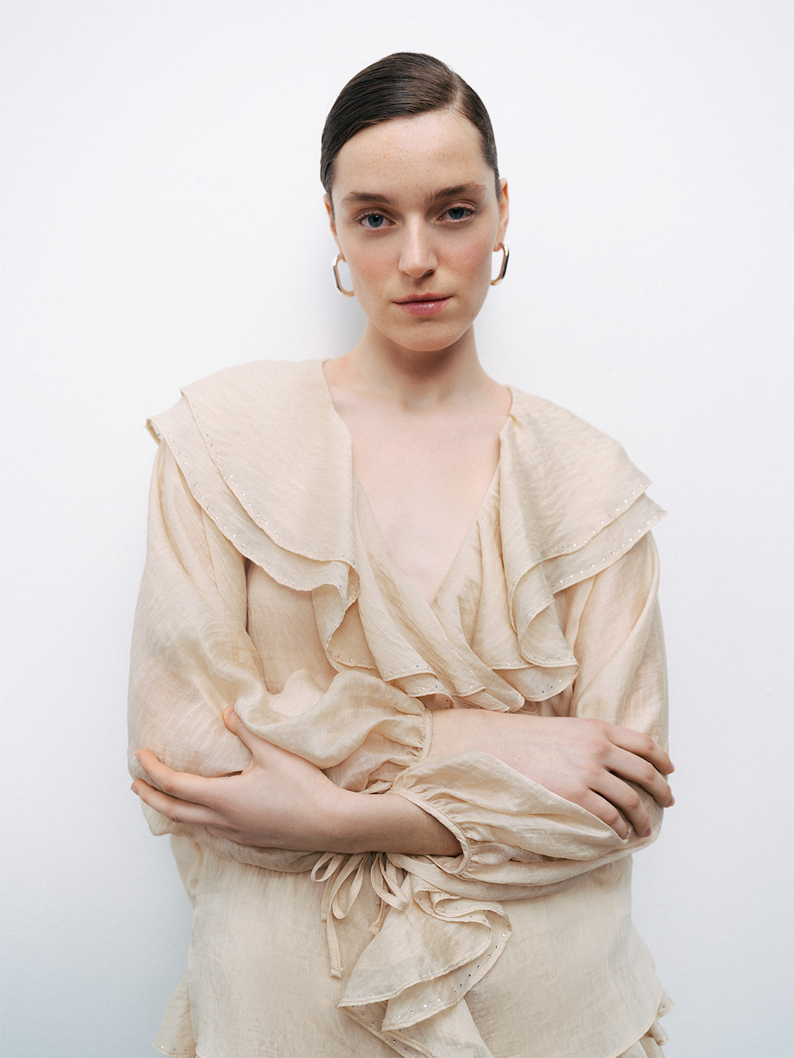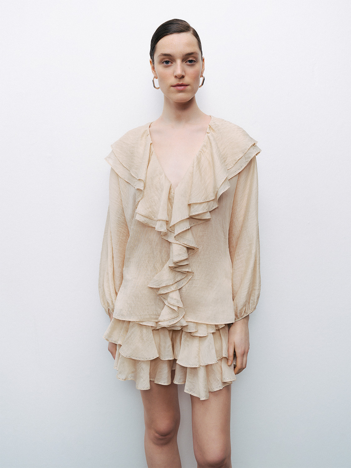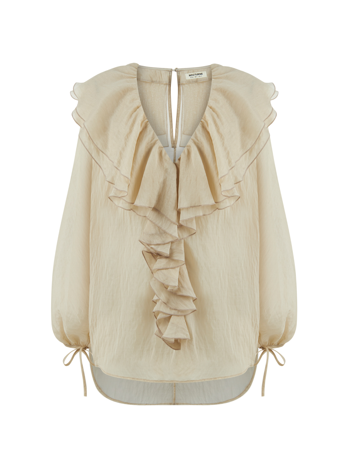 • Ürün Açıklaması: Regular fit, tam kalıp, astarsız, V yaka, yarasa kol, kol uçları büzgülü ve bağlamalı, yapıştırma taşlı volanlı bluz