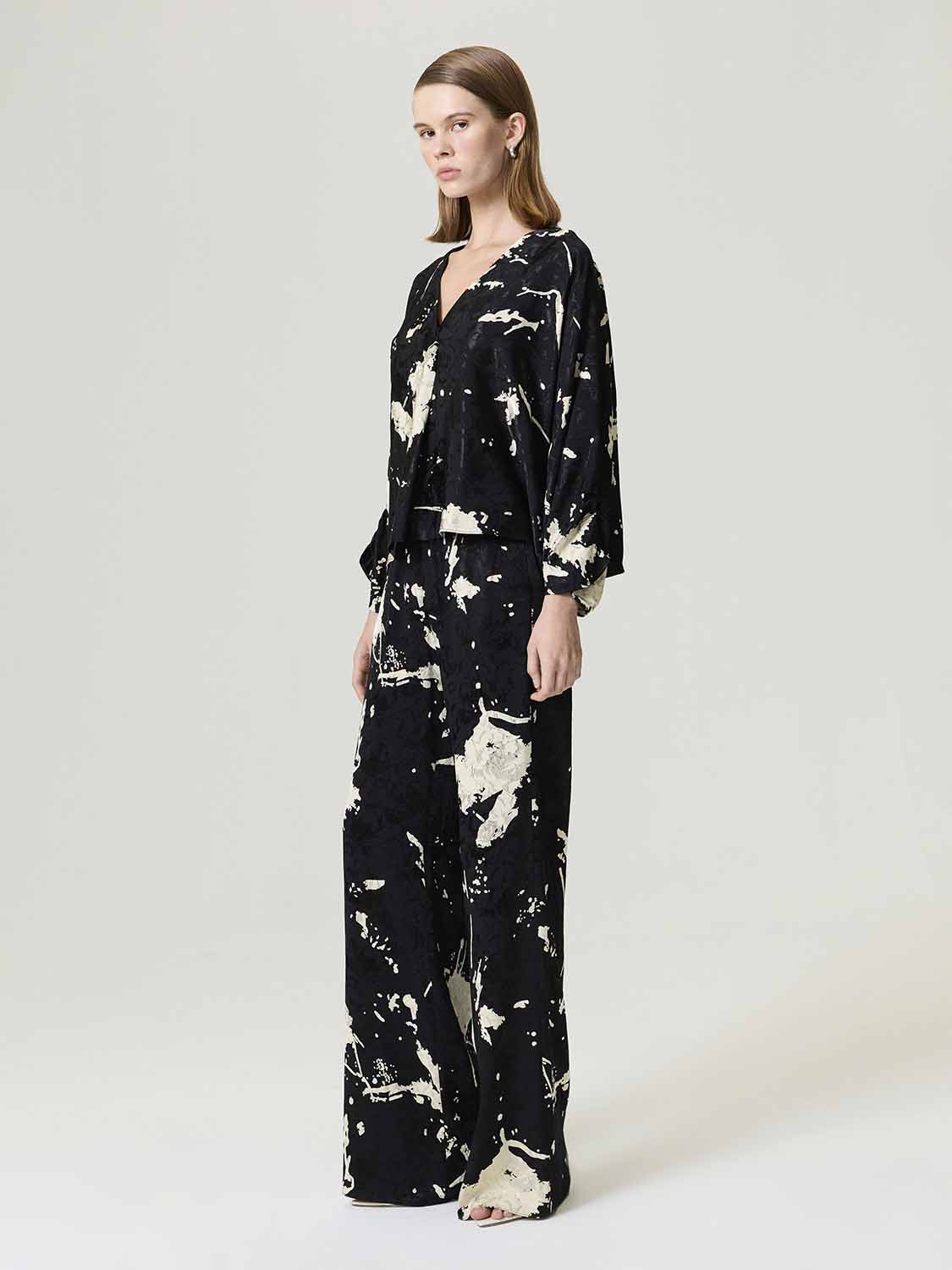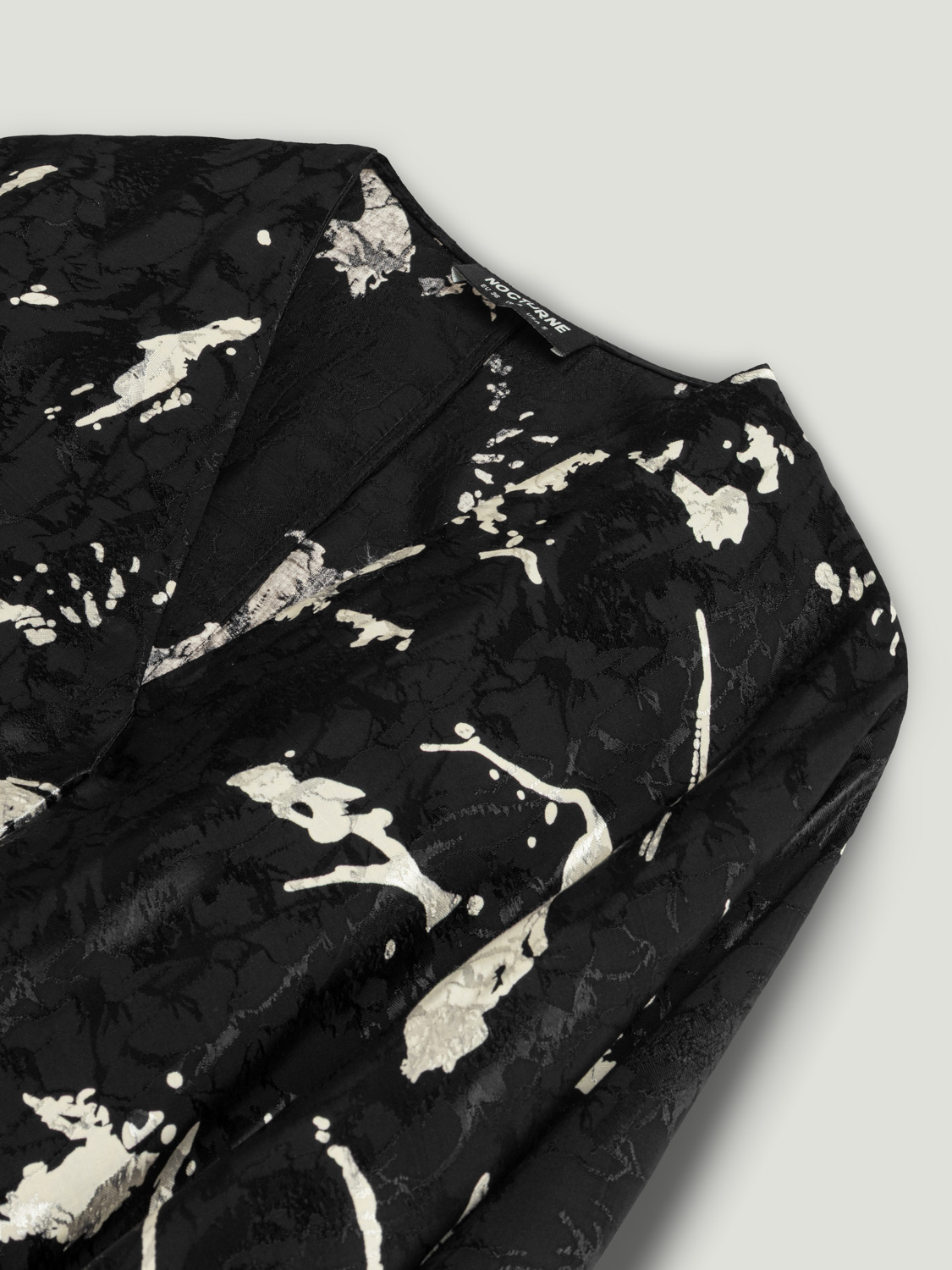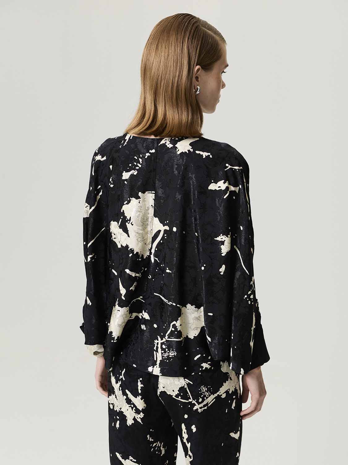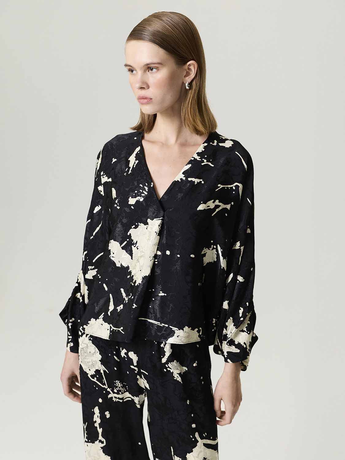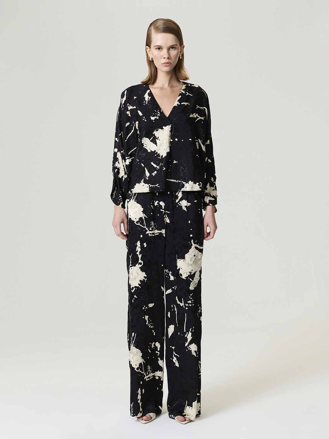 Gardırobunuza zarif bir hareket ve sofistike bir dokunuş katın: Desenli Jakarlı Bluz. Zengin dokuma jakar kumaştan üretilen bu astarsız bluz, ön kısmındaki çapraz kesim ve akıcı sarmal yakasıyla vücutta doğal ve şık bir döküm yaratıyor. Yarasa kollu tasarımı hem hacim hem de dramatik bir hava verirken, büzgülü manşetler özenli ve şık bir bitiriş sunuyor. Sanatsal desenleri sayesinde her bakışta görsel bir ilgi uyandıran bu bluz, iş günlerinden hafta sonu buluşmalarına kadar her kombinle rahatça kullanılabiliyor. Zarif bir etekle veya yüksek belli pantolonlarla kombinleyerek stilinize sofistike bir dokunuş ekleyebilirsiniz.