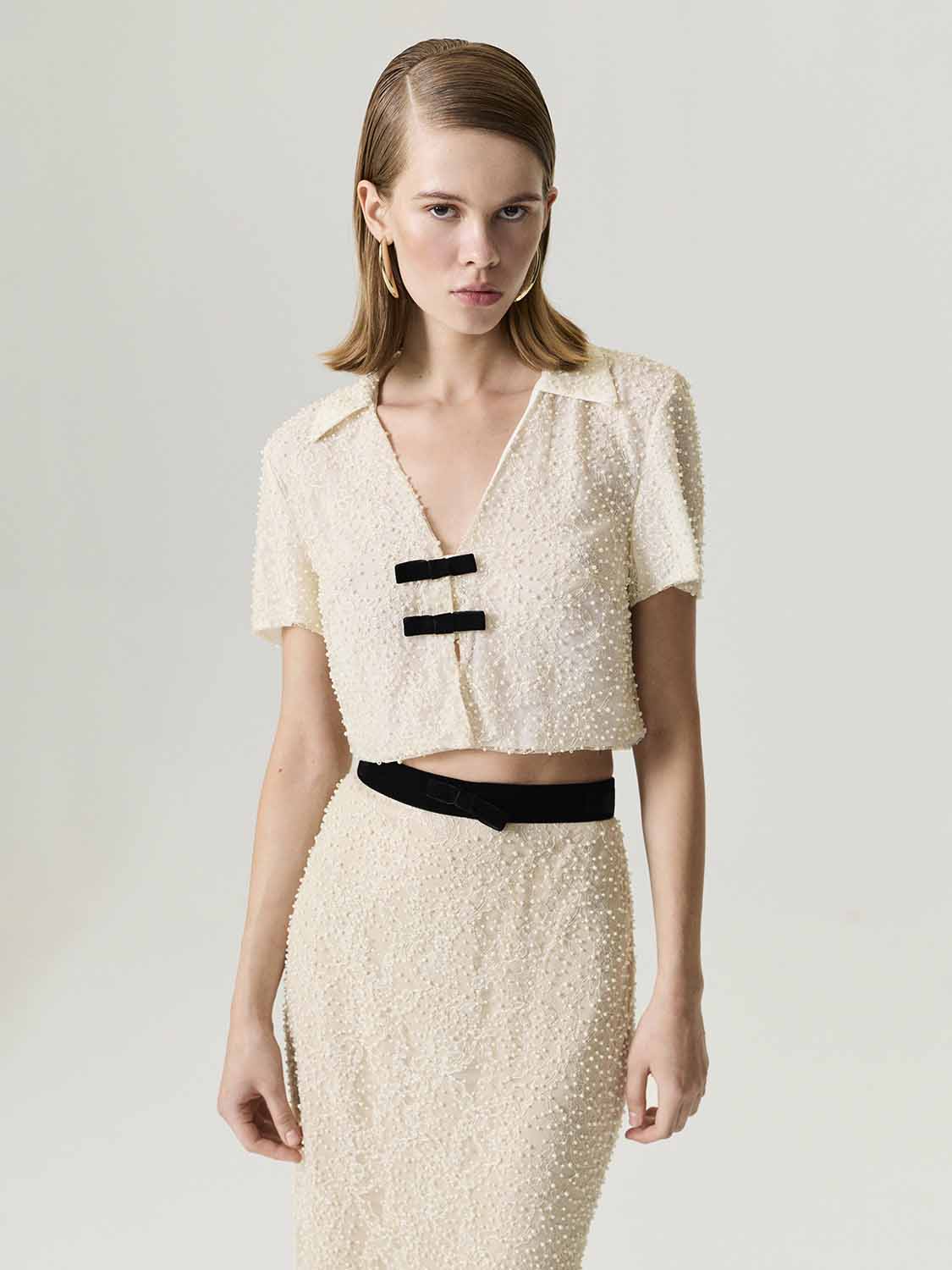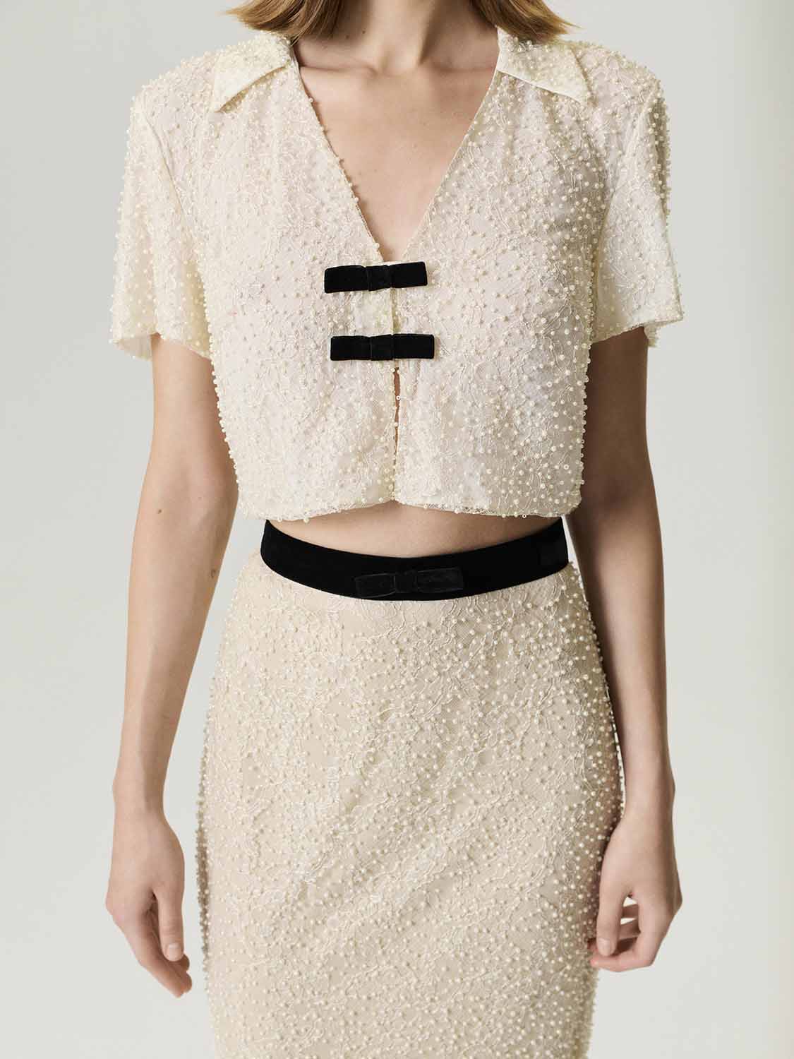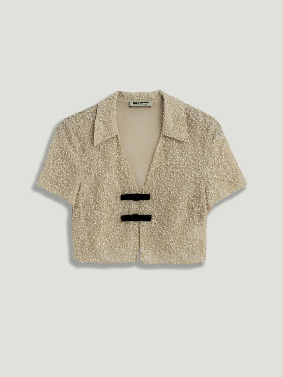 Ürün Açıklaması: Regular fit, tam kalıp, astarlı, dokuma, agraf kapamalı, yarım kollu, katlı v yakalı, inci işlemeli, fiyonk detaylı bluz