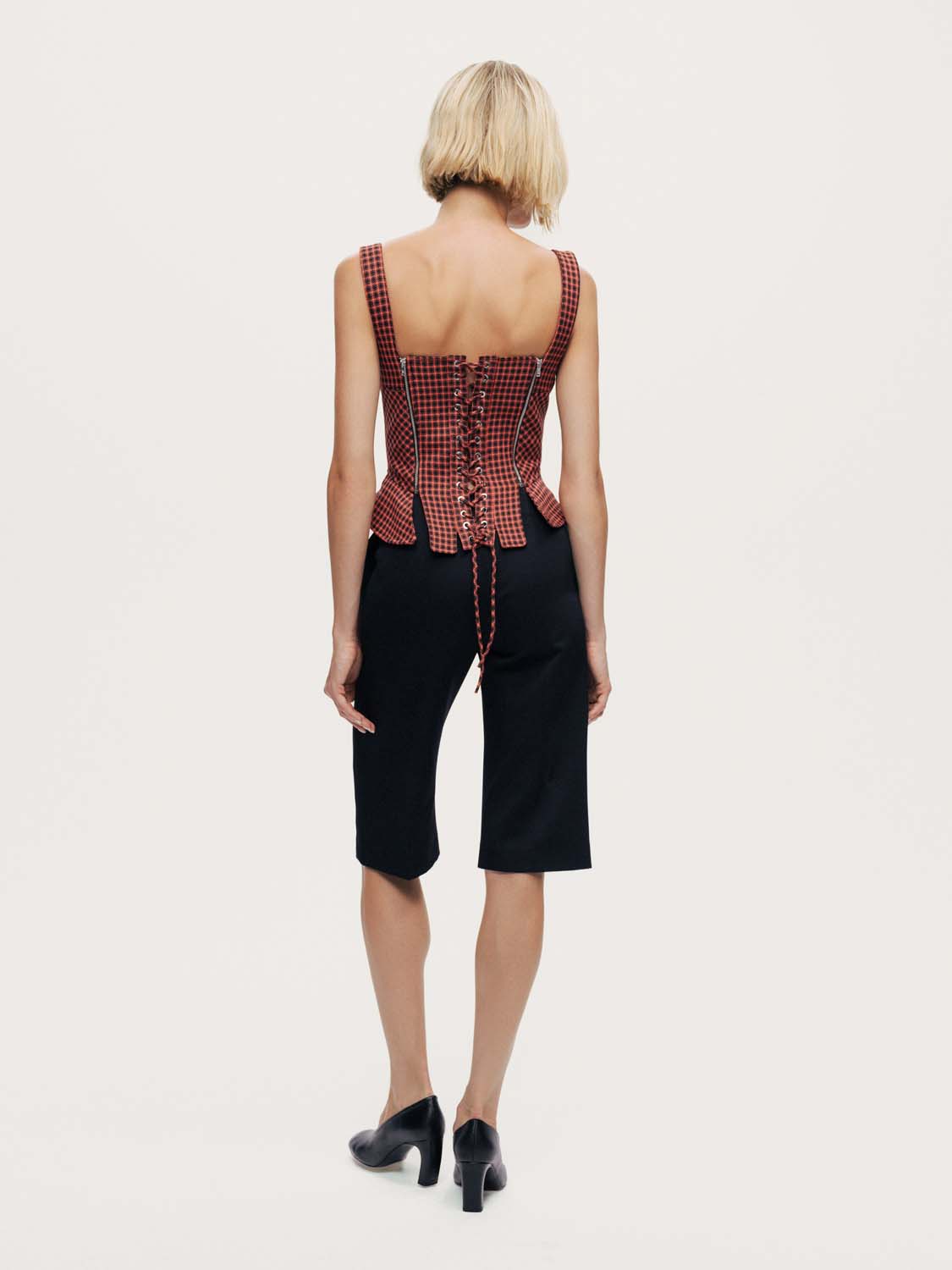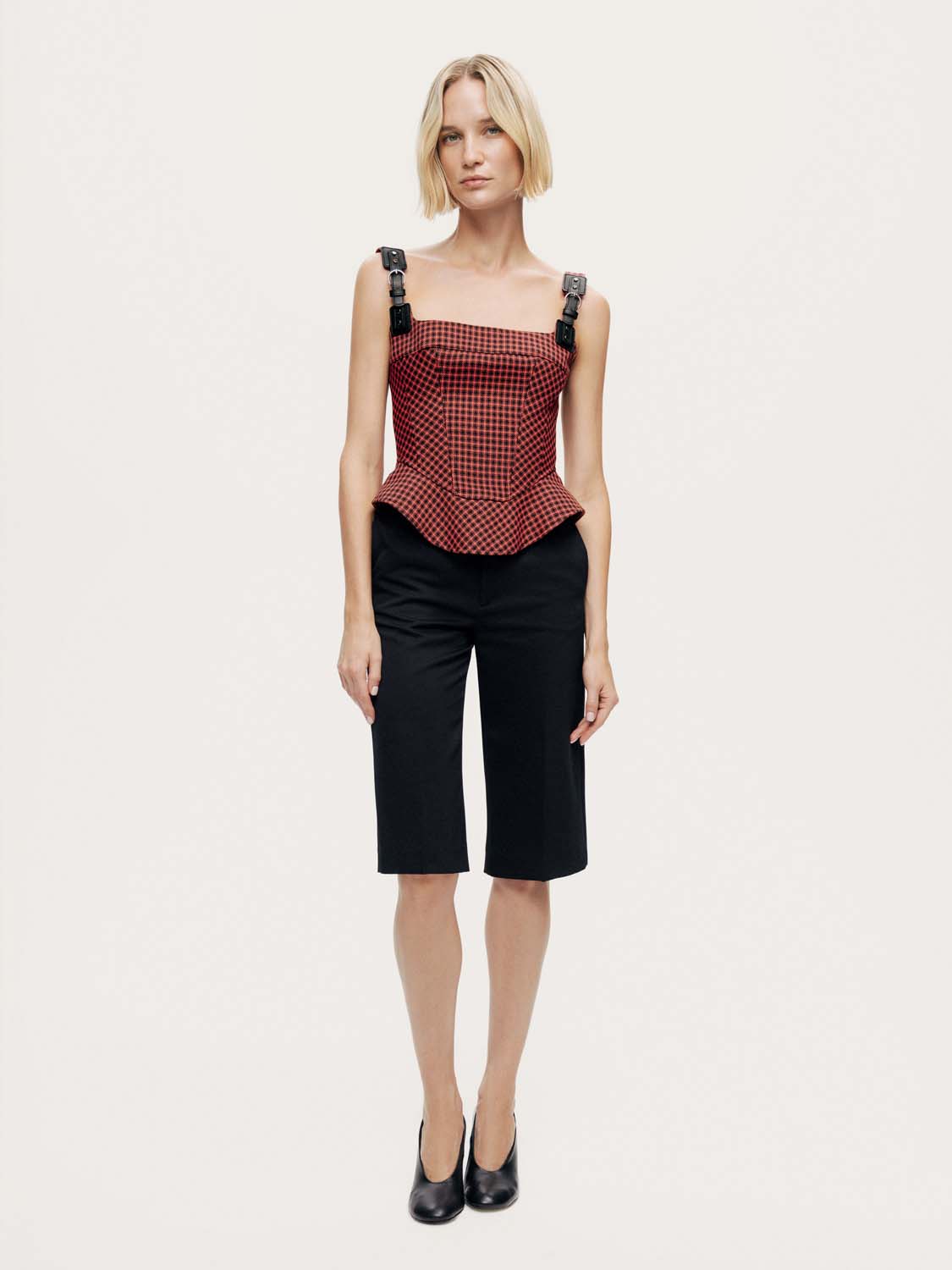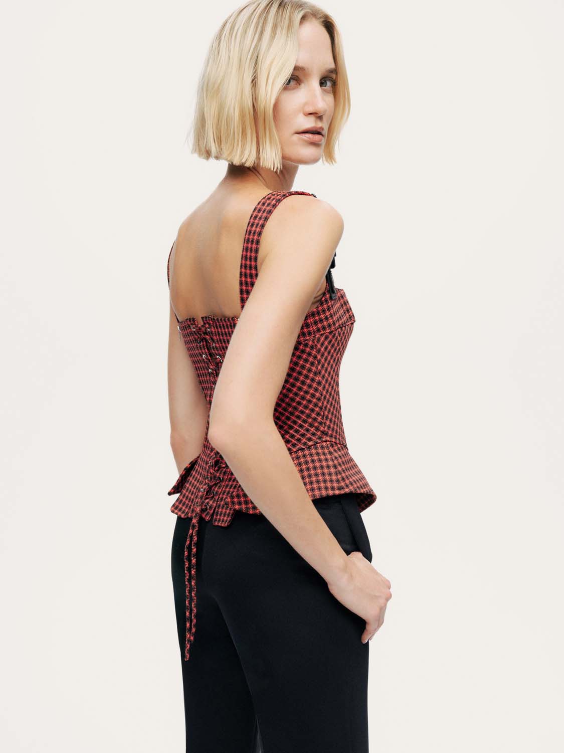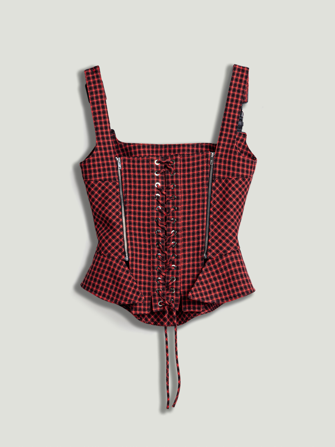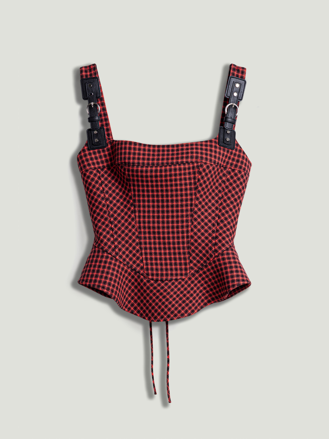 Klasik terziliğin modern bir yorumu olan bu korse esintili üst, kareli dokuma kumaştan ince ve yapılandırılmış bir kesimle üretilmiştir. Kare yaka ve ayarlanabilir tokalı askı detayına sahip olan üst, beli şekillendirdikten sonra ince bir peplum eteğe dönüşür. Şıklığı ve zarafeti zahmetsizce harmanlayan bu üst, iddialı bir görünüm için özel dikim pantolonlar veya uyumlu ekose parçalarla mükemmel bir şekilde uyum sağlar.