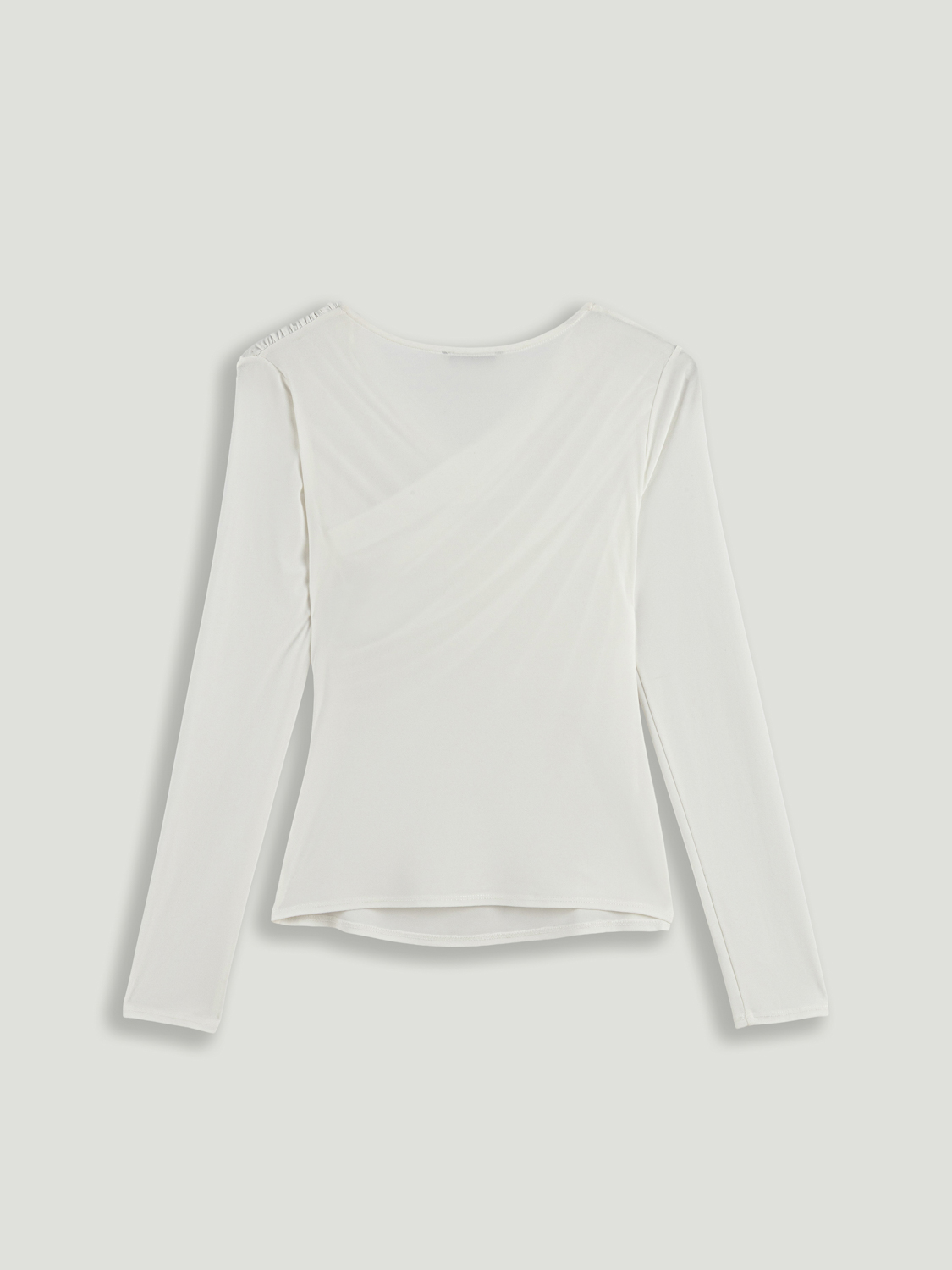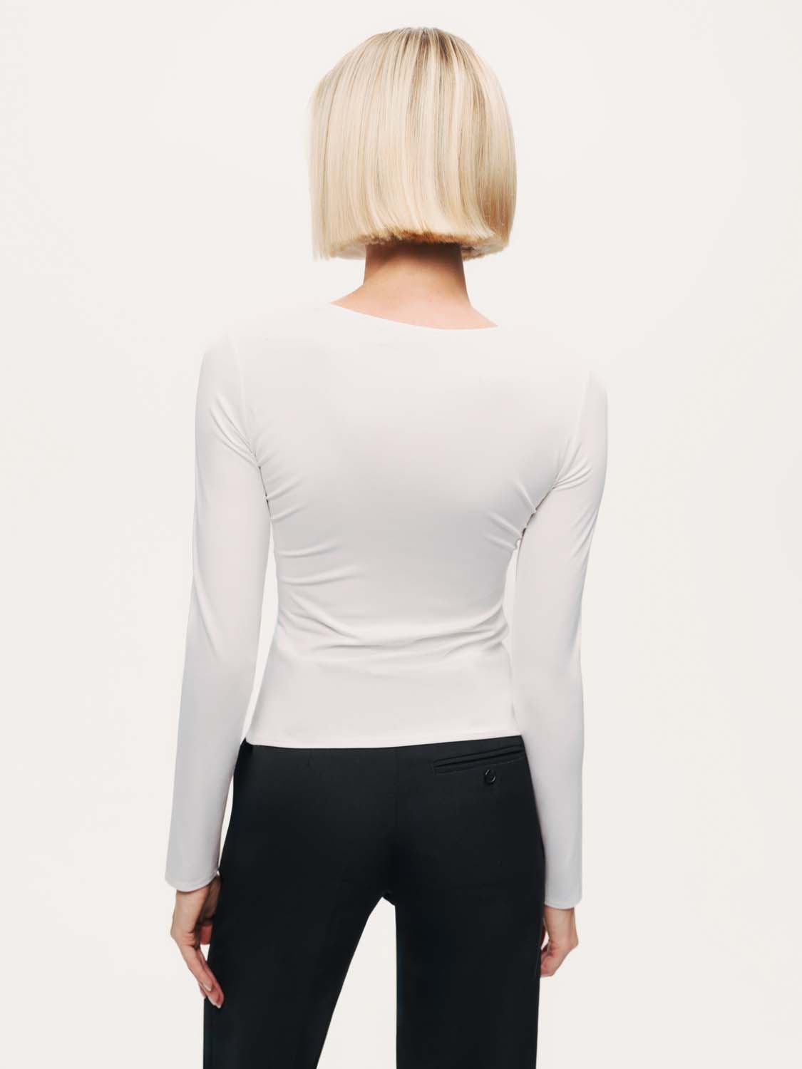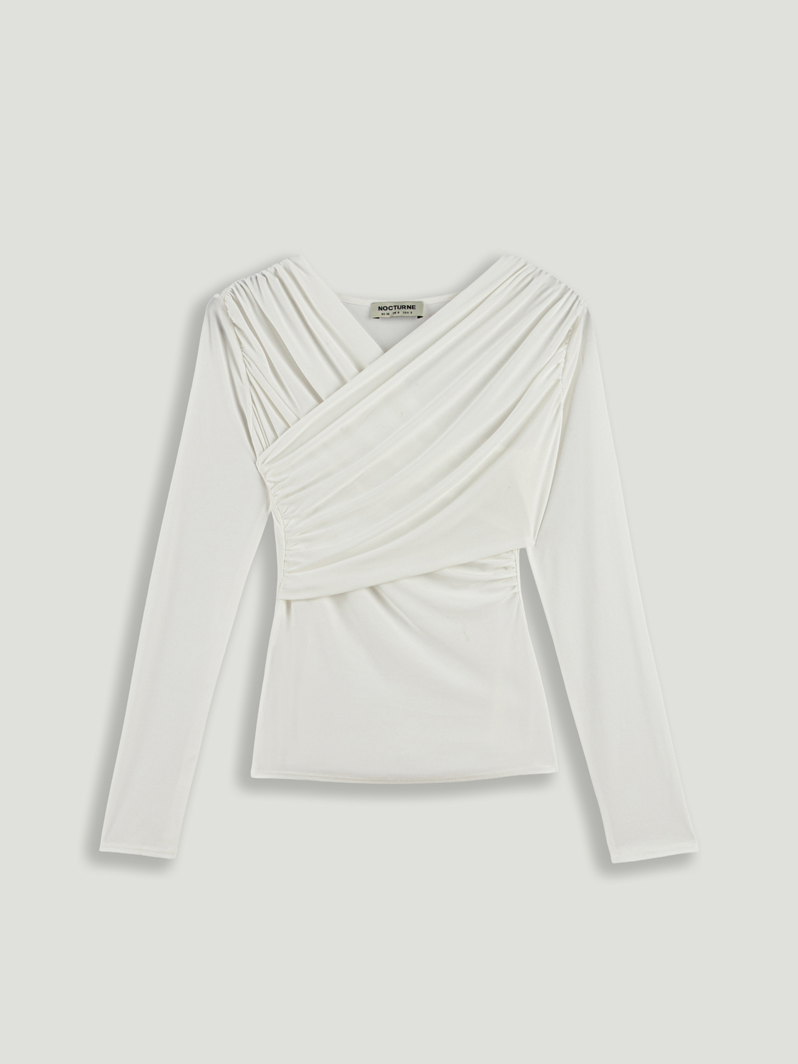 Zahmetsiz bir şıklık için tasarlanan bu dar kesim üst, vücuda tam oturan yumuşak ve esnek kumaştan üretilmiştir. Yuvarlak yakalı ve uzun kollu olan bu üst, silüete derinlik ve hareket katan asimetrik dökümlü ön kısmıyla öne çıkar. Düz etek ucuyla tamamlanan bu üst, hem şık ofis görünümleri hem de şık gece stilleri için mükemmel bir tamamlayıcıdır.