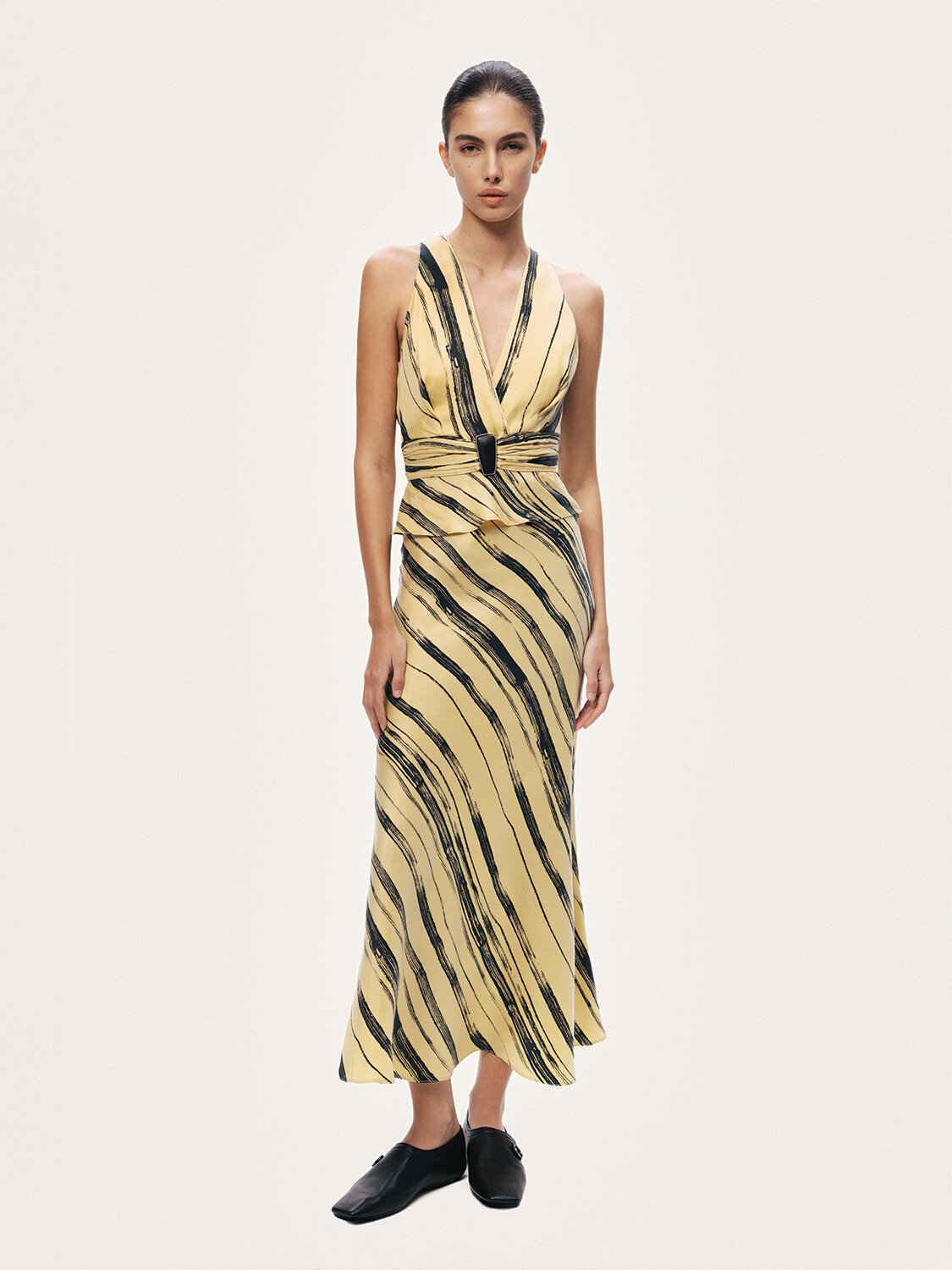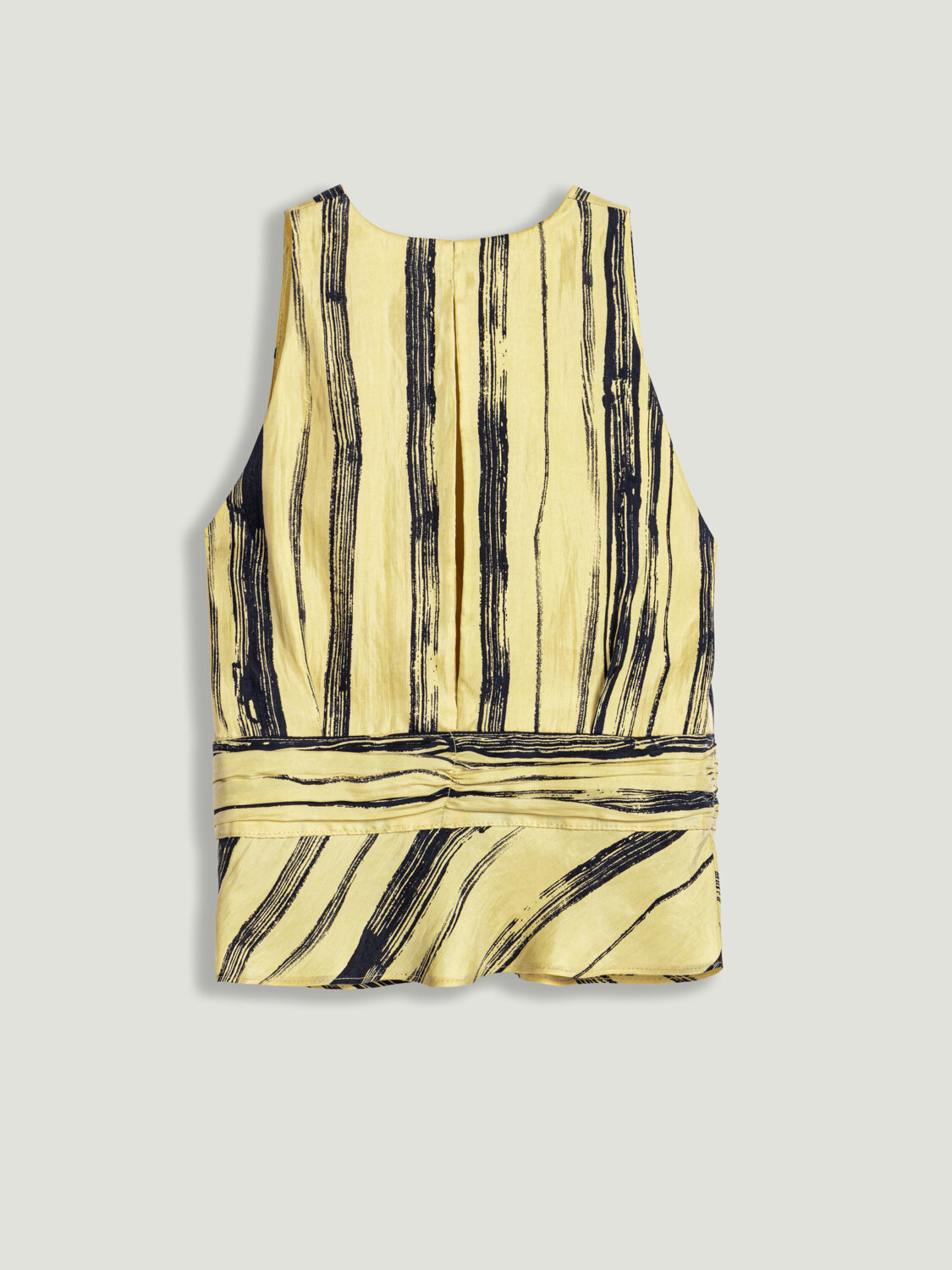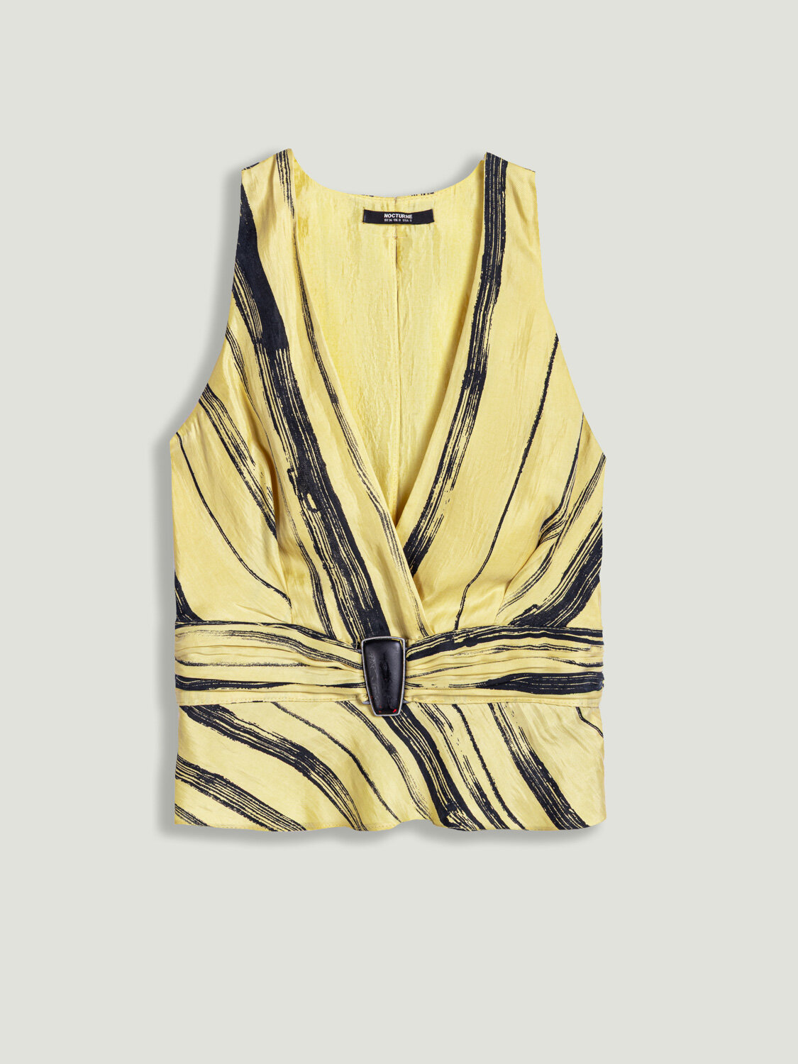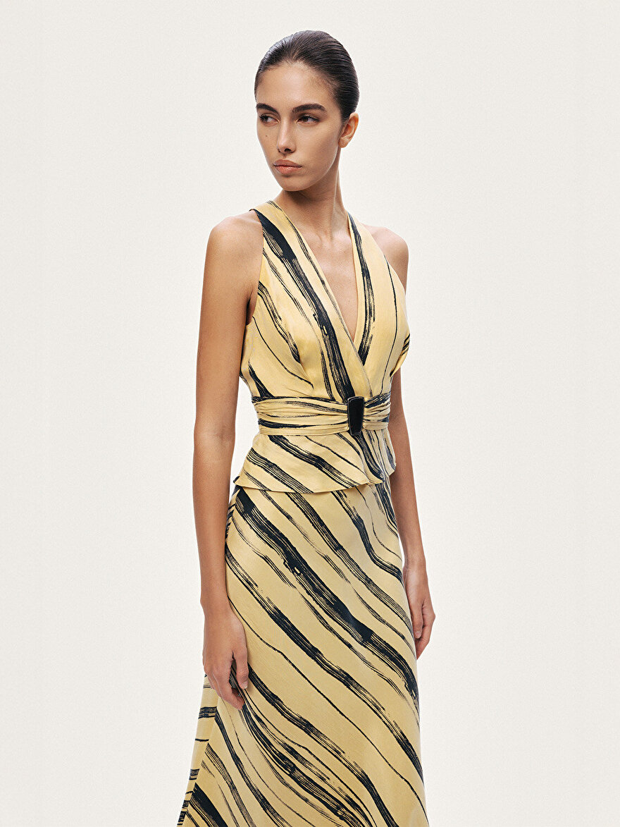 Çizgili deseni ve aksesuar vurgusuyla öne çıkan bu bluz, klasik formu modern detaylarla buluşturur. Dokuma kumaşının yapılı duruşu silueti desteklerken, regular fit kesimi dengeli ve rahat bir kullanım sunar. Kruvaze V yaka tasarımı feminen bir görünüm kazandırırken, bel kısmındaki aksesuar detayı silueti vurgulayarak tasarıma sofistike bir dokunuş ekler. Kolsuz formu sayesinde hem tek başına hem de ceket altı kombinlerde rahatlıkla tercih edilebilir. İnce gizli fermuar kapama ise temiz ve minimal bir bitiş sağlar.
