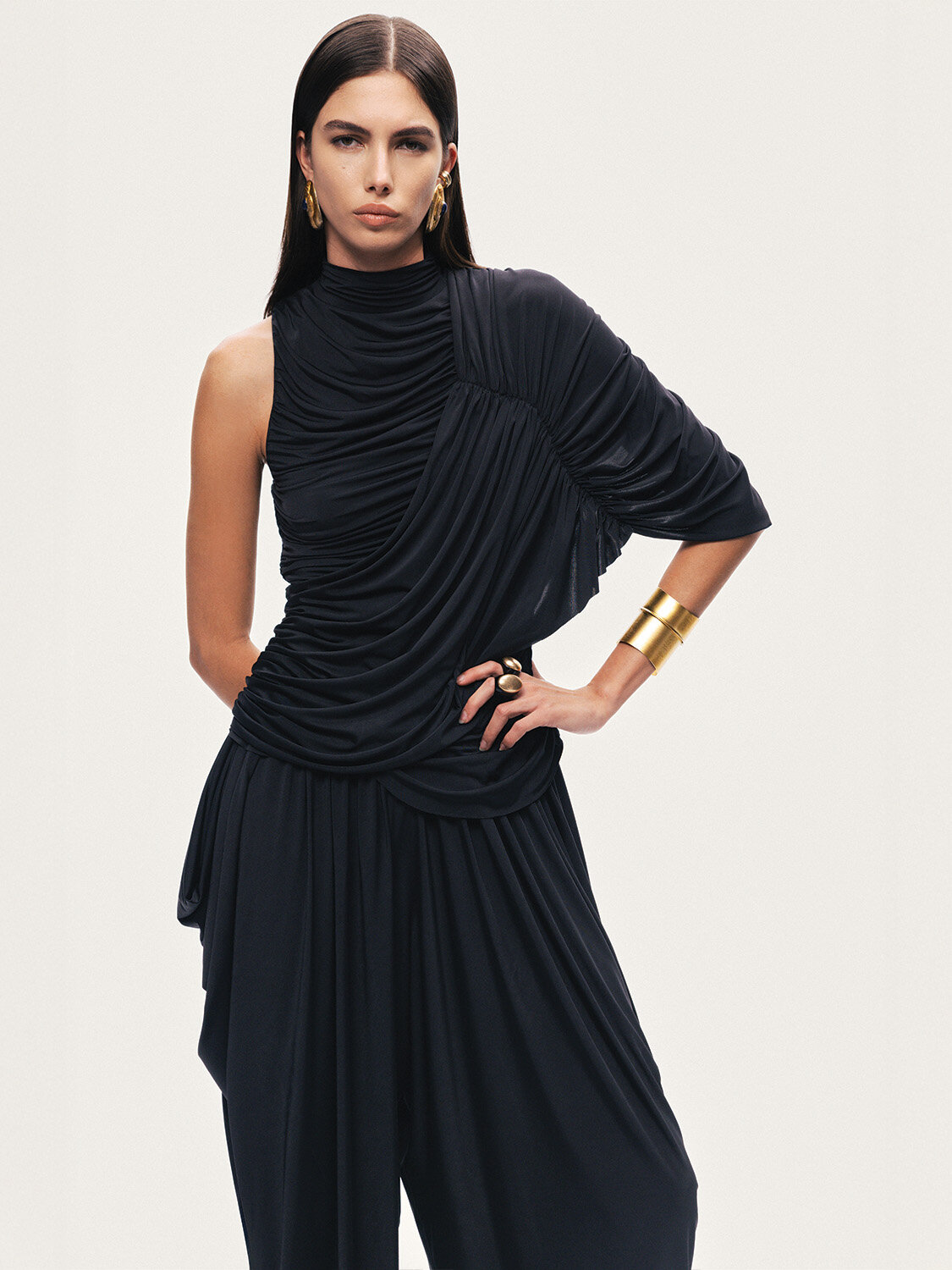 Modern ve iddialı bir siluet sunan bu tasarım, slim fit kesimiyle vücudu zarifçe sararken örme kumaşın esnek ve konforlu yapısıyla gün boyu rahatlık sağlar. Dik yaka detayı güçlü ve sofistike bir duruş kazandırırken, asimetrik kol tasarımı modele çağdaş ve dikkat çekici bir karakter katar. Drapeli formu ise hareketli ve akışkan bir görünüm oluşturarak tasarıma feminen bir dokunuş ekler; hem şehir stilinde hem de şık kombinlerde öne çıkan modern bir tamamlayıcı olur.