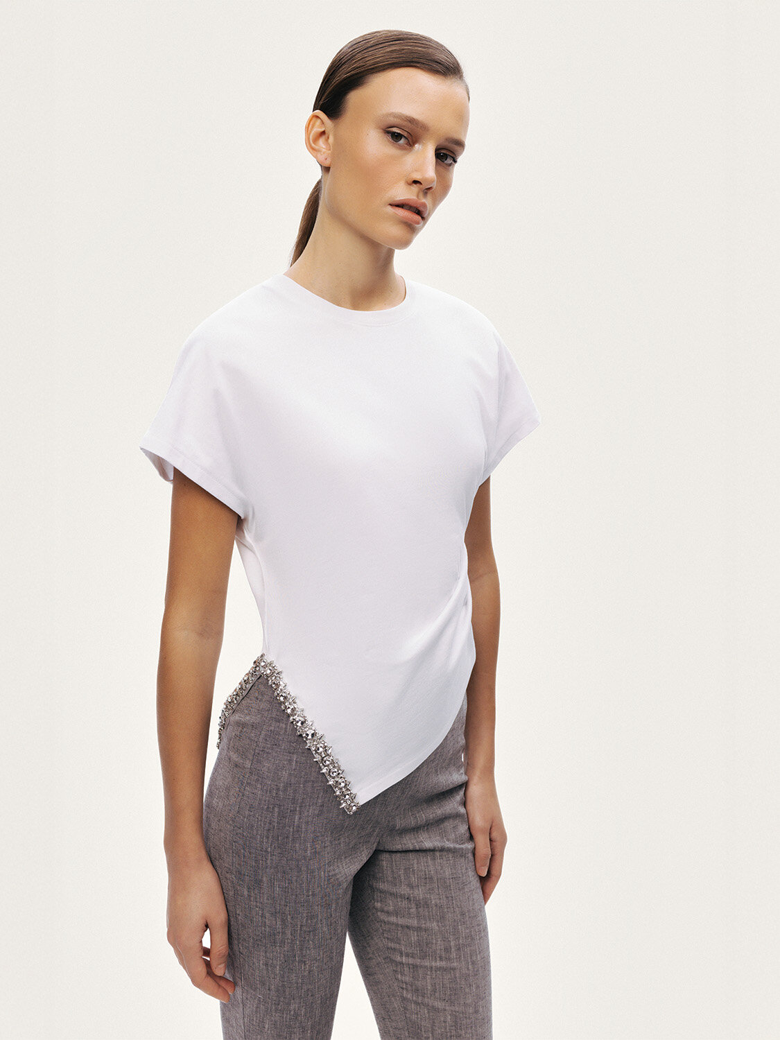 Sade şıklığı ışıltılı dokunuşlarla buluşturan bu tasarım, slim fit kesimiyle vücudu zarifçe sararak modern ve feminen bir siluet oluşturur. Örme kumaşın yumuşak ve konforlu yapısı gün boyu rahatlık sağlarken, kısa kollu formu ve sıfır yaka detayı zamansız bir görünüm sunar. Tasarıma hareket katan taş detayları ise minimal çizgiye sofistike bir ışıltı ekleyerek hem günlük kombinlere hem de şehir stiline dikkat çekici bir dokunuş kazandırır.