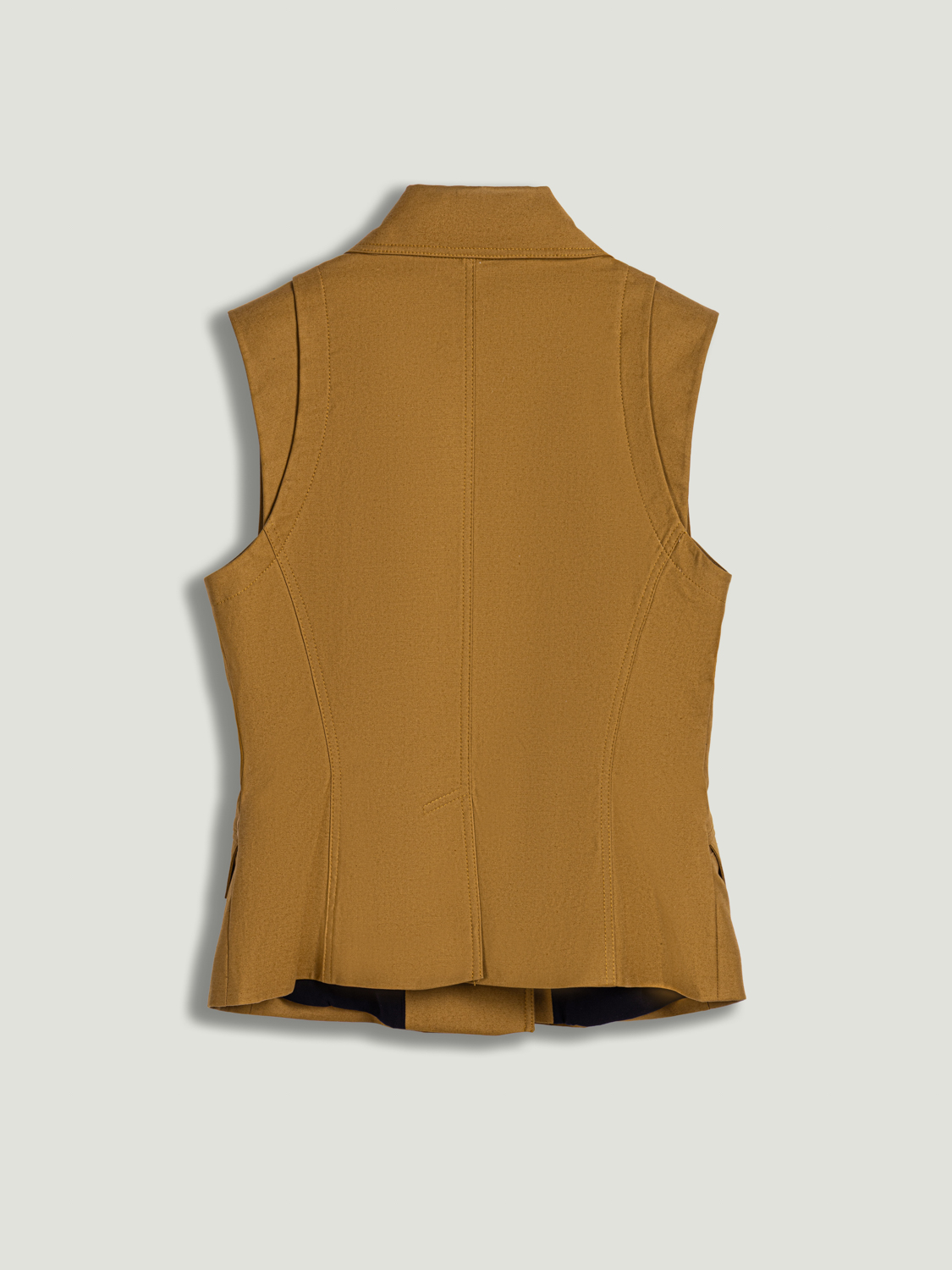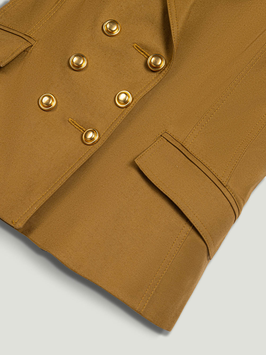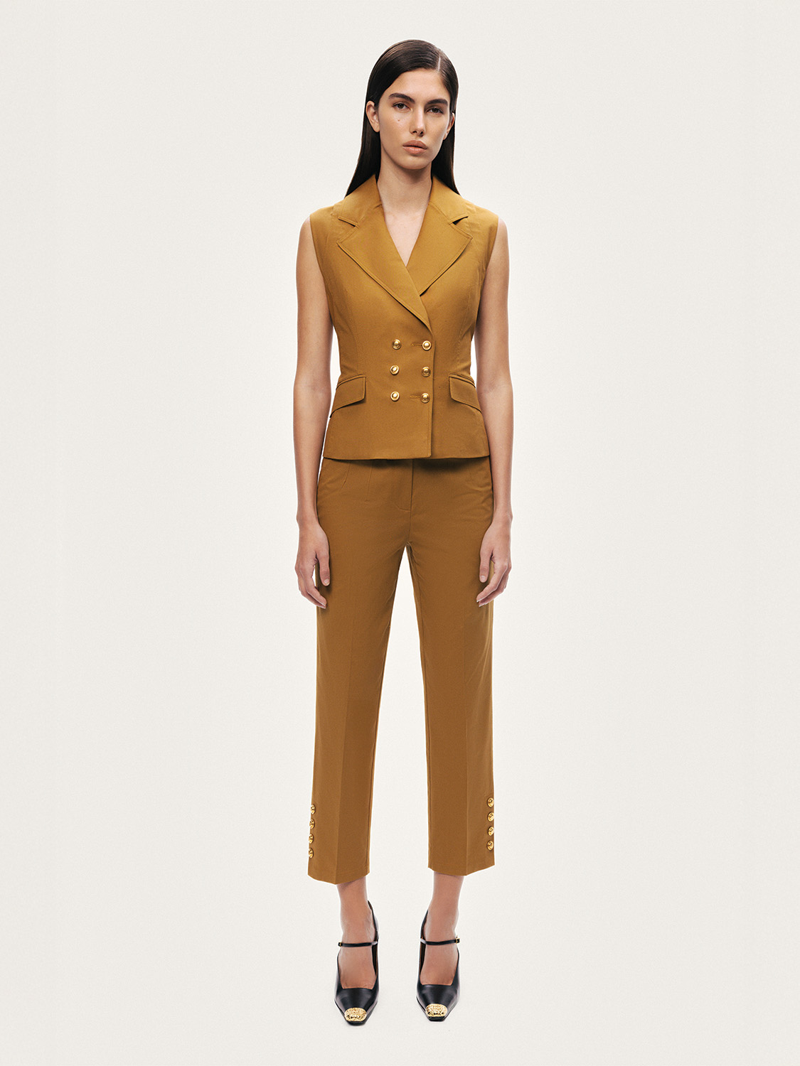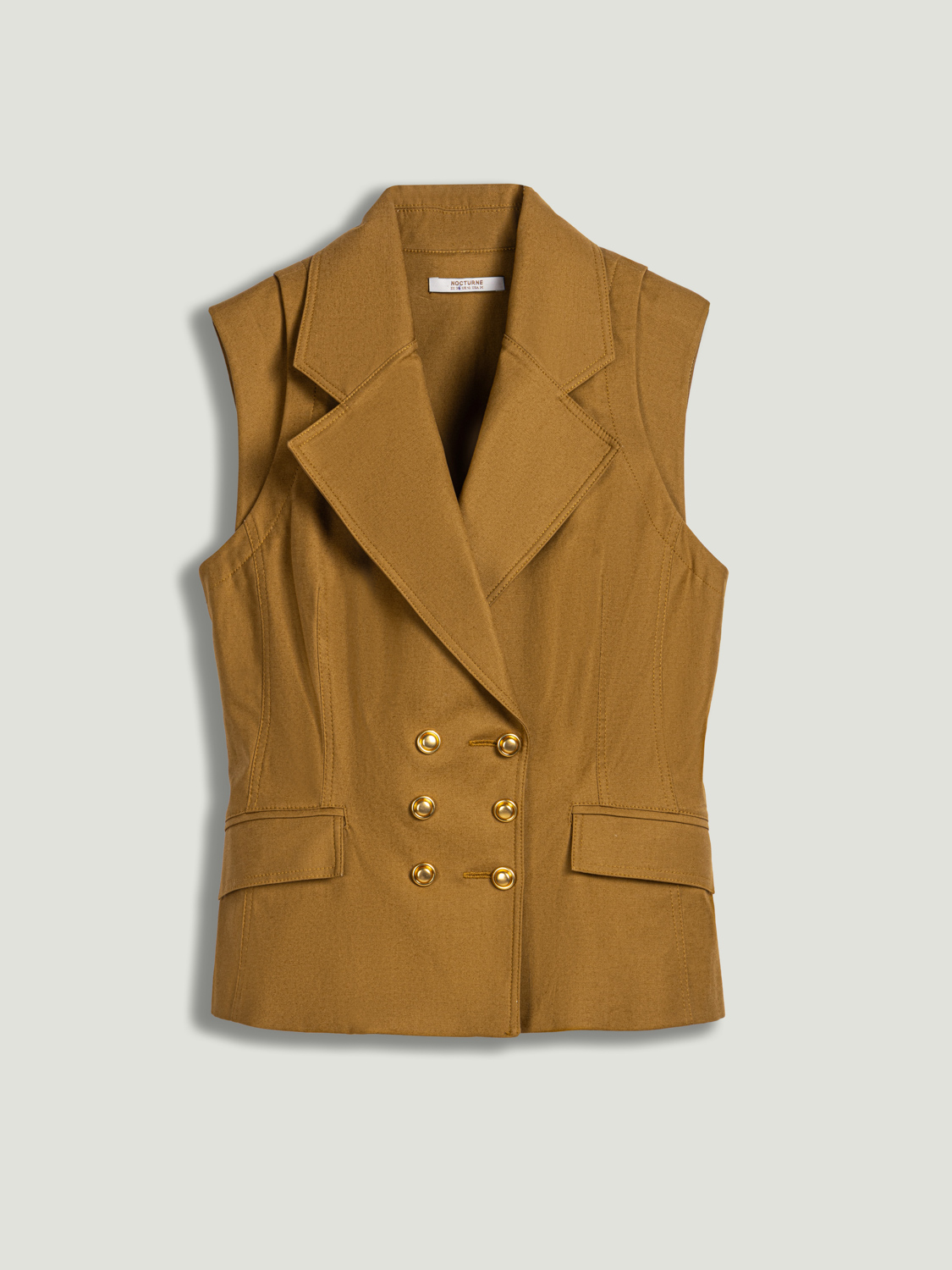 Gold detaylarıyla sofistike bir dokunuş kazanan bu kruvaze yelek, modern ve güçlü bir siluet sunar. Katlı V yaka formu ve kolsuz tasarımıyla hem tek başına hem de katmanlı kombinlerde şıklığı tamamlar. Astarlı dokuma kumaşı ve çıtçıt kapamasıyla konforu korurken, zarif gold detayları sayesinde gündüzden geceye kolayca uyum sağlar.