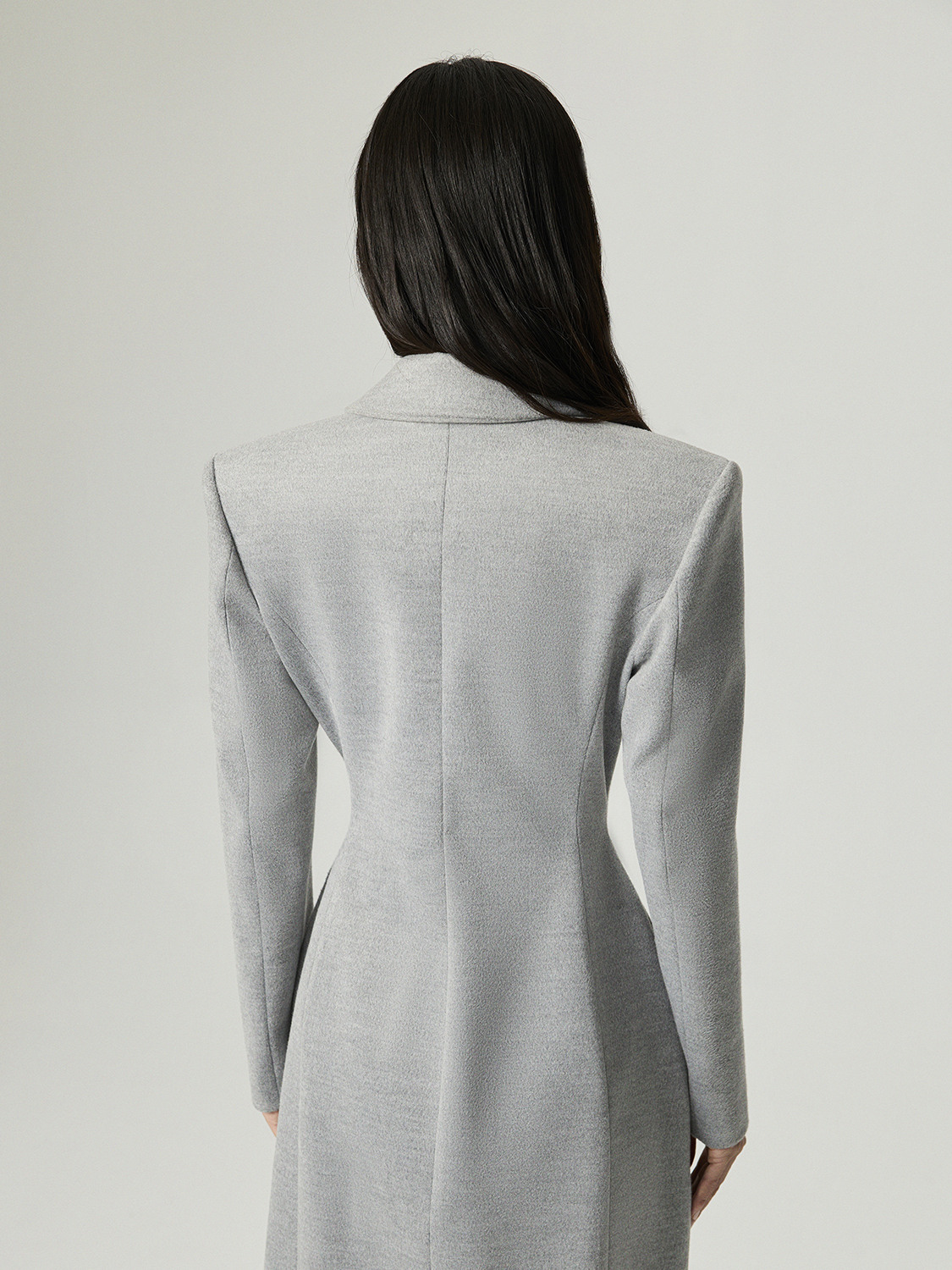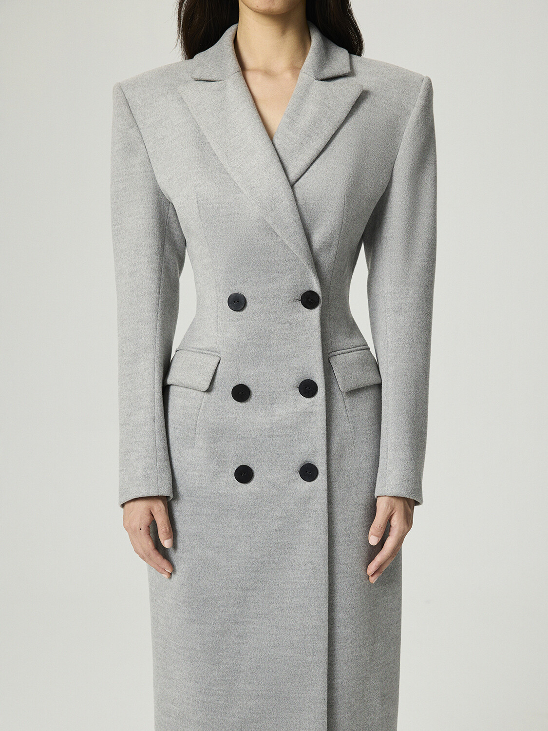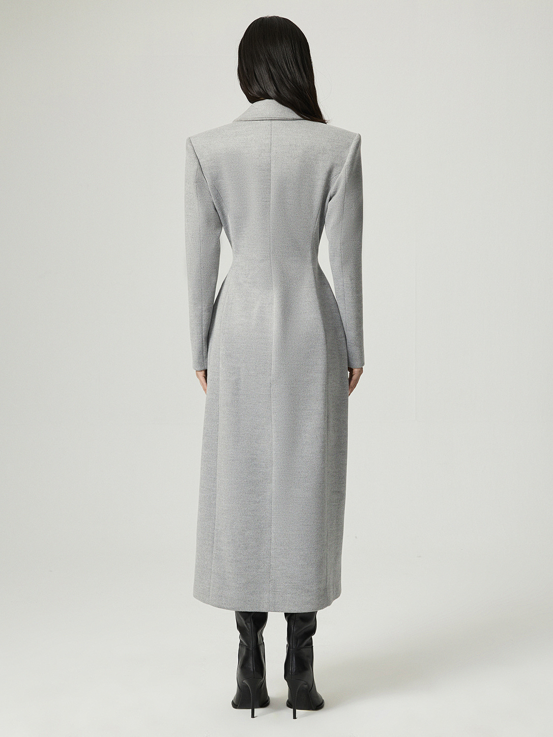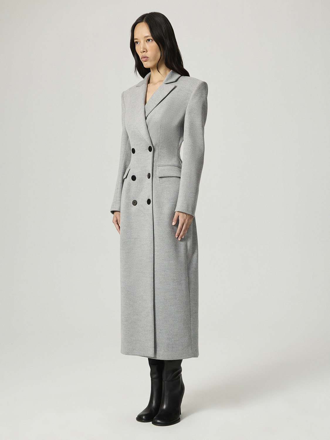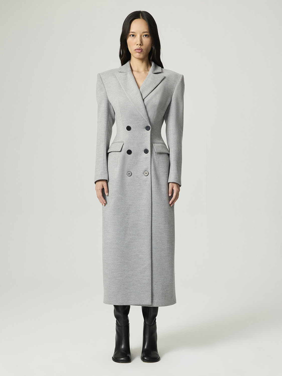 Çağdaş bir yapıyla öne çıkan zamansız bir dış giyim parçası olan bu kruvaze maksi ceket, keskin dolgulu omuzları ve belirgin bel yapısıyla, vücuda tam oturan kesimde üretilmiştir. Sivri yaka, uzun kollar ve kapaklı ceplere sahip olan bu kaban, konfor ve sıcaklık için tamamen astarlıdır. Bilek hizasındaki tasarımı, hem resmi hem de günlük kışlık kıyafetlerin üzerine giyilebilecek iddialı bir katman haline getirerek, şıklığı amaçlı bir şekilde sunar.