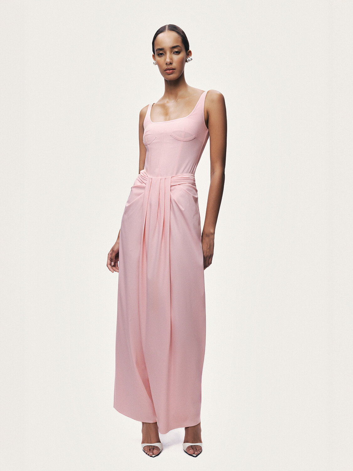 Slim fit kesimiyle vücuda kusursuz şekilde oturan bu body, astarsız dokuma yapısıyla hafif ve konforludur. Kolsuz tasarımı ve geniş yakası feminen bir duruş sunarken, balen detayları silueti vurgulayarak modele güçlü ve şık bir karakter kazandırır. İnce gizli fermuar kapamasıyla temiz bir görünüm sunan bu parça, modern ve iddialı kombinlerin tamamlayıcısıdır.