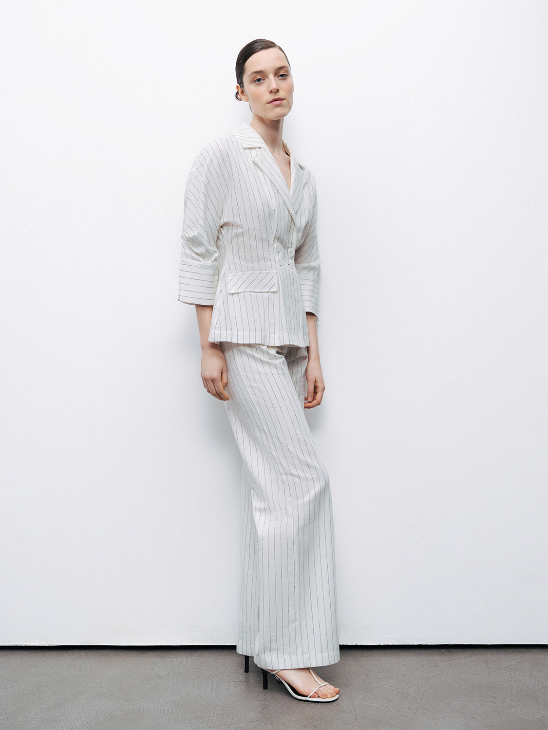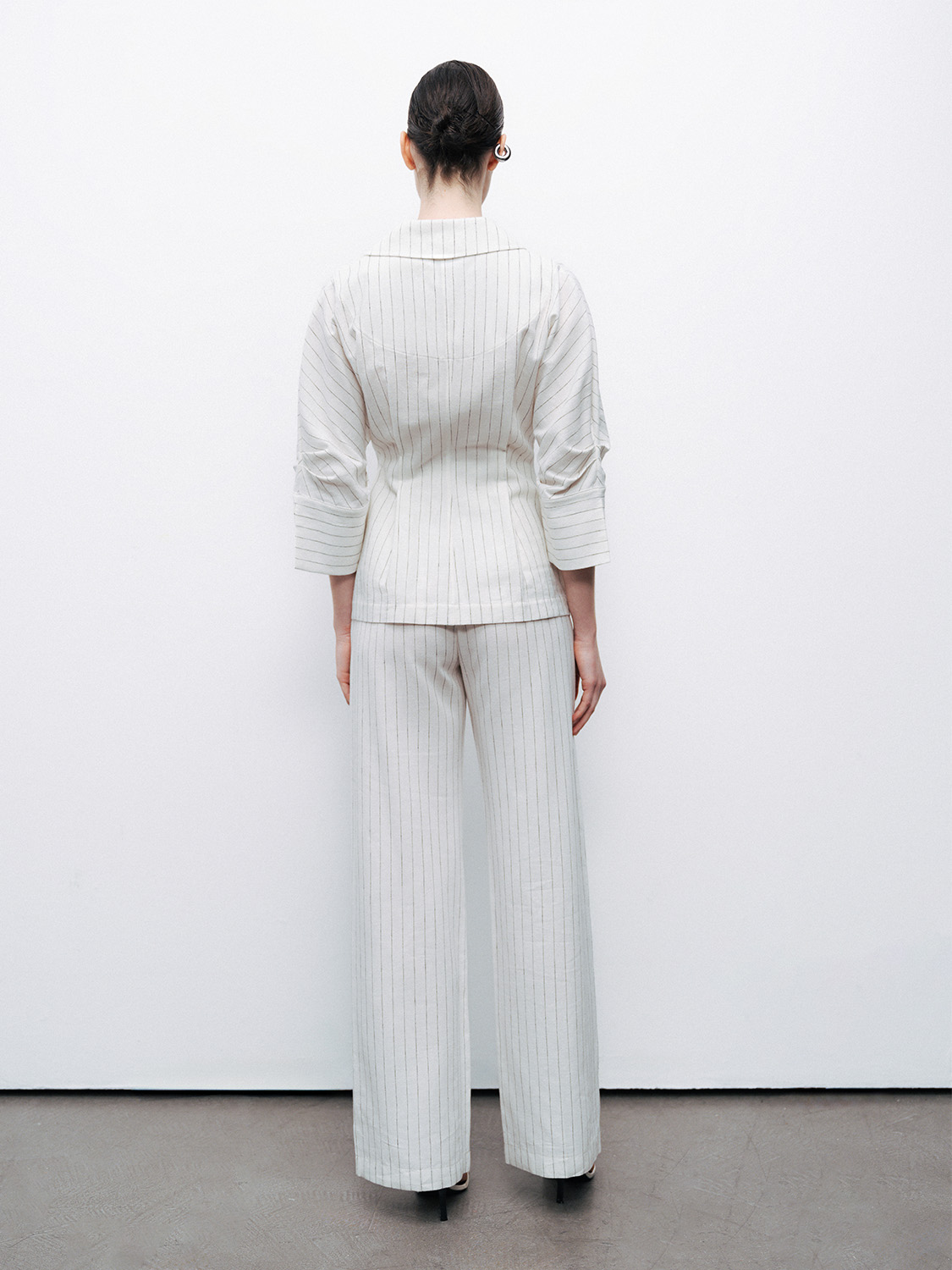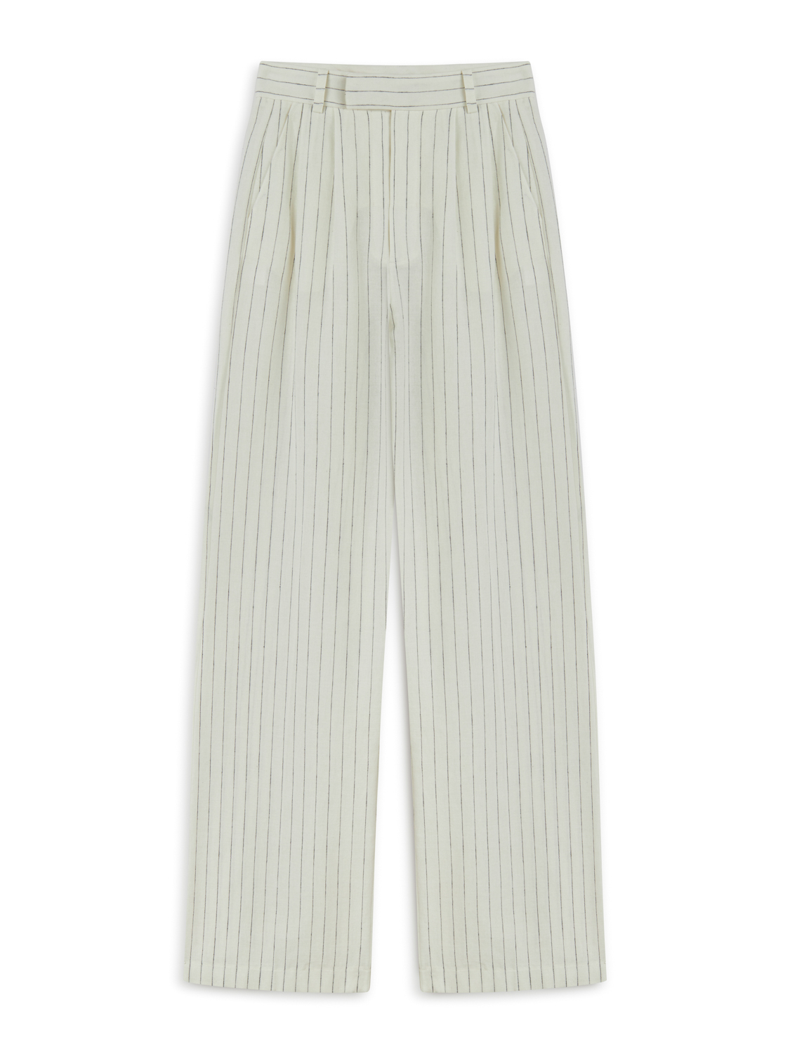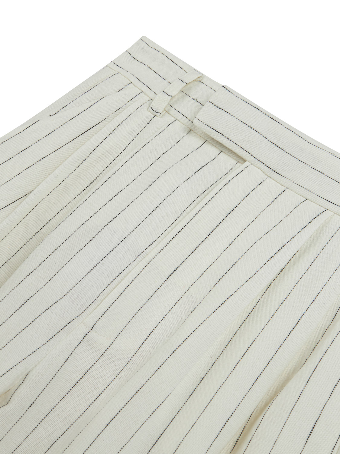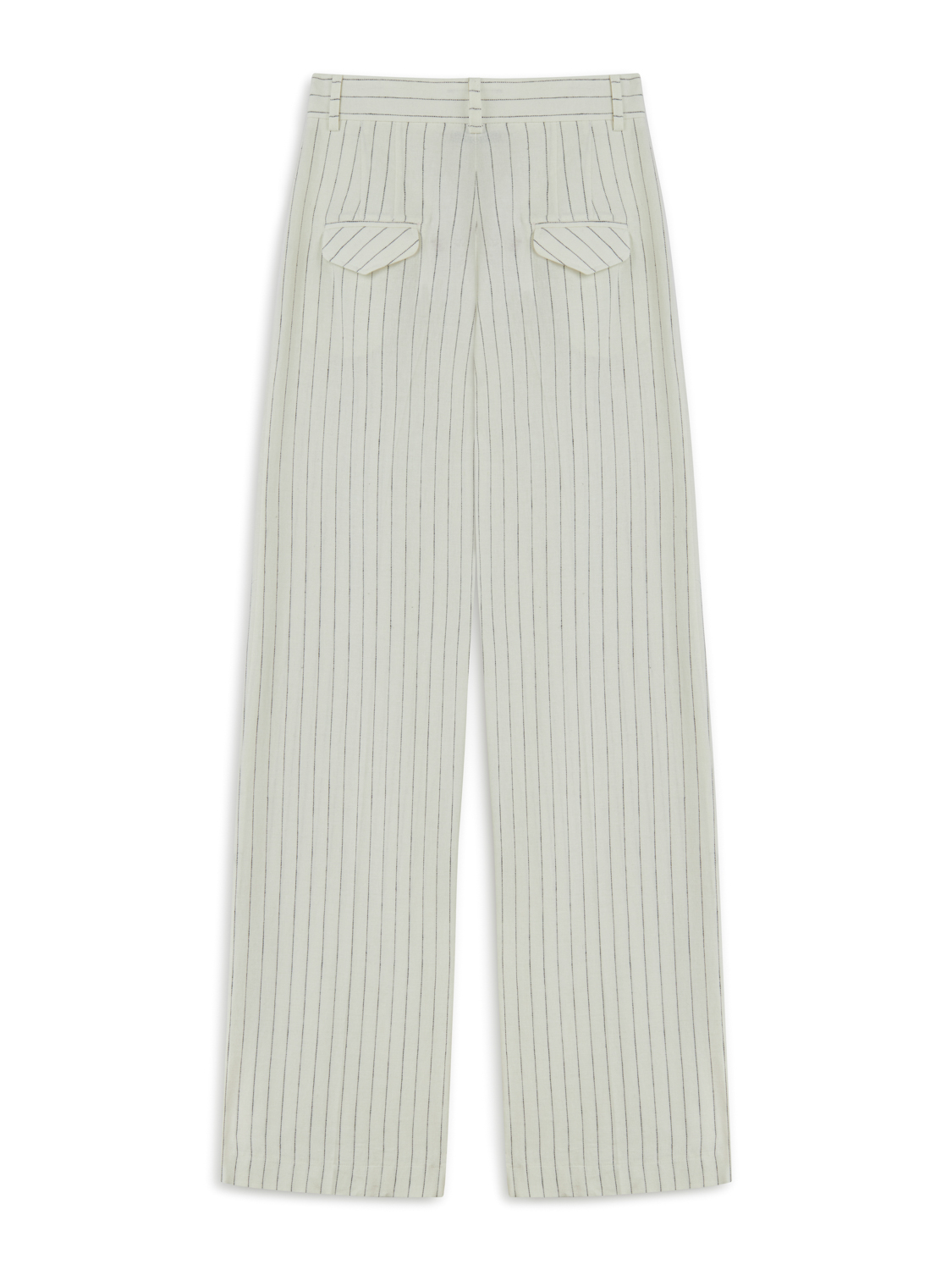Ürün Açıklaması: Relaxed fit, tam kalıp, astarsız, gizli agraf ve fermuar kapamalı, yan cepli ve arkada işlevsiz kapaklı fileto cepli, yüksek bel, çift pileli, çizgili keten pantolon