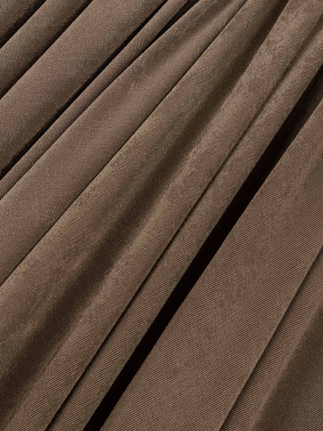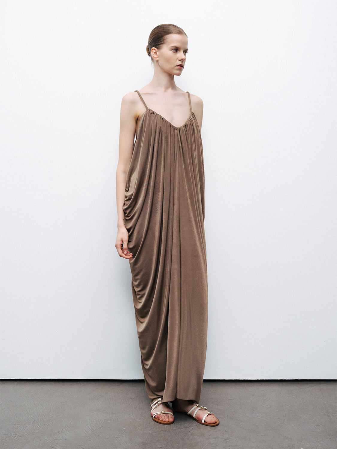 Ürün Açıklaması: Relaxed fit, tam kalıp, astarsız, örme, V yaka, ince ip askılı, yakadan drape detaylı dökümlü maxi boy elbise