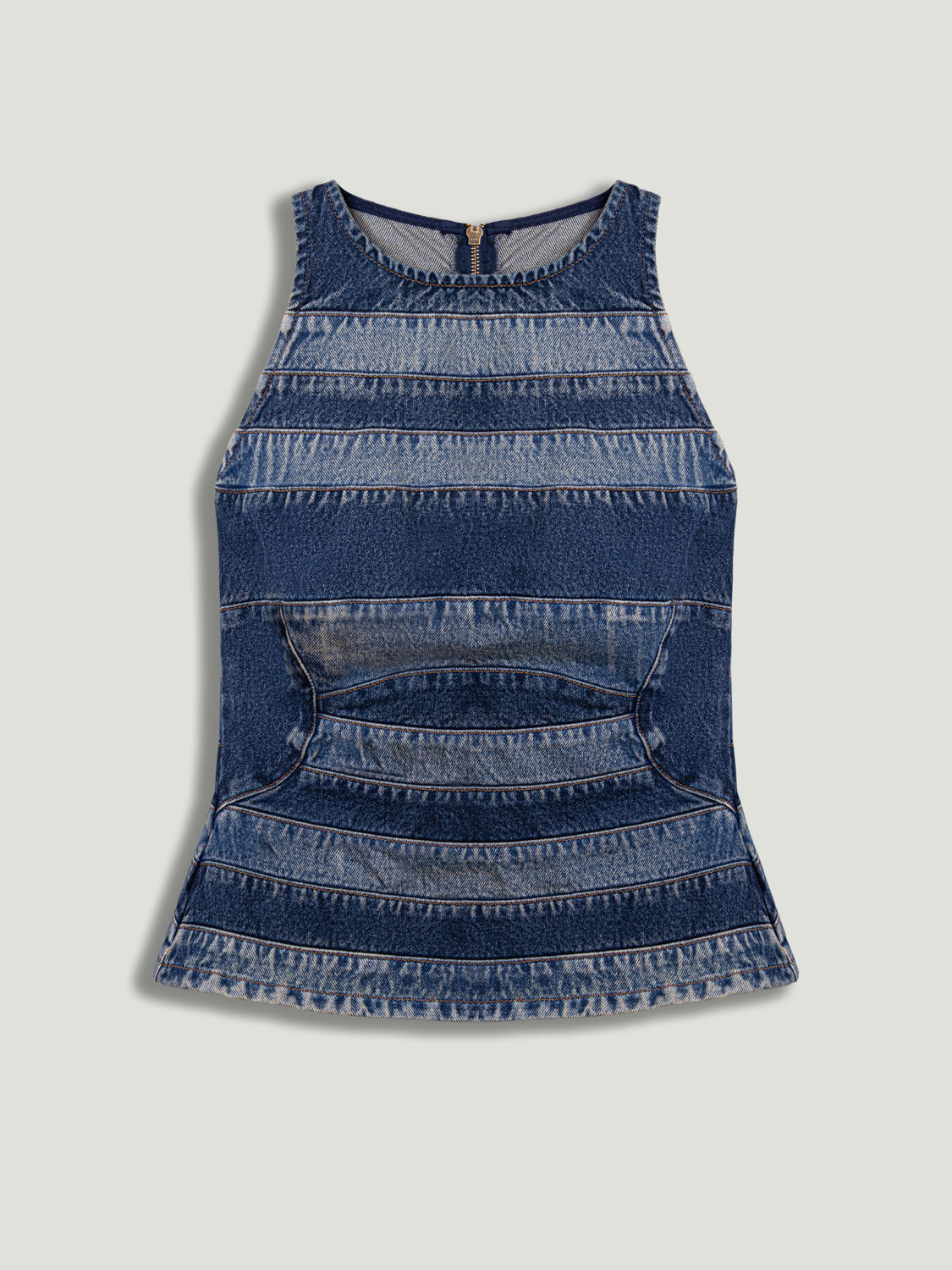 Slim fit kesimiyle vücuda oturan bu denim bluz, astarsız dokuma yapısıyla hafif ve rahat bir kullanım sunar. Kolsuz tasarımı ve halter yakası feminen bir duruş kazandırırken, metal fermuar kapaması modele modern ve şık bir dokunuş ekler. Günlük kombinlerden şehir stiline kadar stil sahibi bir parçadır.