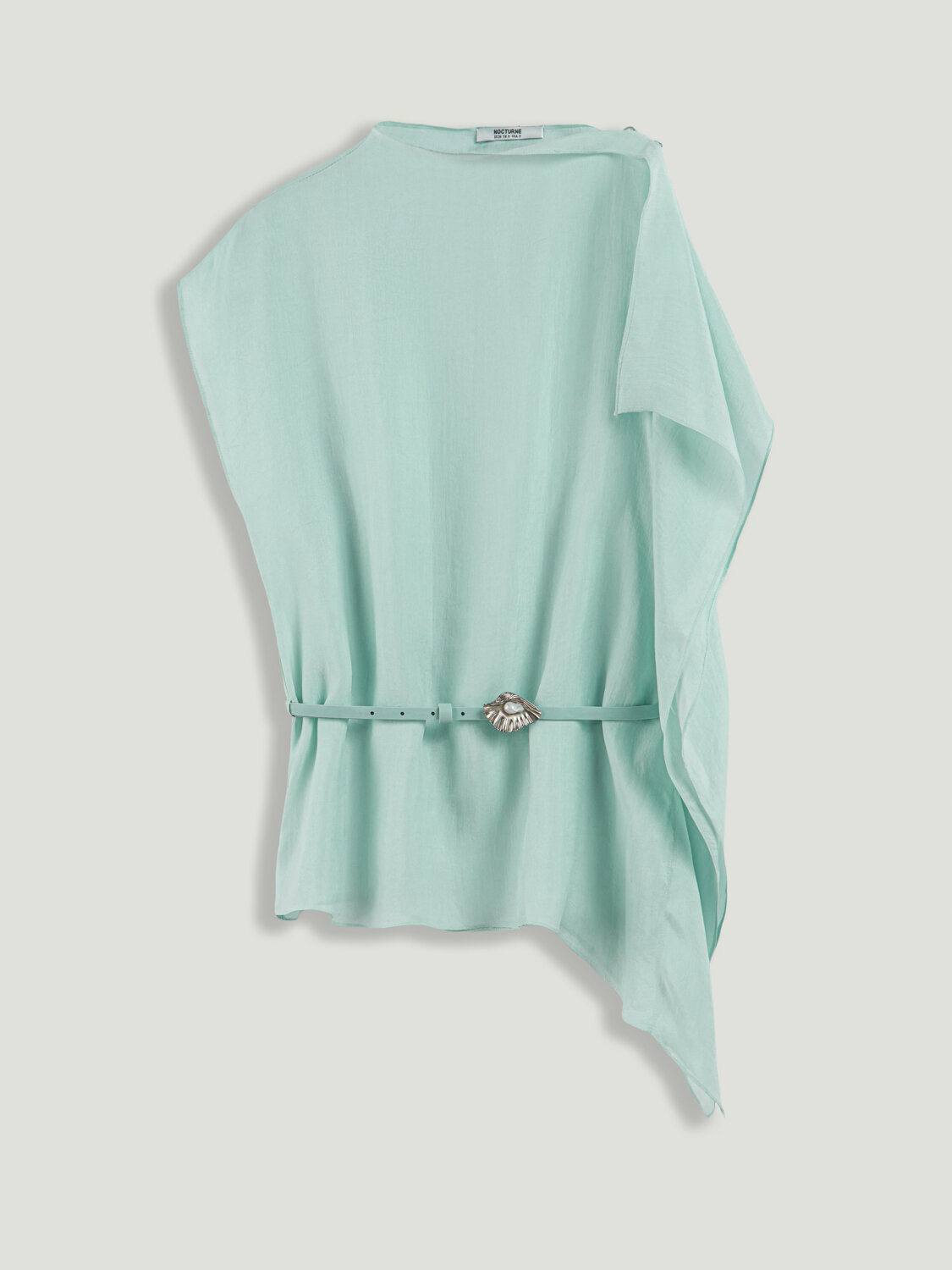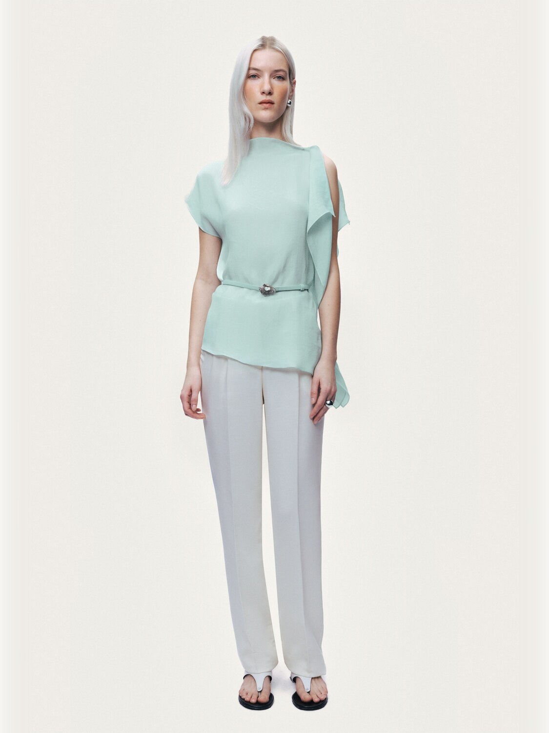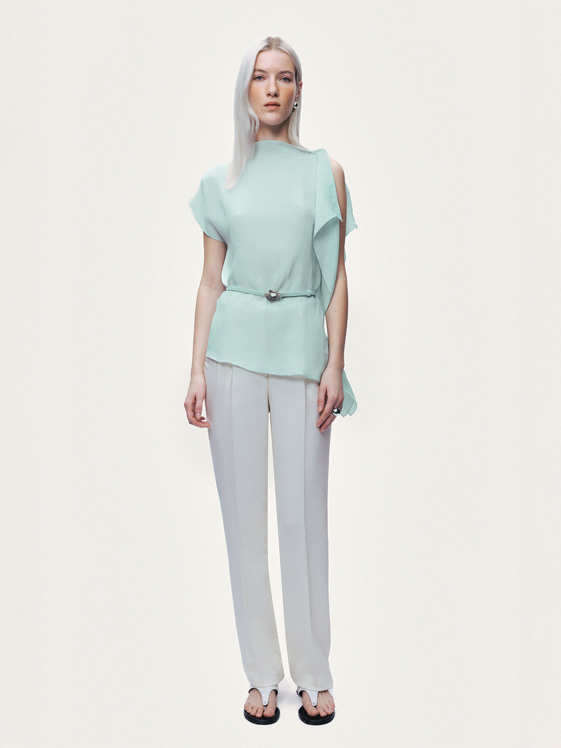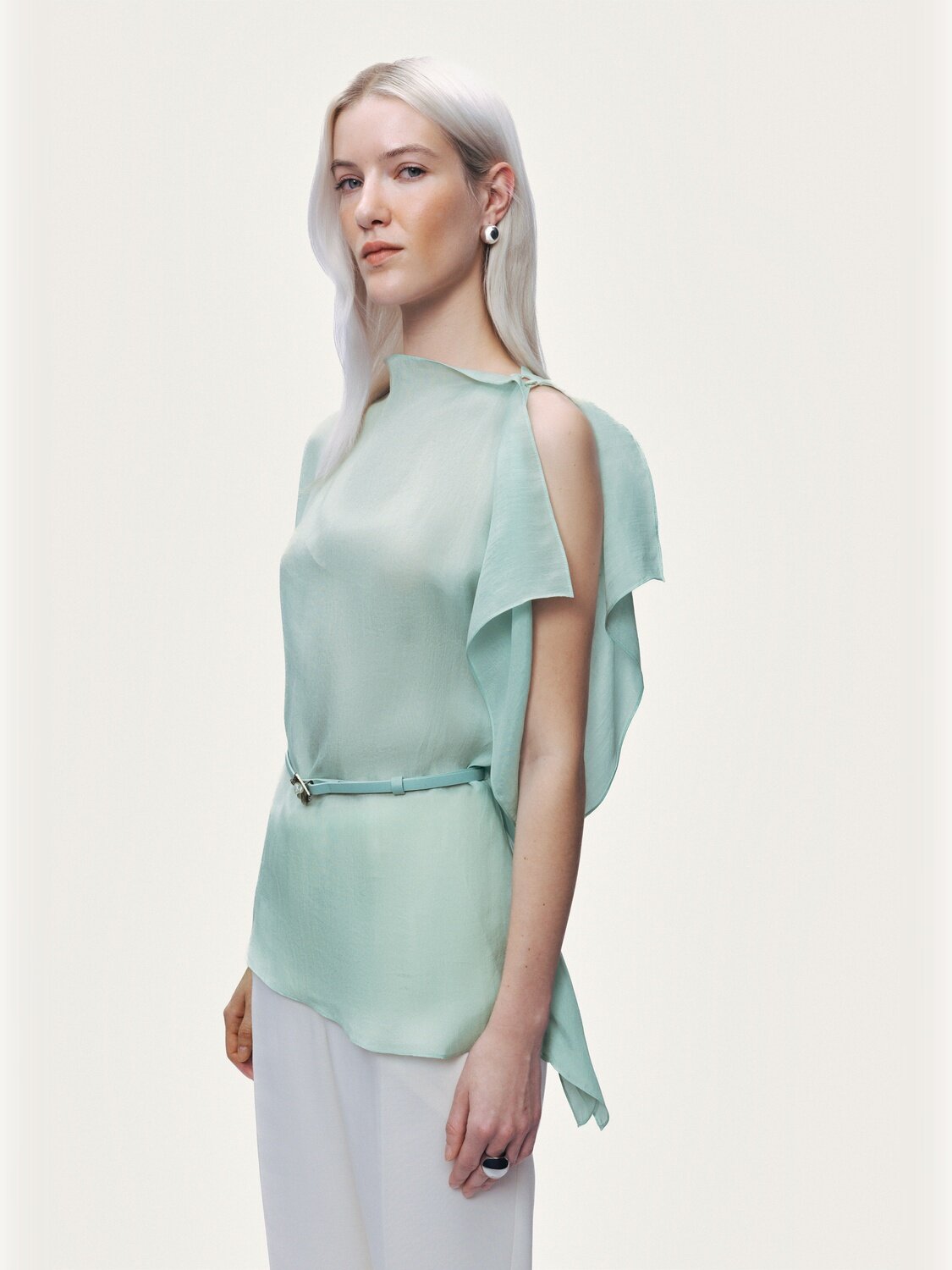 Regular fit kesimiyle dengeli bir siluet sunan bu bluz, astarsız dokuma yapısıyla hafif ve konforludur. Kolsuz tasarımı ve sıfır yakası sade bir duruş sağlarken, asimetrik kesimi ve kemer detayı modele modern ve dikkat çekici bir dokunuş katar. Günlükten şık kombinlere kadar stilinizi tamamlayan güçlü bir parçadır.
