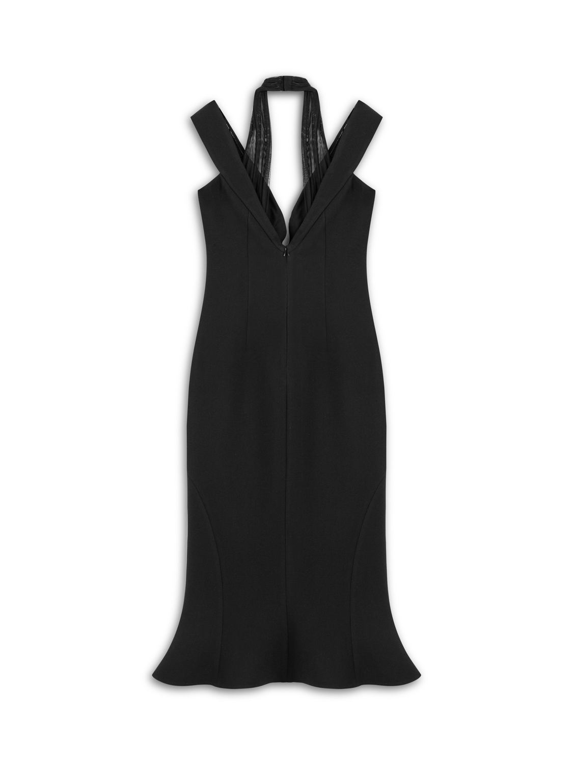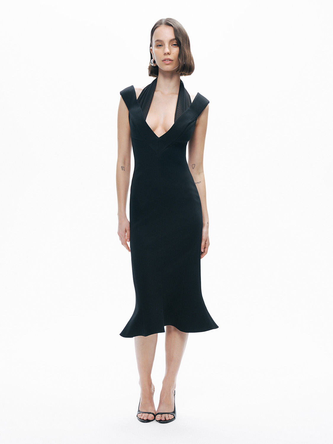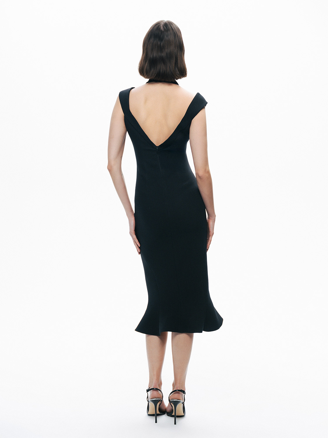 Ürün Açıklaması: Slim fit, tam kalıp, astarlı, garnili, dokuma, kolsuz, ince gizli fermuar kapamalı, düşük omuzlu, boyundan çıtçıt kapamalı, derin v yakalı, şifon detaylı midi boy elbise
