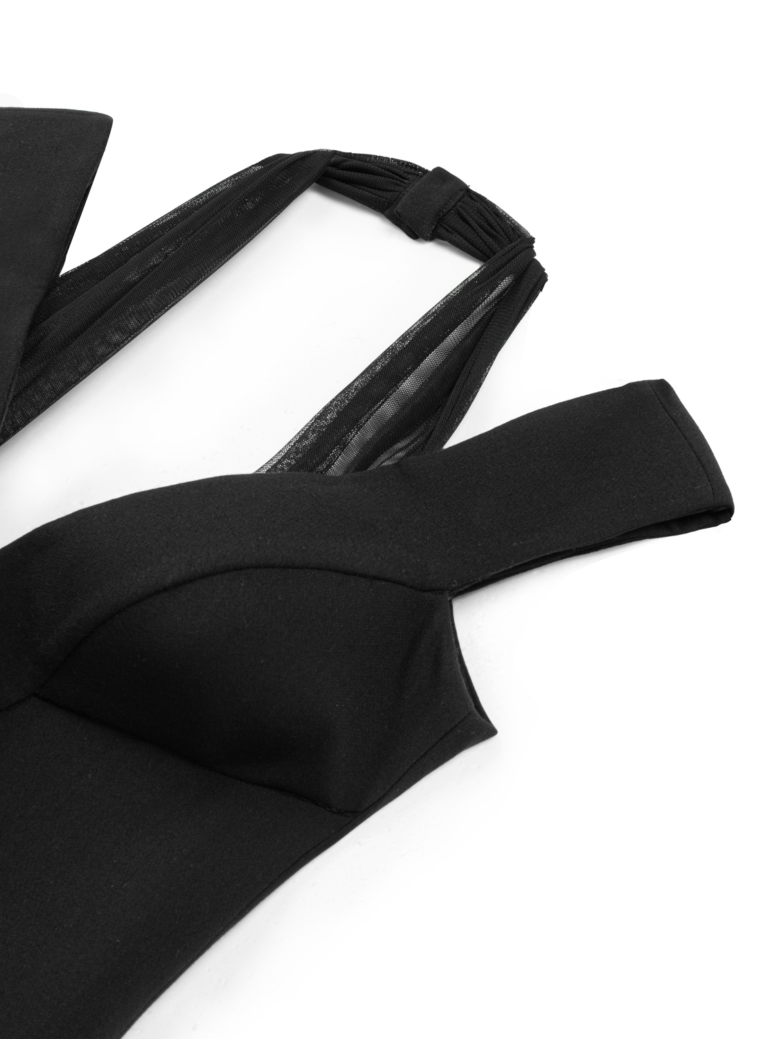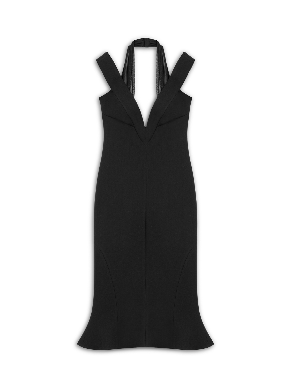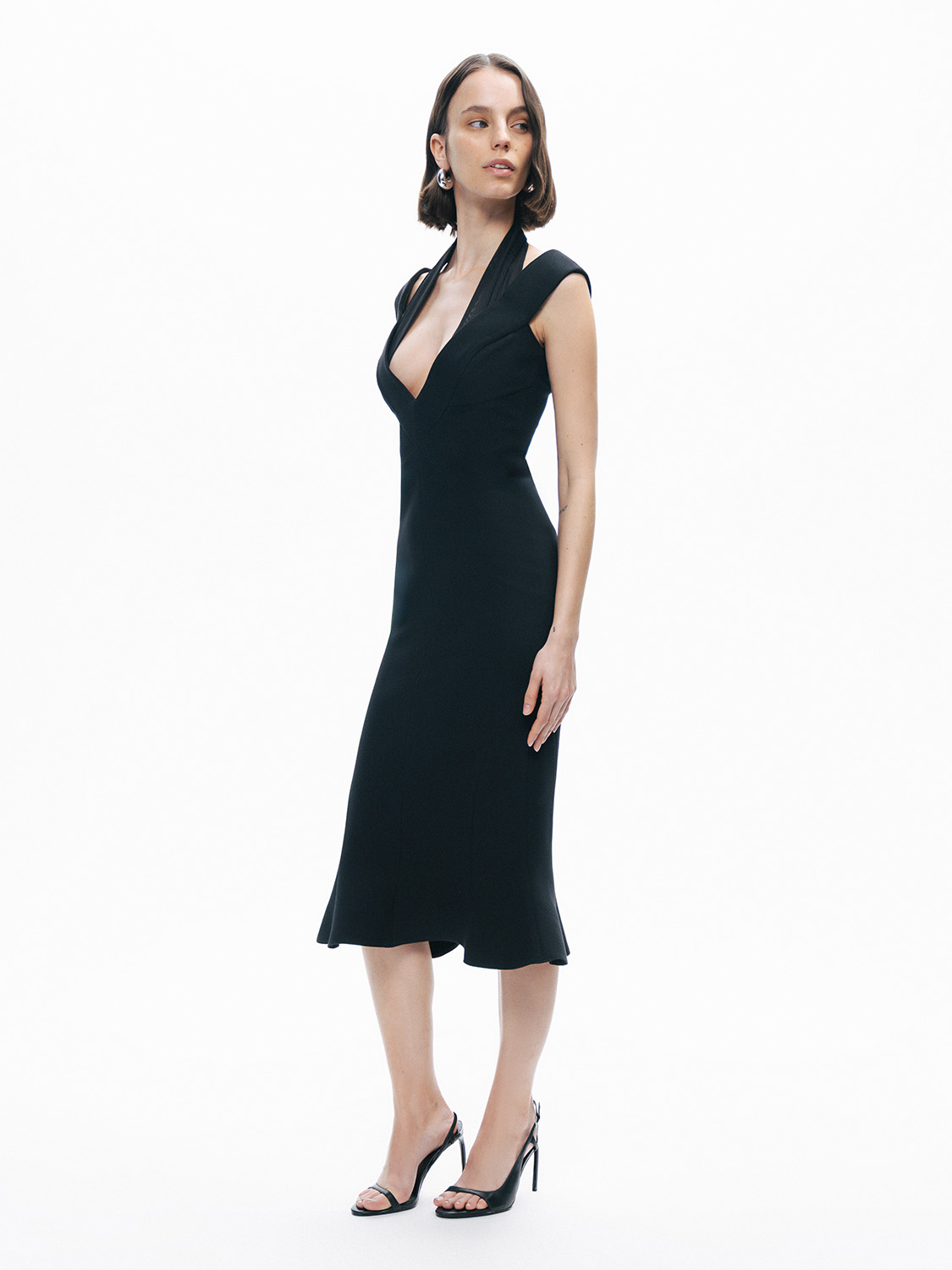 Ürün Açıklaması: Slim fit, tam kalıp, astarlı, garnili, dokuma, kolsuz, ince gizli fermuar kapamalı, düşük omuzlu, boyundan çıtçıt kapamalı, derin v yakalı, şifon detaylı midi boy elbise