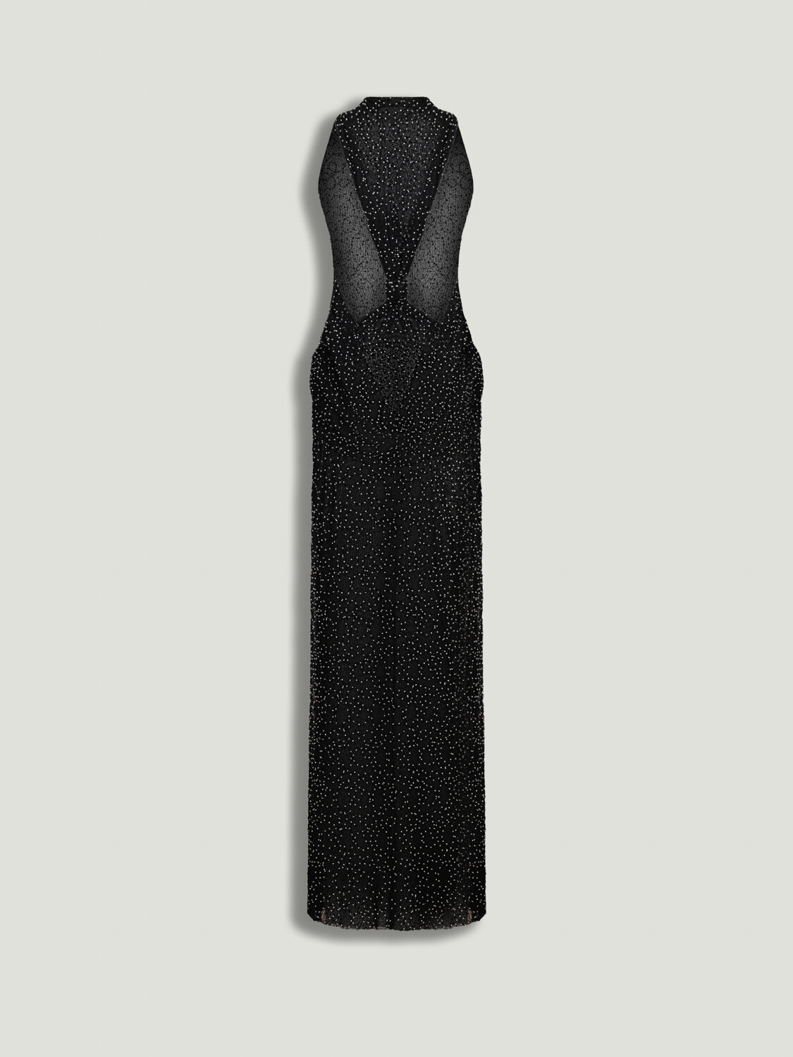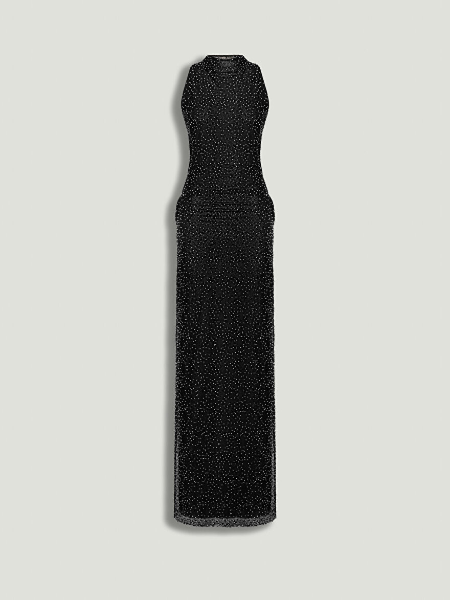 Slim fit kesimiyle vücuda zarifçe oturan bu maxi elbise, astarlı dokuma yapısıyla konforlu bir kullanım sunar. Kolsuz tasarımı ve dik yakası modern bir duruş kazandırırken, sırt dekoltesi feminen bir dokunuş katar. Taş işlemeleriyle dikkat çeken bu parça, özel davetlerde şık ve iddialı bir görünüm sunar.